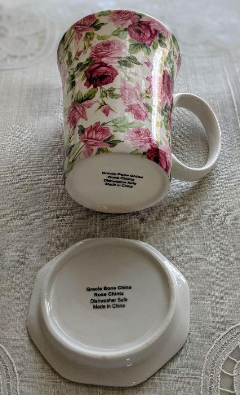 Lot 165 s Gracie Bone china mug and coaster/lid Rose Chintz Pinks