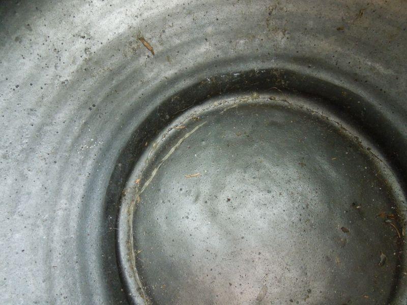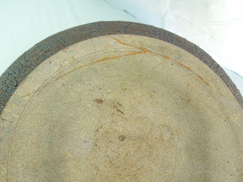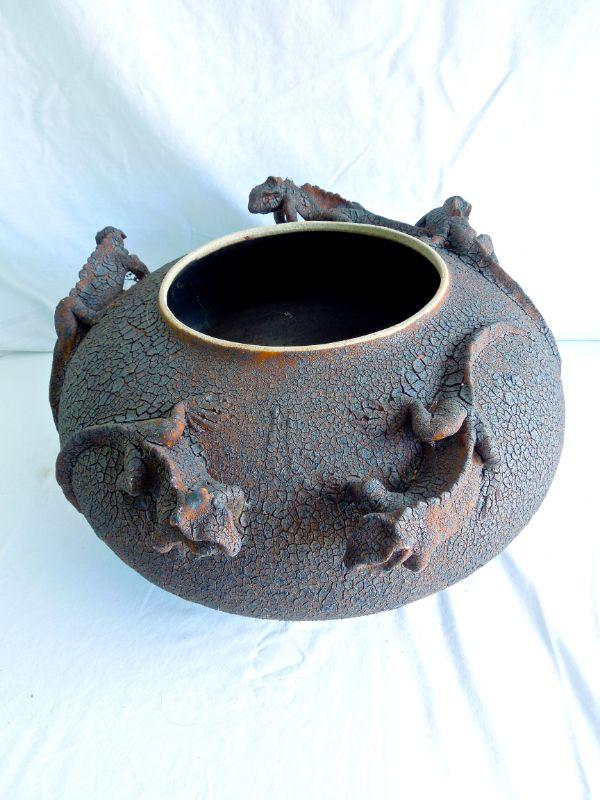 Handthrown and decorated ovoid pot with texturied brown and black wood fired "raku" crackle glaze over stoneware. Adorned with five hand built Komoto Dragon lizards. Cannot determine name of artist. 17" wide. The back of one dragon has been chipped and there are two 6" repaired cracks on bottom. Needs cleaning. Date of production unknown. Later 20th Century.