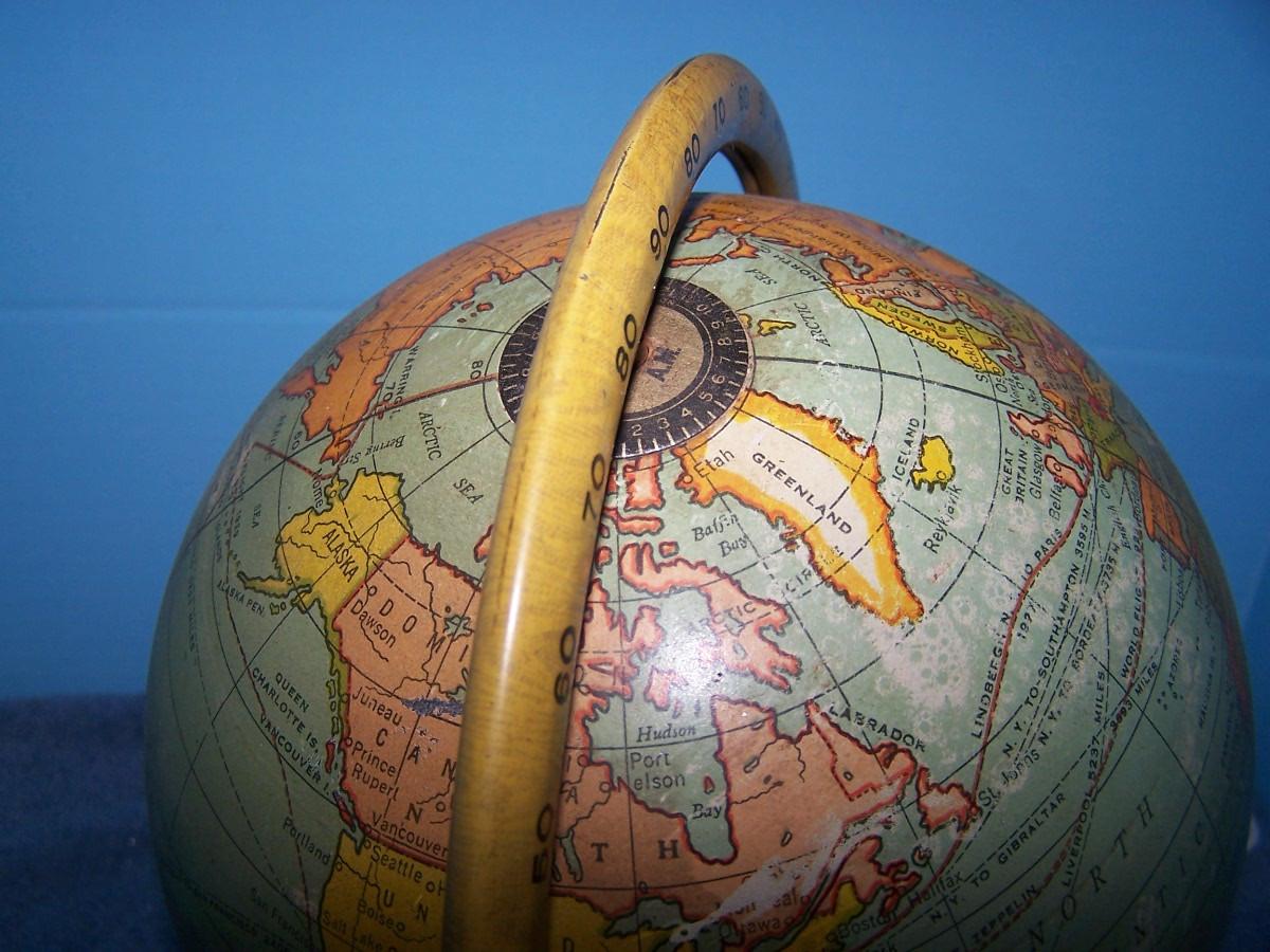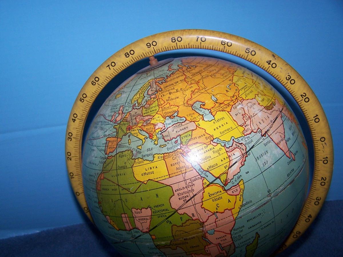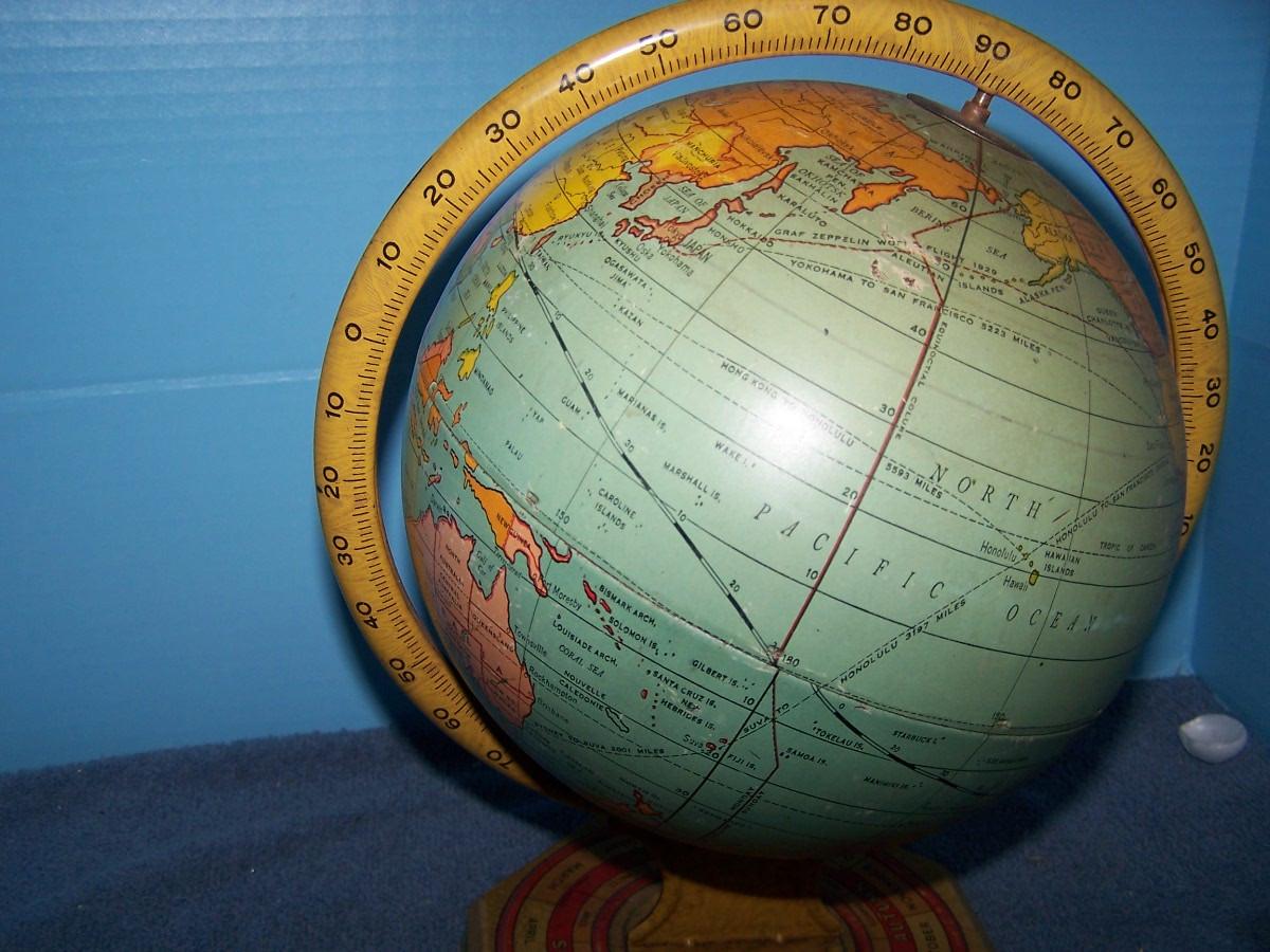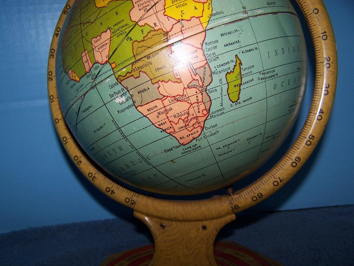 THIS IS A SPECIAL VINTAGE TIN LITHO SCHOLASTIC SCHOOL GLOBE 1930/31!!! VERY DETAILED! 12'' TALL. SEVERAL SMALL DENTS/RUBS, LIGHT WEAR..
