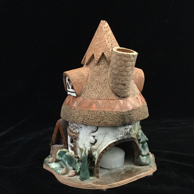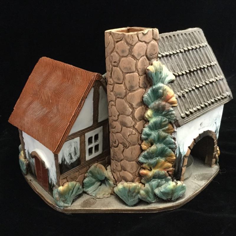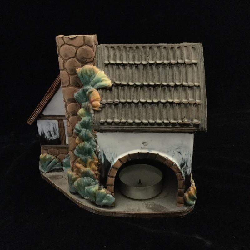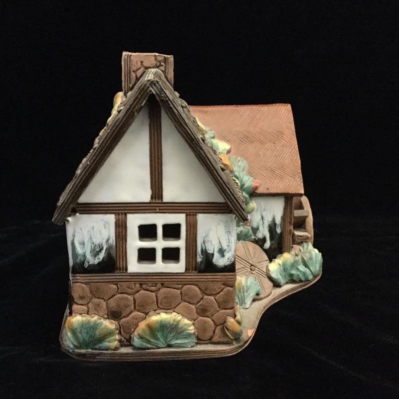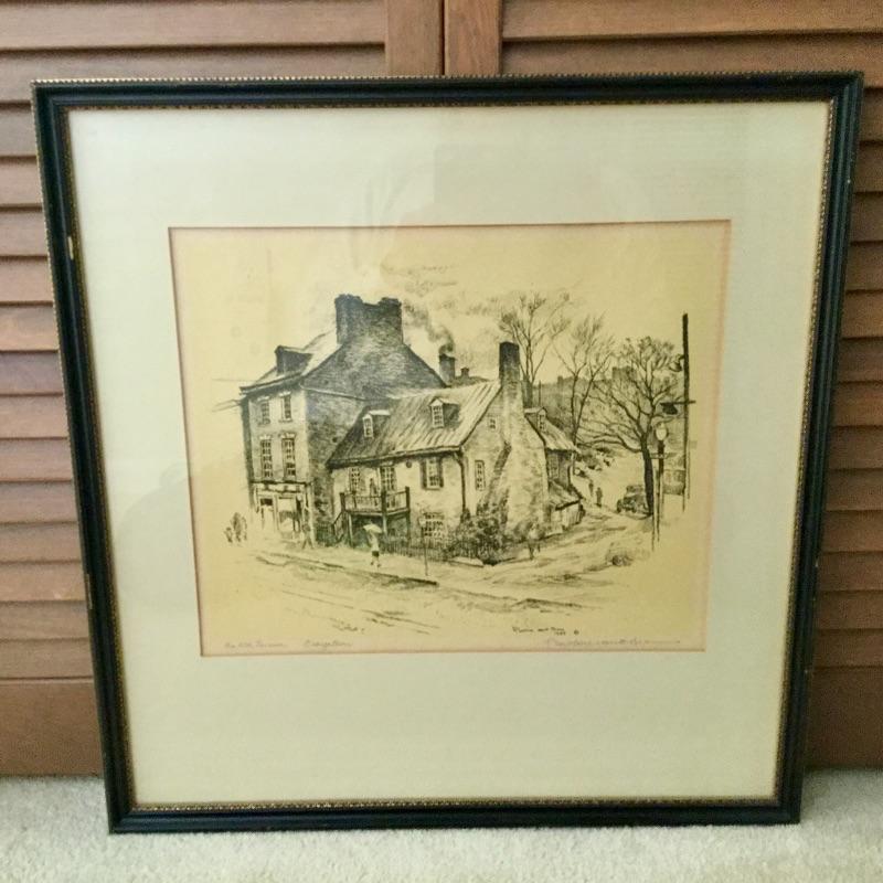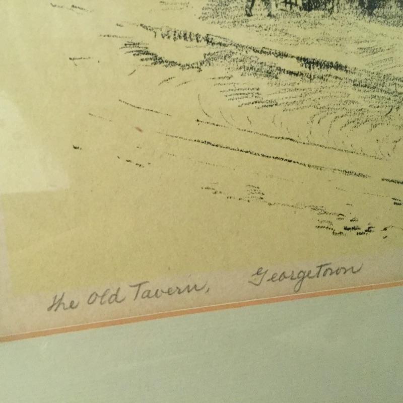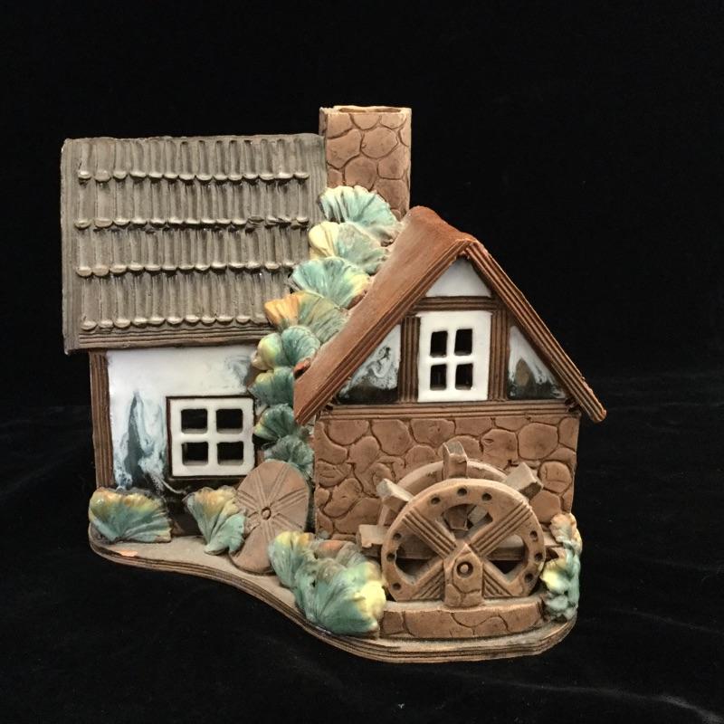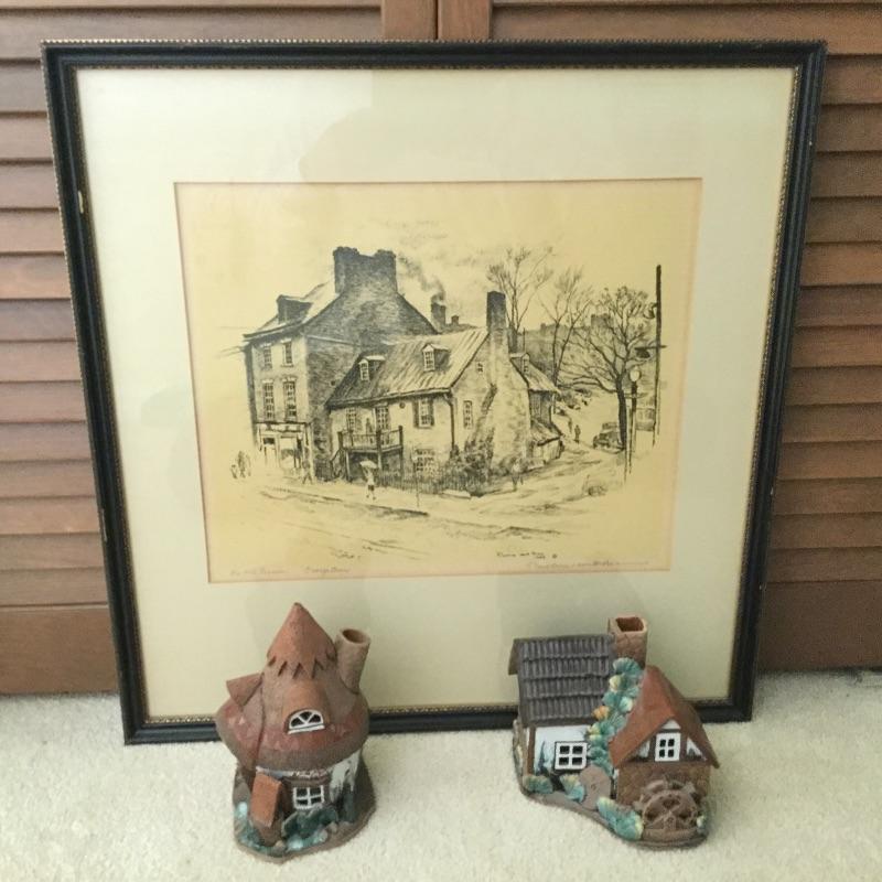 This Decorative lot includes a professionally Framed and signed by Artist Print of “ The Old Tavern “ Georgetown. A Handmade glazed clay figure of a Wheelhouse and a Round Cottage Handmade Figurine both hold a votive Candle.