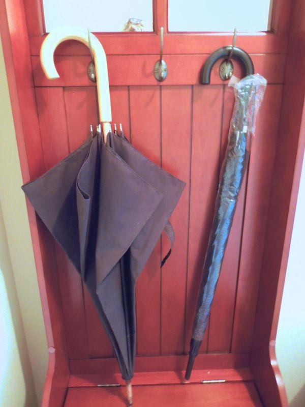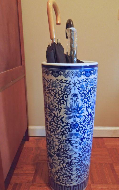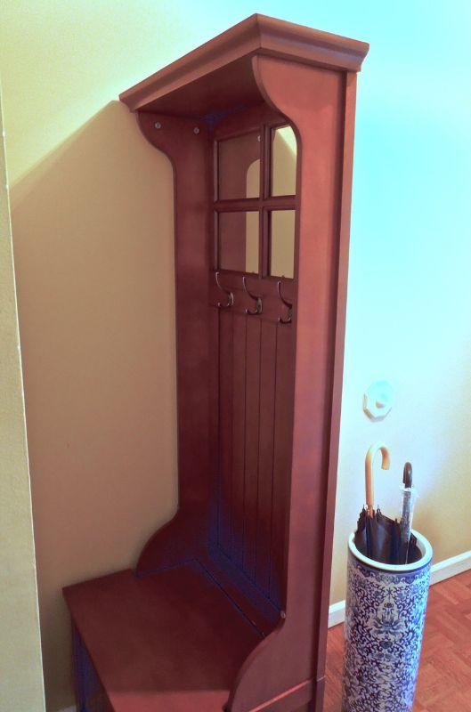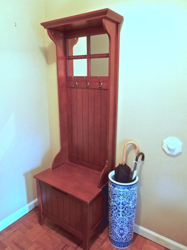 70 x 24 x 17 hall stand with brass hooks and mirror. Has storage bench. No scratches or dings. In addition you will get a sturdy ceramic cobalt blue and white umbrella stand with two black umbrellas.