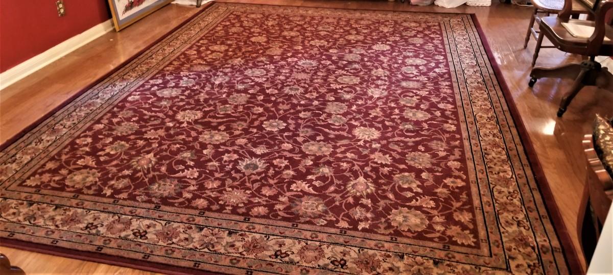 Nice room sized rug (9 feet, 3 inches x 12 ft, 11") in the traditional style, made by SHAW (label on reverse). Good used condition.