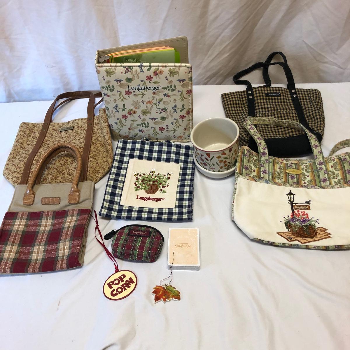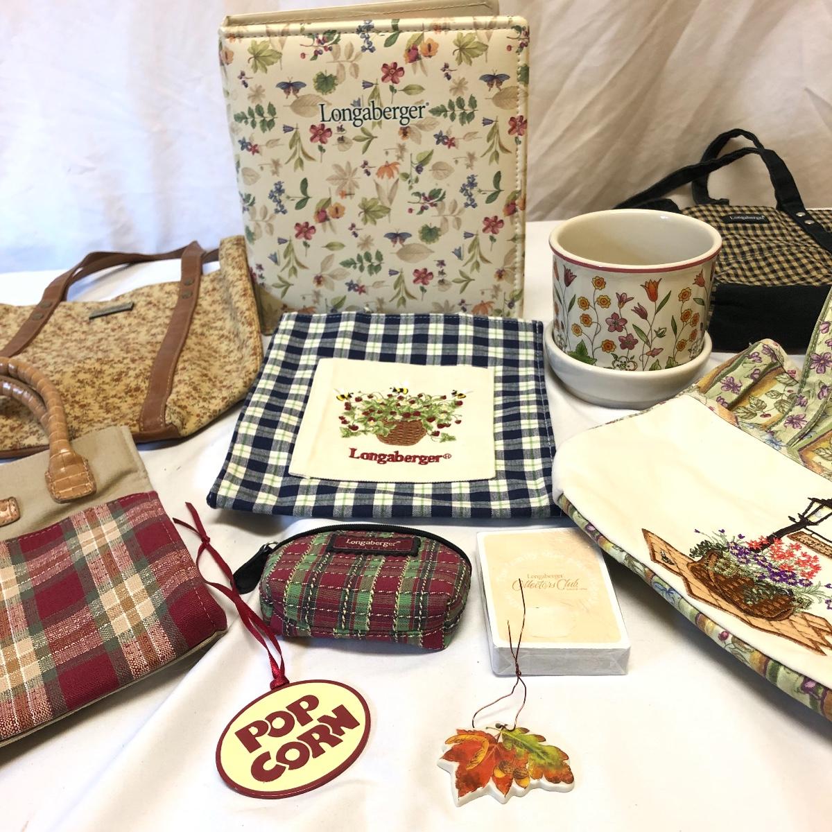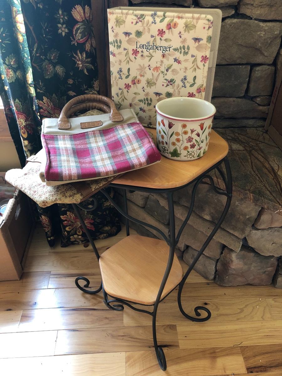 This lot is another Longaberger collection for you, yet this time it is all about accessories. (The other lots are baskets and are in lots 159, 169 & 189). Each of our four lots are different and this lot contains purses, a desktop organizer, ceramic plant pot, playing cards, wallet two small decor pieces and a tall slim metal/wood table (this was added later to the lot). Table measures 16” x 24.5”. They are all of course Longaberger with each purse having a badge and all other pieces showing the legendary name!