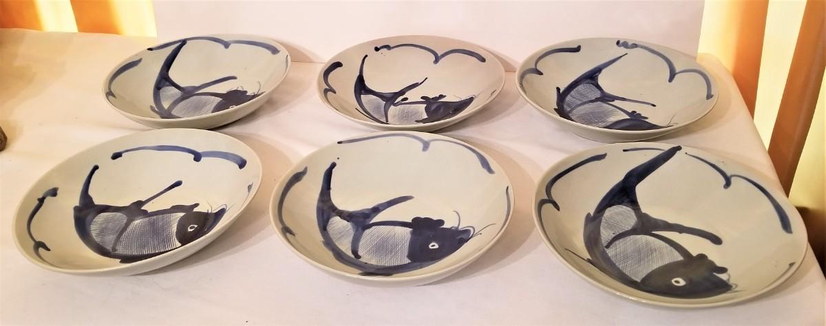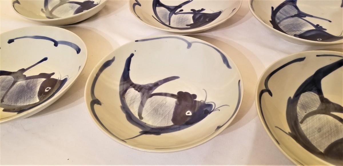 Nice lot of six matching stoneware gumby/soup bowls with a fish motif. Good condition, enough room for a generous portion, 9" across.