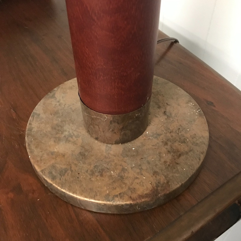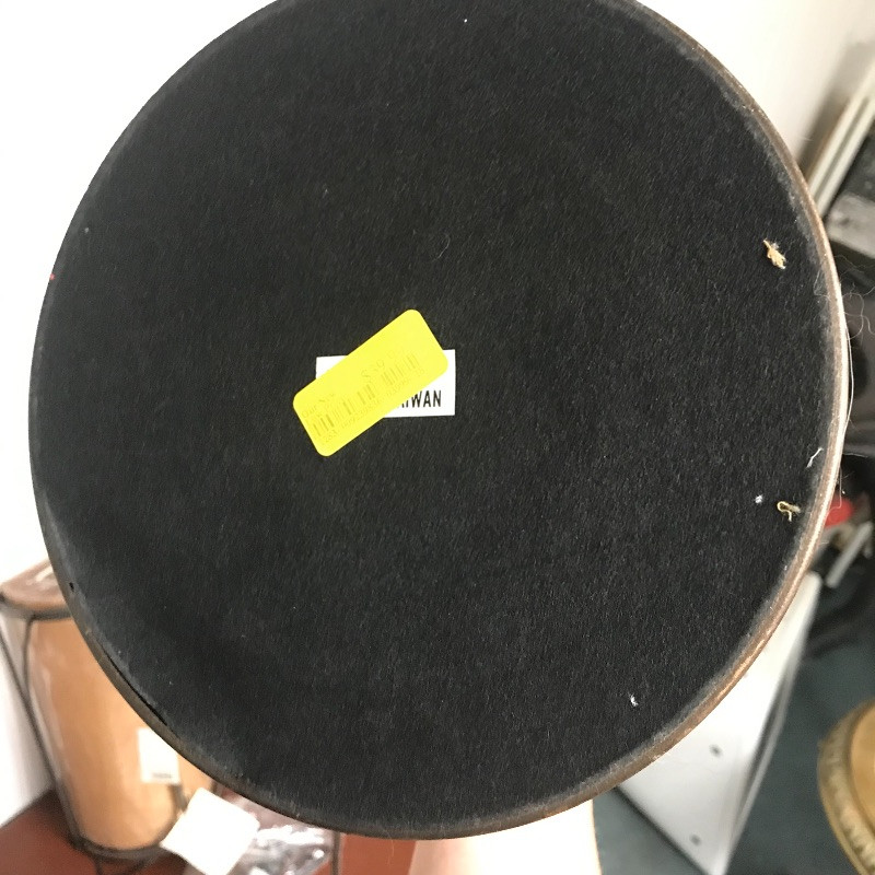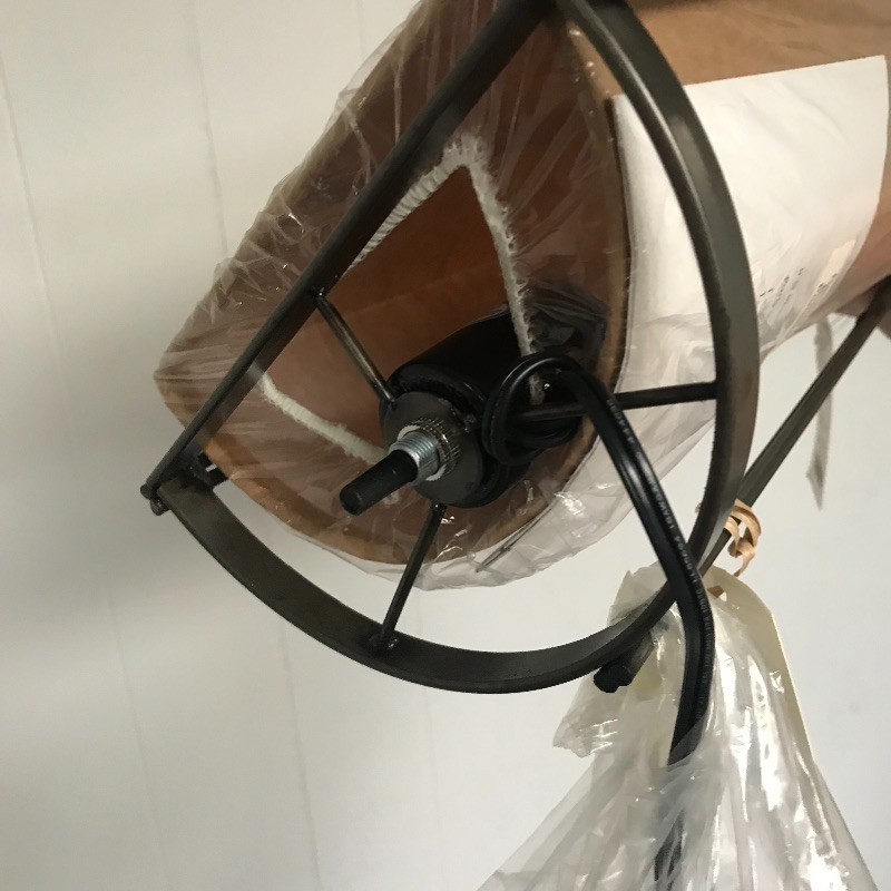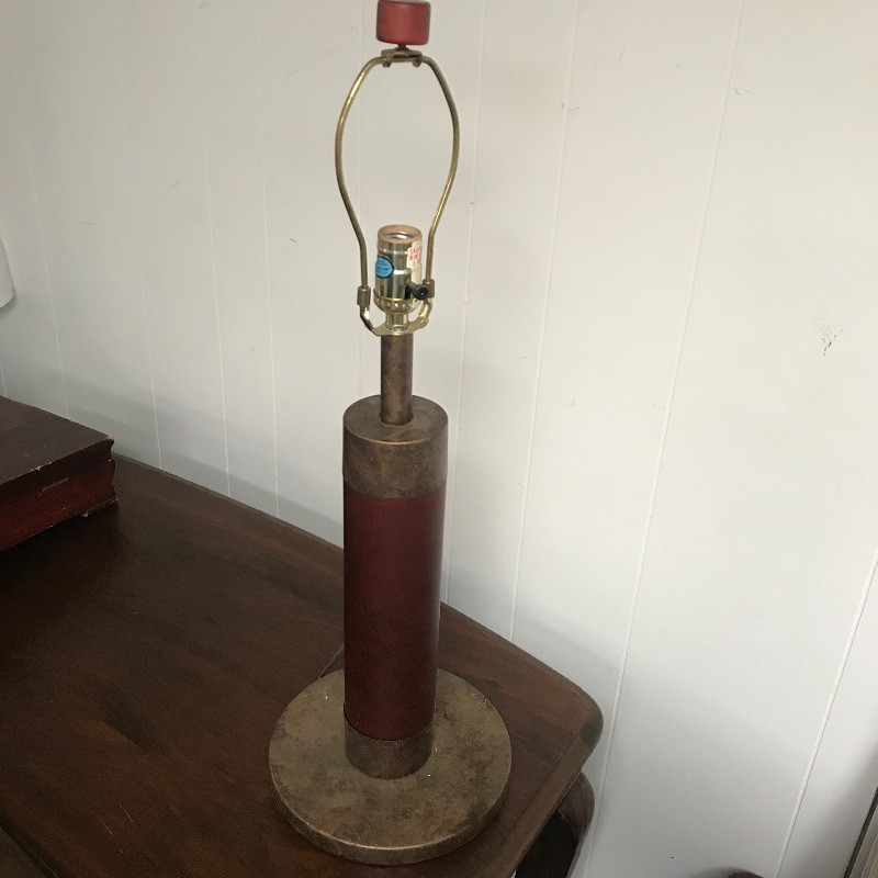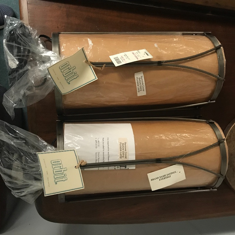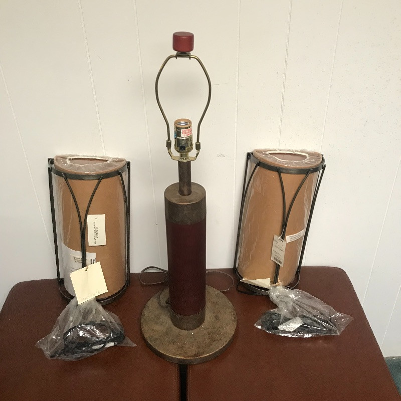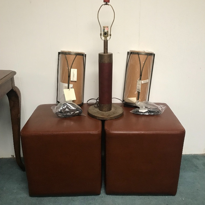 This collection of warm browns in like new decor contains two leather square stools or foot rests measuring 17.5” x7.5” 18”. Also in Lot is a pair of metal wall sconces with fabric shades that can be set on a table or possibly mounted. There are no brackets but it can be done. These each measure 14” x7” and are still in packaging. One last lamp that has wood and weathered bronze look to stands 27” tall. Local pick up only.