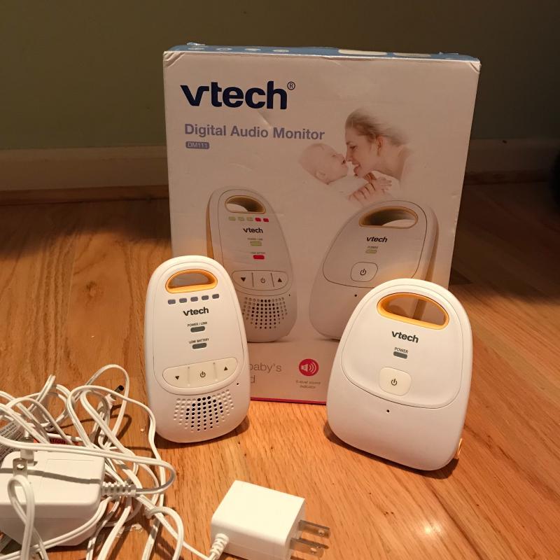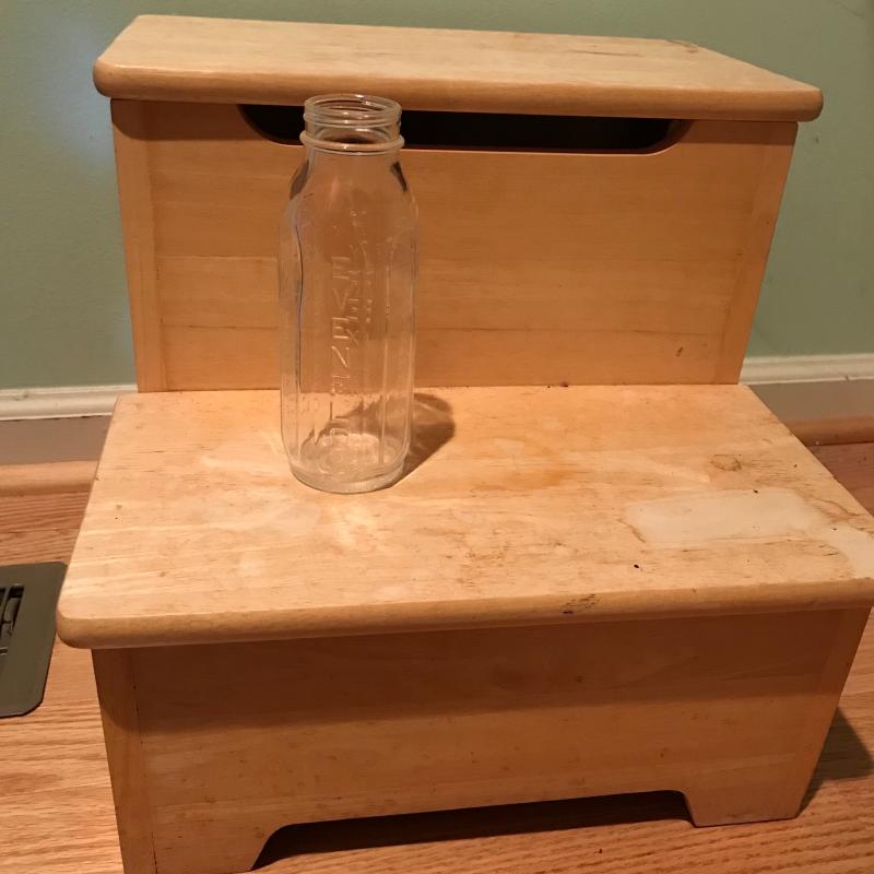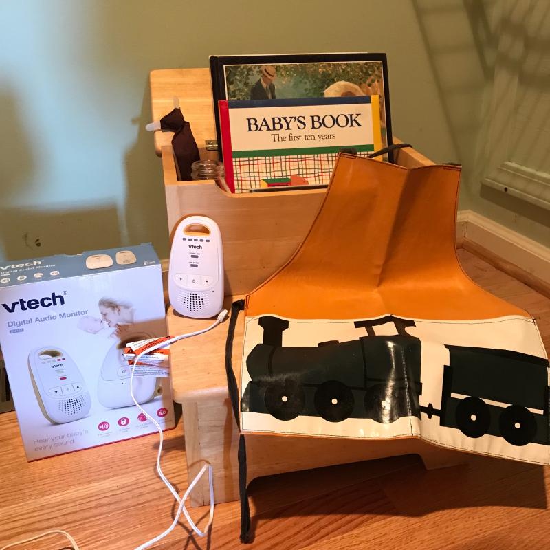 Fun necessities and accessories for anyone who knows a parent! Starting this collection off with a pine stool with hidden storage in the top step. Also a VTech audio monitor that worked when tested, one glass Pyrex Evenflo 8oz bottle, baby books for parents and grandparents. Lot also includes the most adorable apron you’ve ever seen with train pockets. Apron appears to be vinyl. Lastly we’ve thrown in a child’s clip-on tie for fun. No shipping.