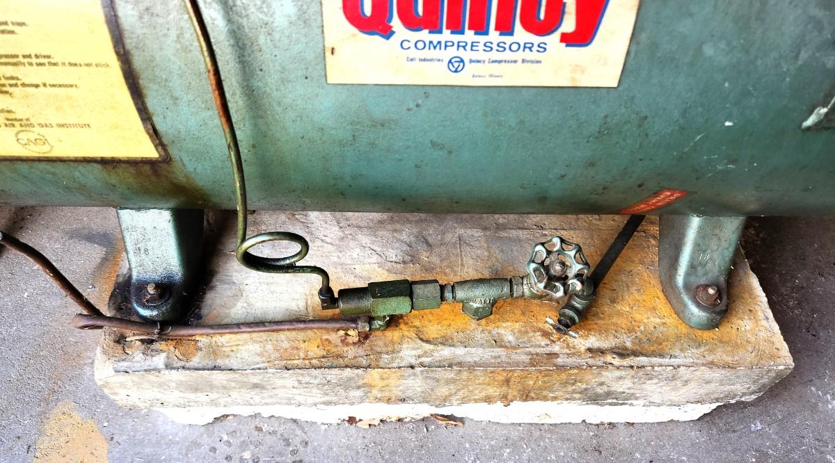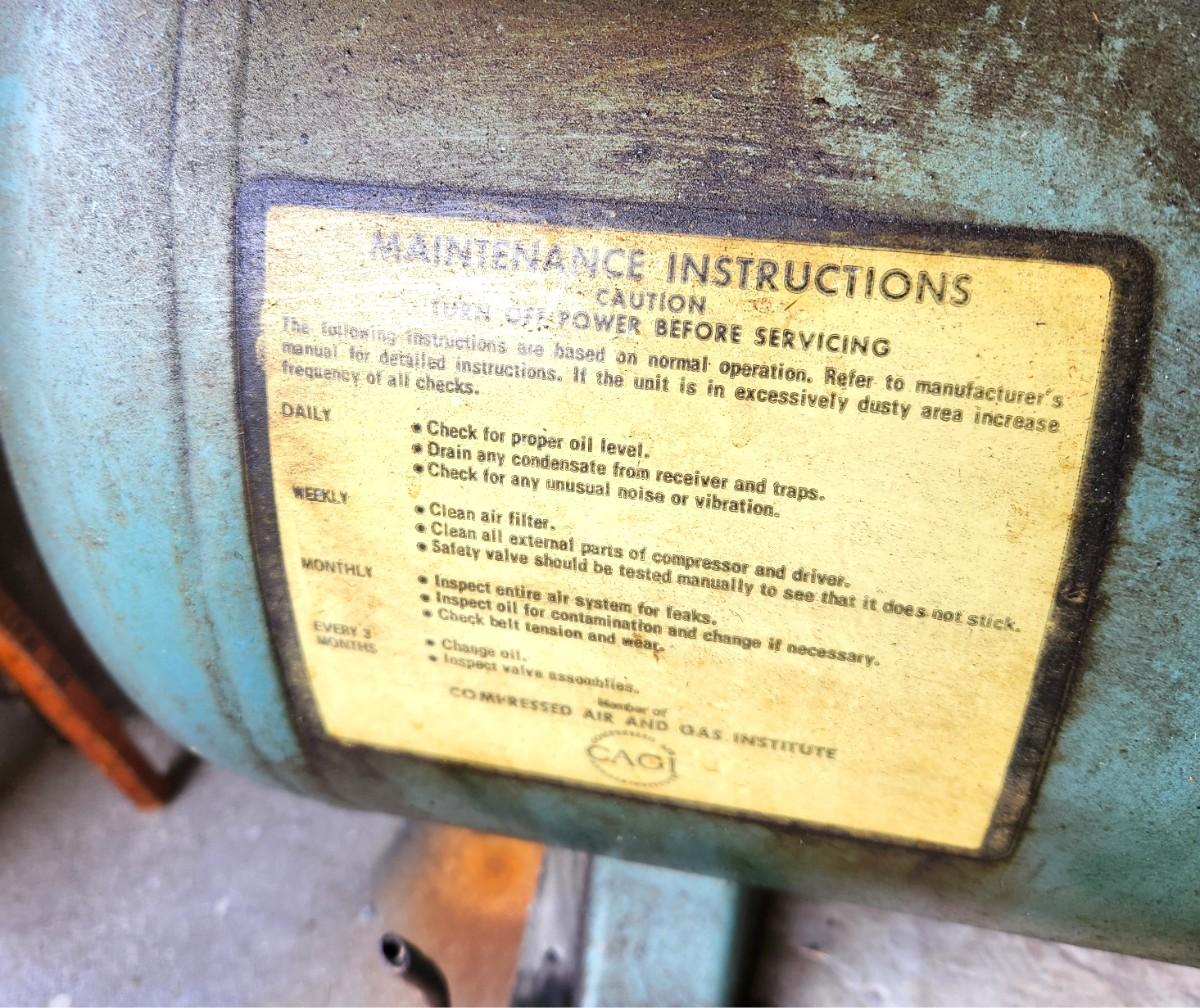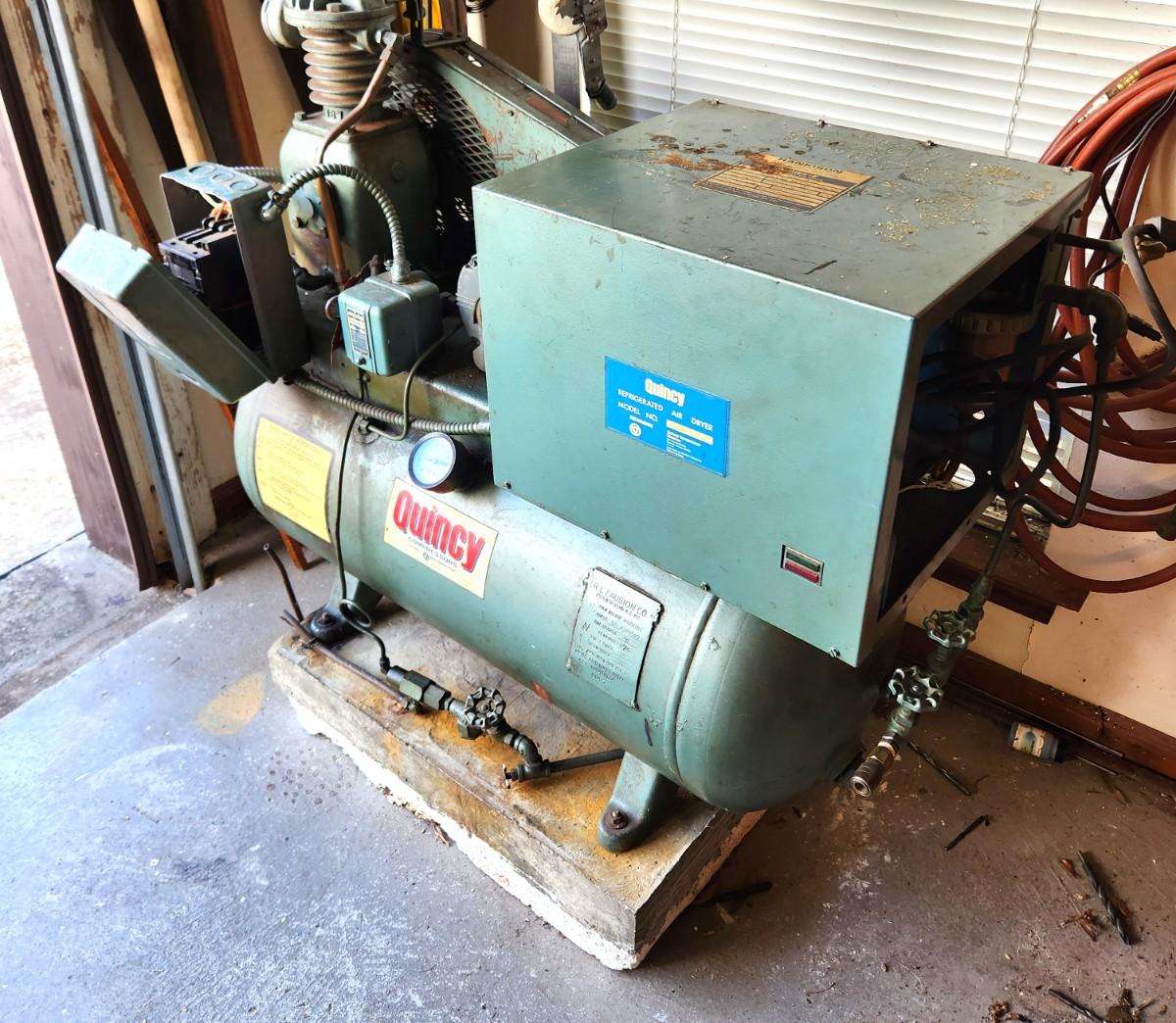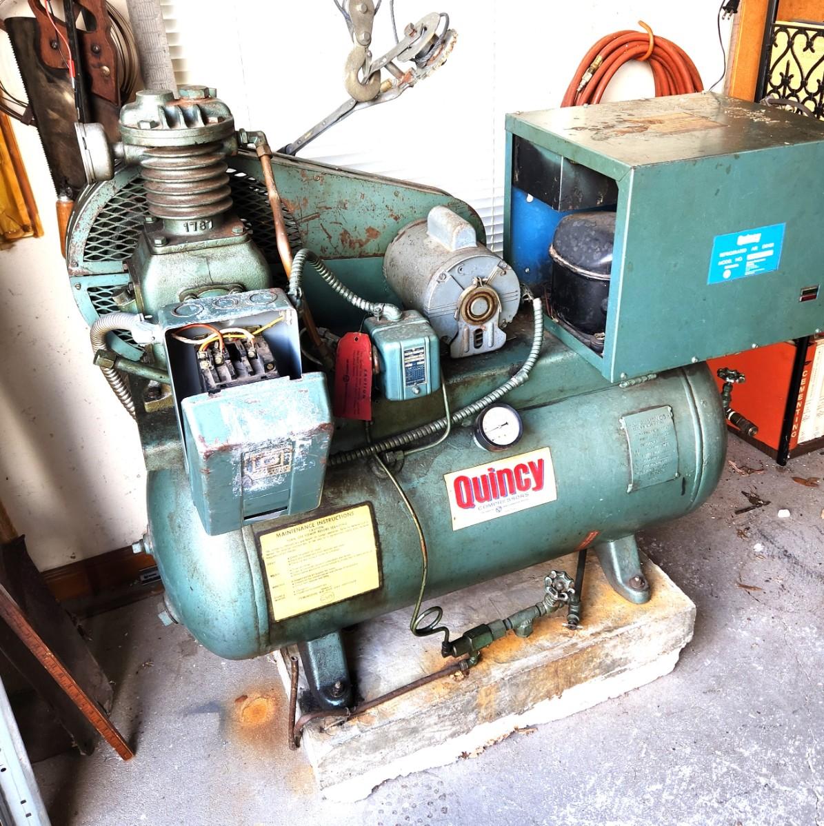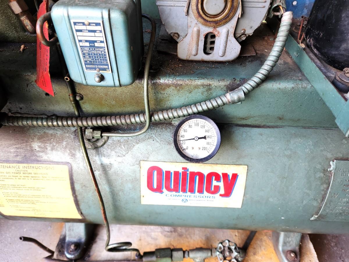 This Quincy Compressor (made 1974) is industrial/shop size - works - powers up, etc. Note: it is bolted to a block of concrete - take it "with" or unbolt yourself. We are not moving this sucker. Please check out all photos. This thing is at least 300 pounds.