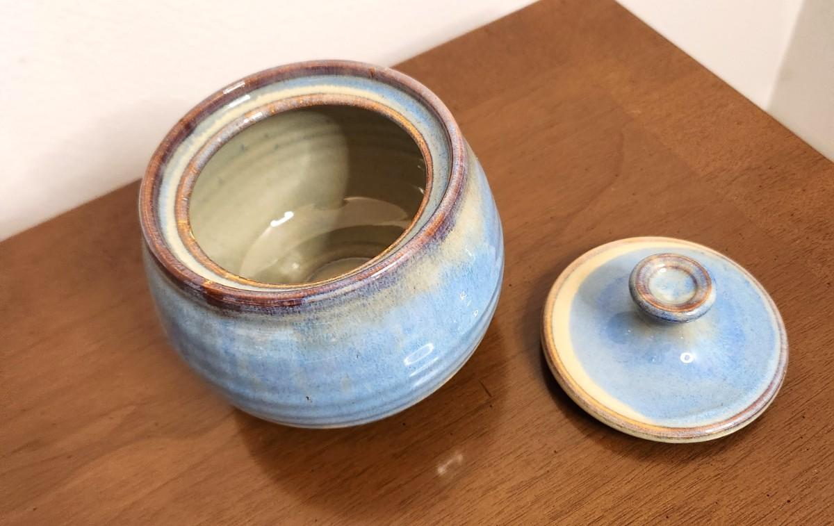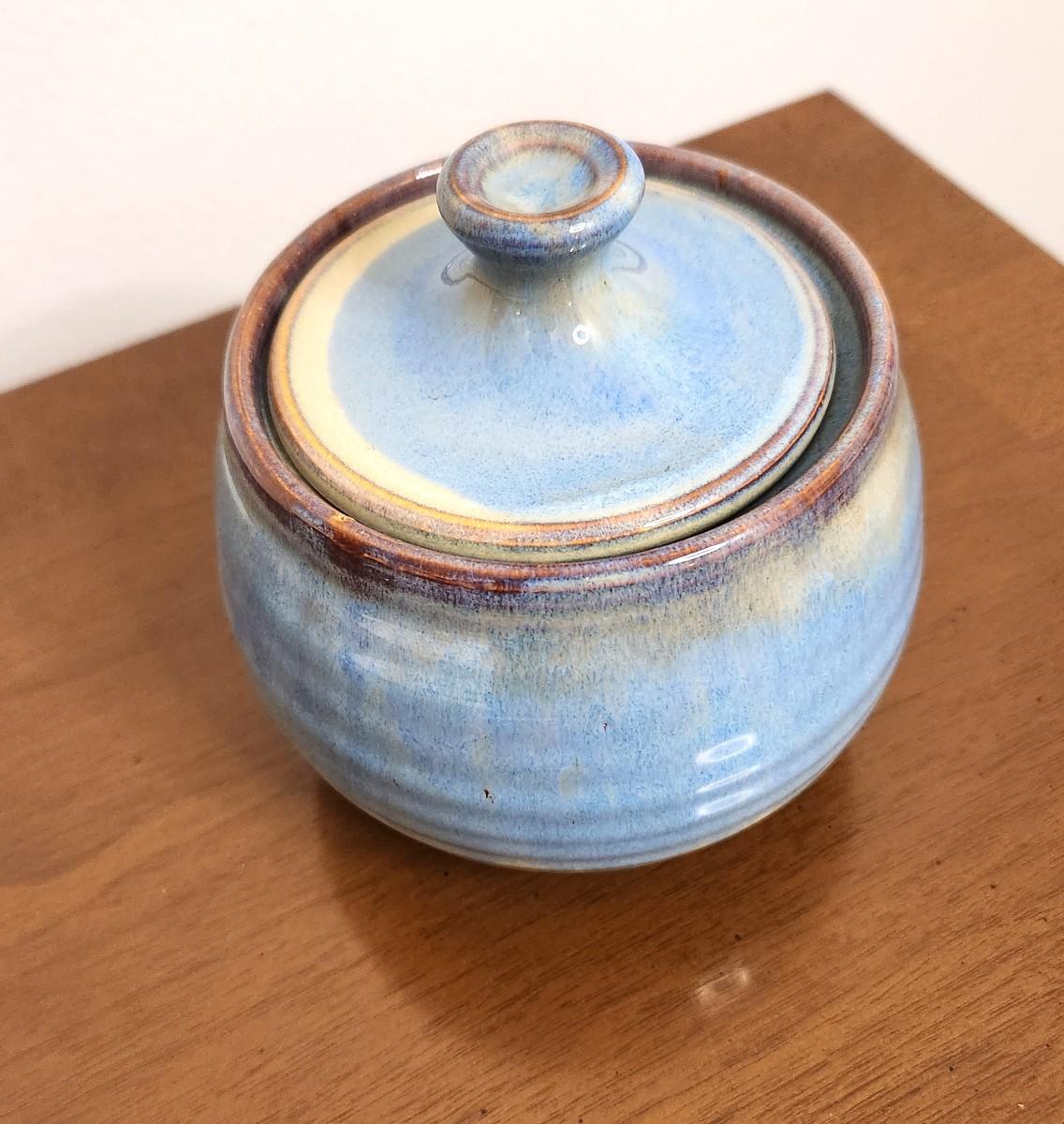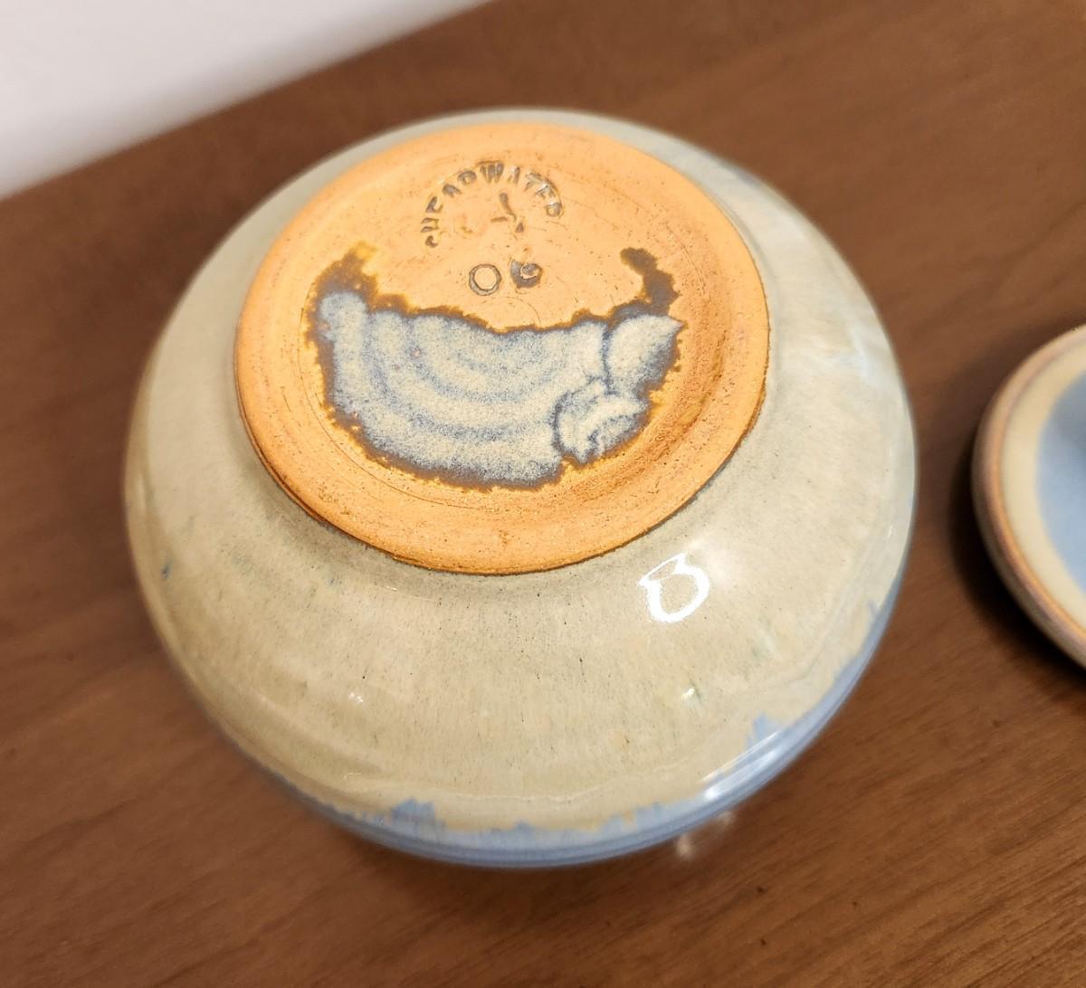Distinctive "Shearwater Blue" in color, marked Shearwater (Mississippi) Pottery pot/jar with lid. Nice condition.