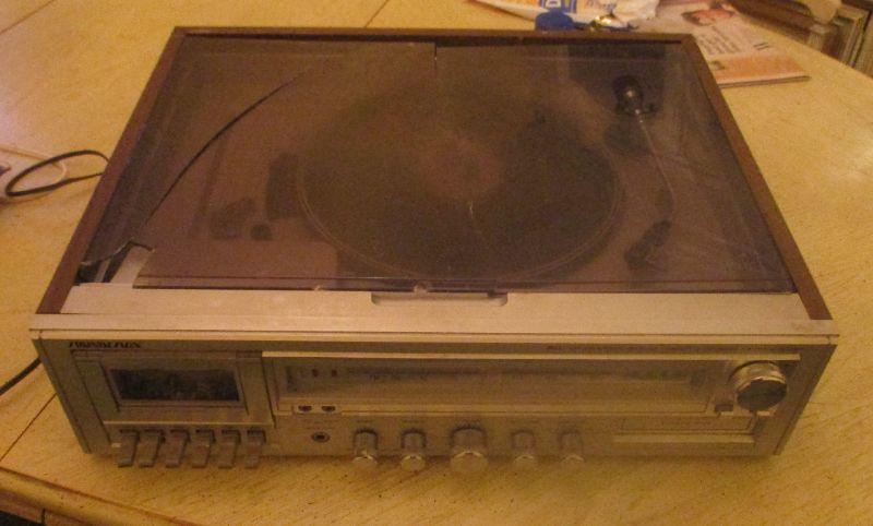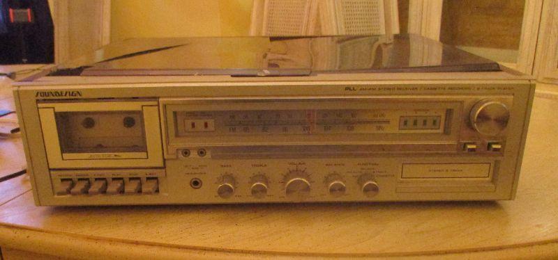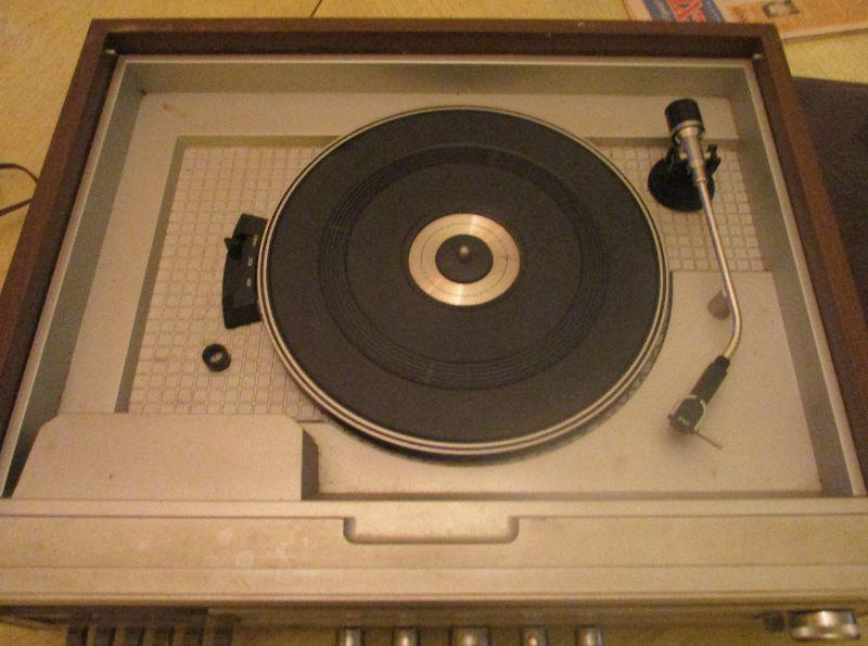 This powered on, the turntable spun, the cassette wheels turned and the radio picked up one station (didn't try for more). I don't know if the 8 track player works or not. It does need to be attached to speakers because the sound that came out wasn't loud. The main issue is that the plastic cover over the turntable is broken in half.