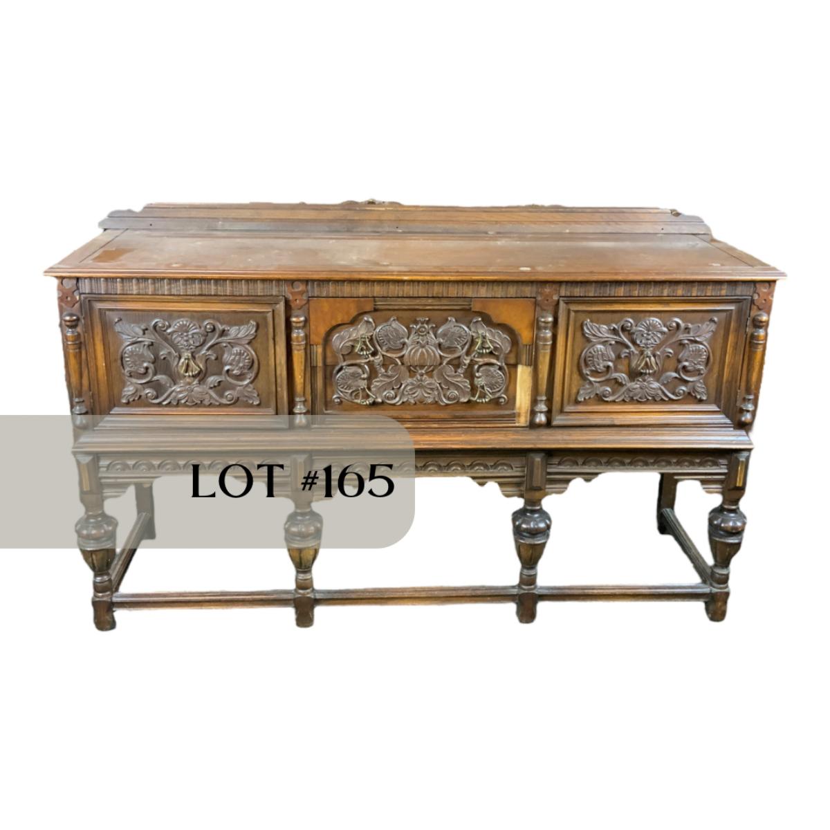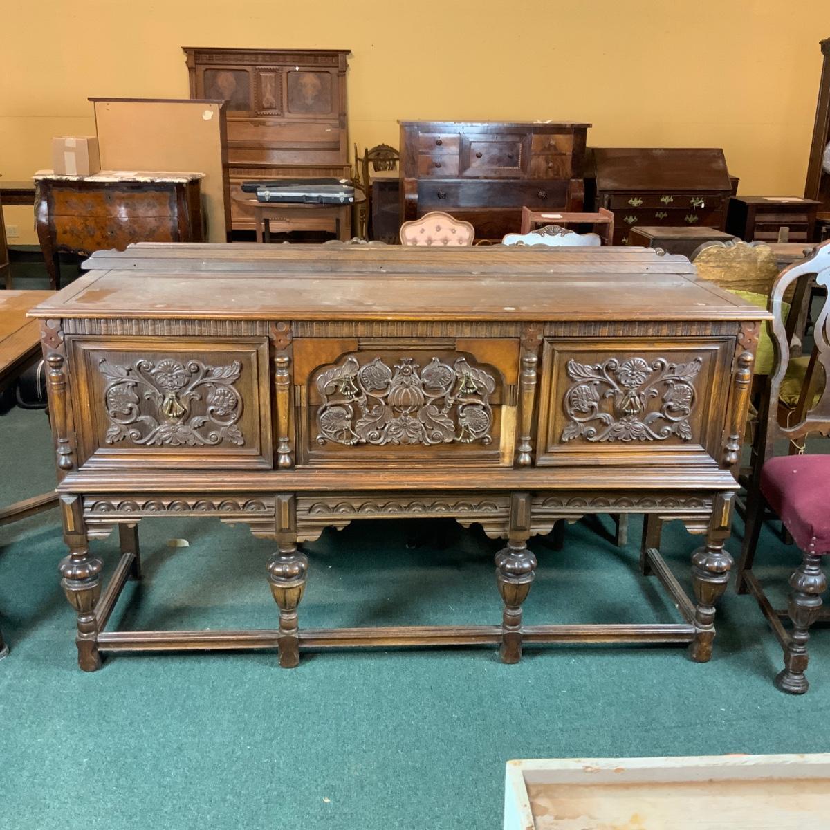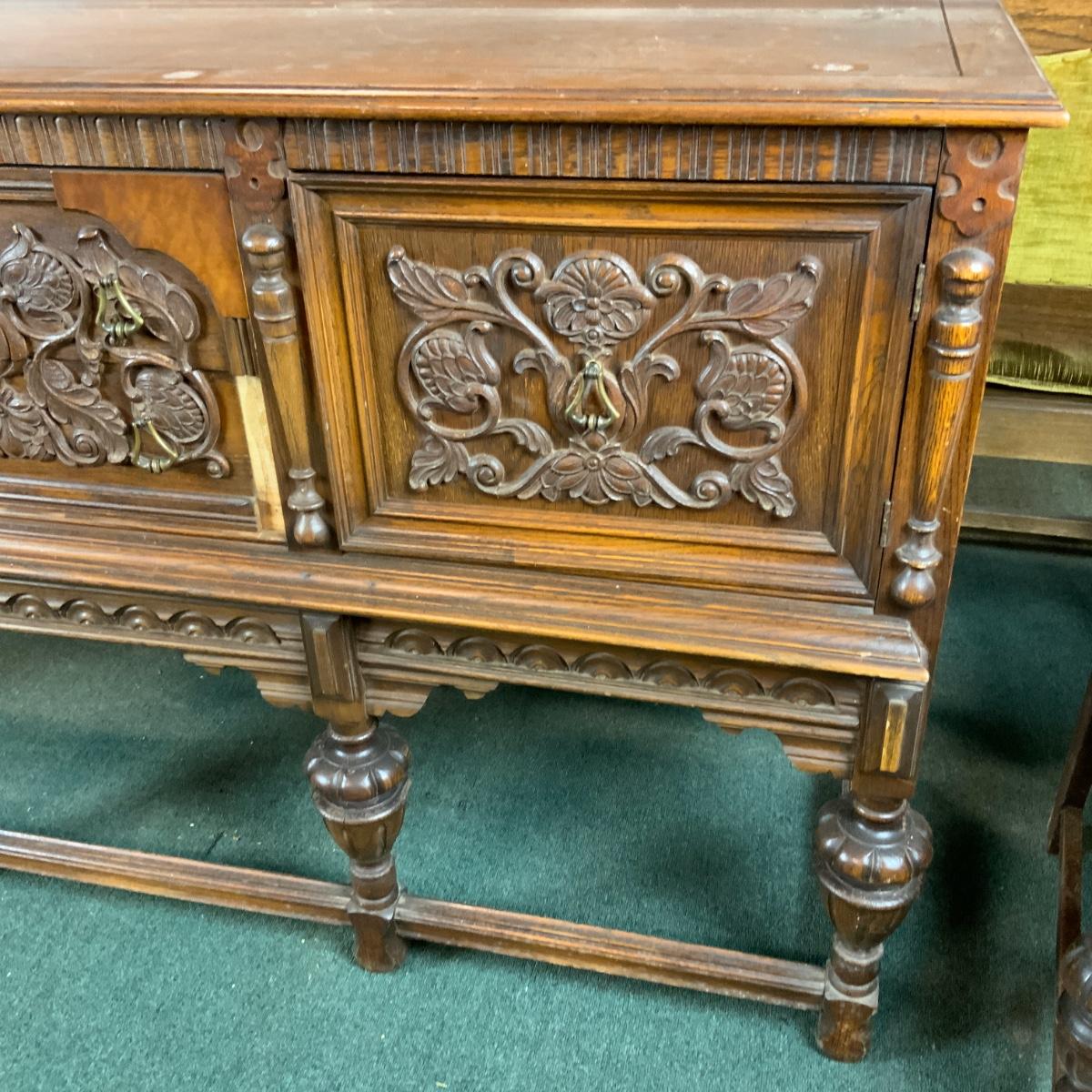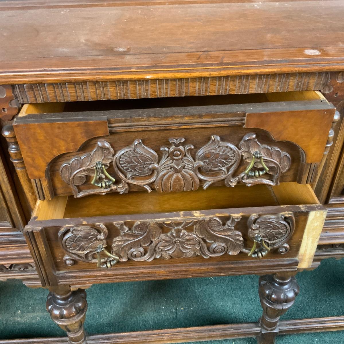 Magnificent Tudor Buffet or Sideboard. Needs some cosmetic work done. //::\\ Please see photos for details and condition. No attempt has been made to hide any imperfections. All items listed in this auction are warehouse items, and need to be cleaned. A majority of the items need restoration as well. All items are sold AS IS and WITHOUT GUARANTEE. If you are uncertain about an item, DO NOT BID. Due to the nature of this online auction in-person inspection is HIGHLY recommended. All Sales are FINAL. Pick Up Times are FIRM. Please confirm with your own schedule that you can pick up in the scheduled times listed in the Terms and Conditions. Any questions please message the auctioneer. DO NOT Contact The Harp Gallery.