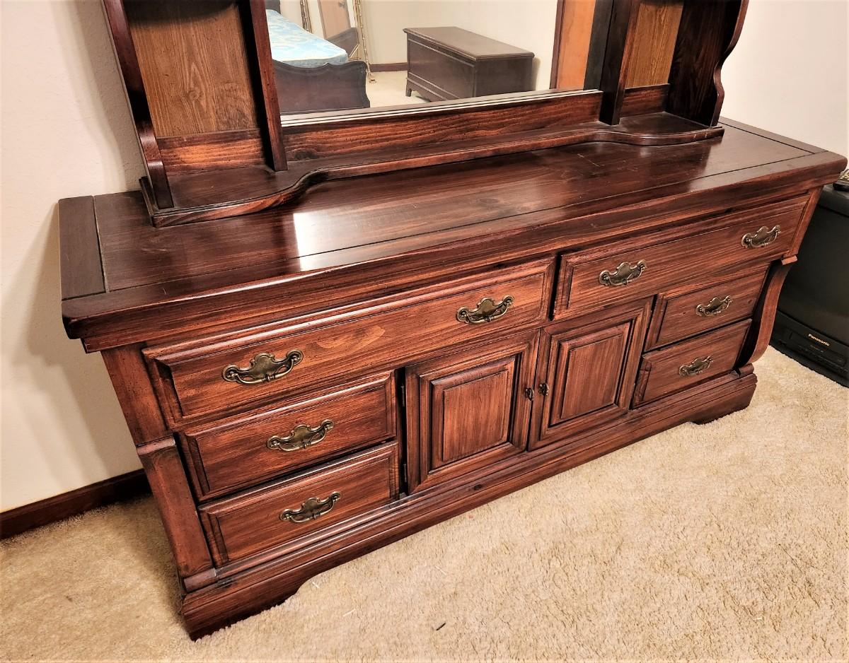 This vintage rock maple dresser has a detachable mirror - solid piece of furniture. Note: this item is upstairs and you need to be prepared to move/load it yourself if you are the buyer. 66" across, 18" deep, 73" tall with mirror. No maker noted. Overall good condition.