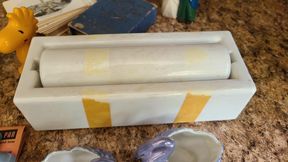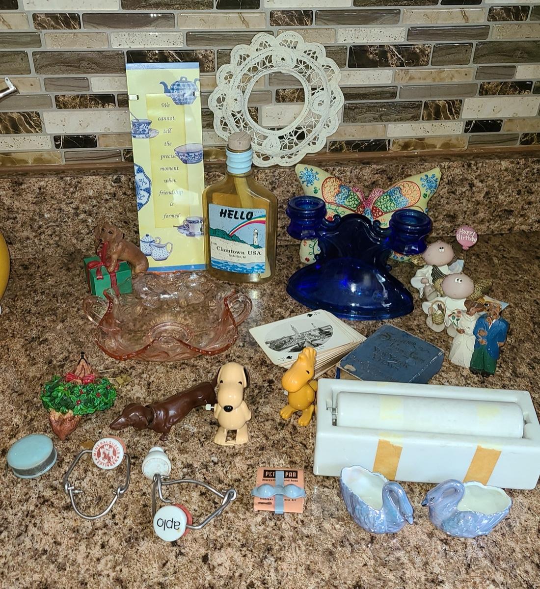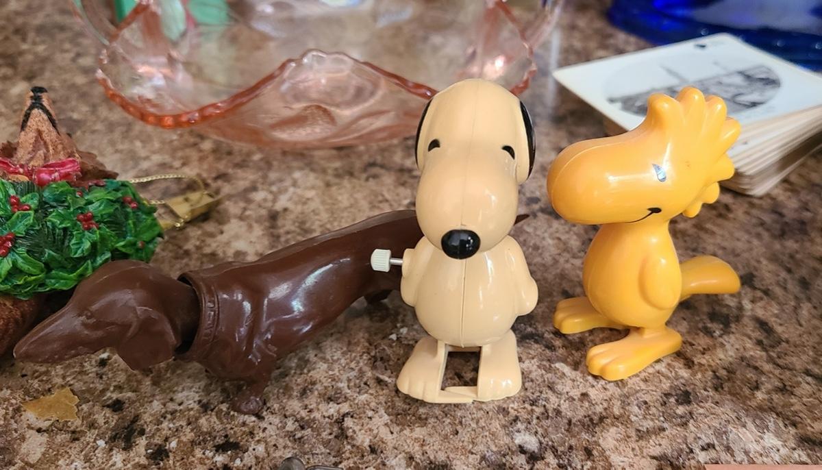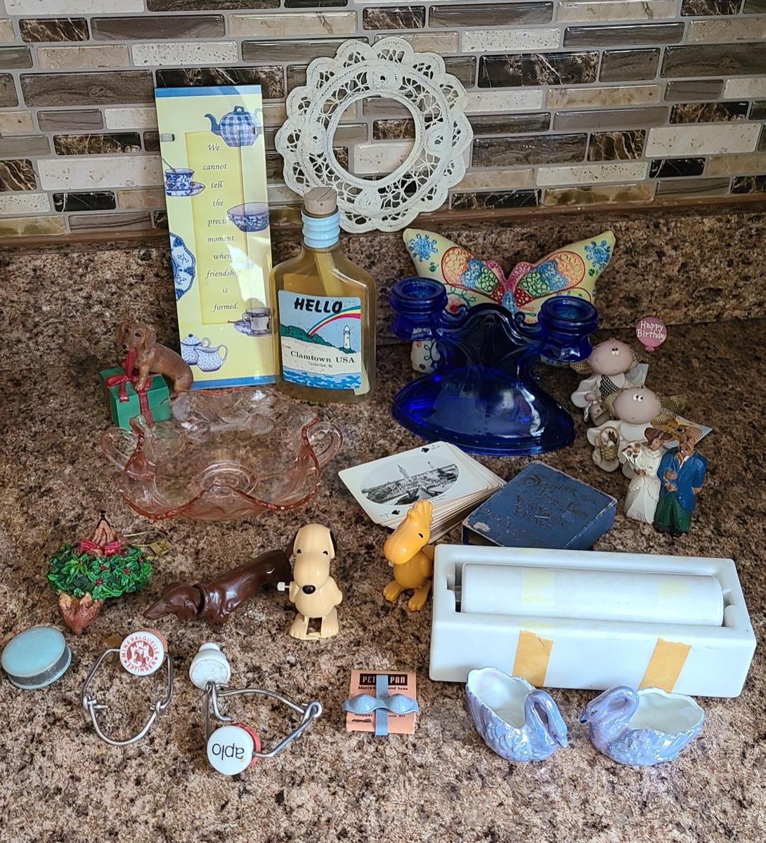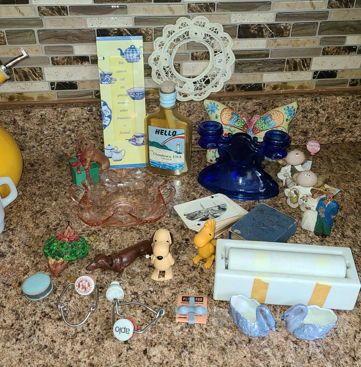 Unique lot of collectibles including 70's Snoopy walking wind-ups, a bra matchbook advertisement, a marble wet your envelop, a pink strawberry depression glass dish, a unique Germany antique bobblehead and moving tail dachshund, and more. The cobalt blue candlestick does have a chip on outer edge rim of candle holder. Please see all pictures for content of the lot, condition of the lot, and measurements if taken. Pictures are the best representation of the items listed and items are untested unless indicated in description. Thank you for looking and have fun bidding!
