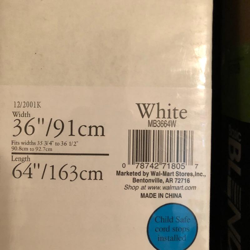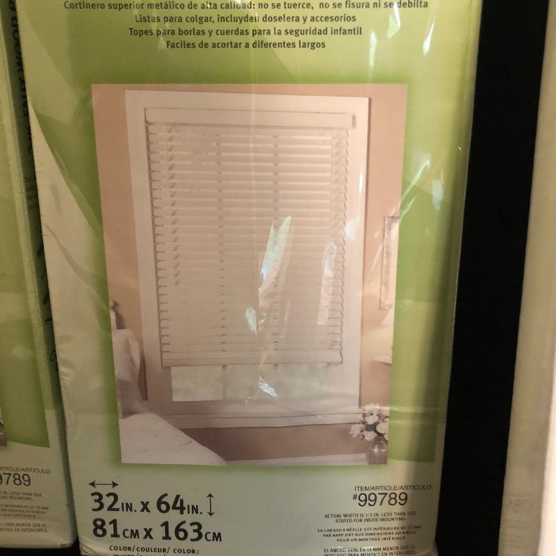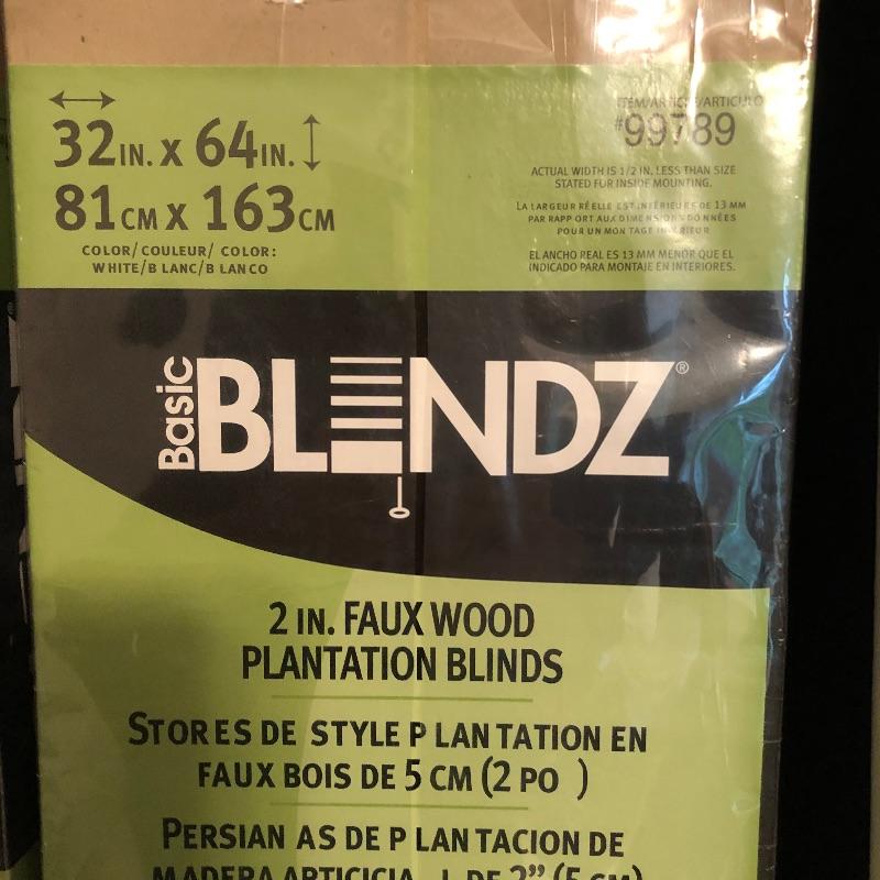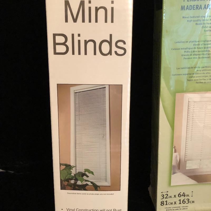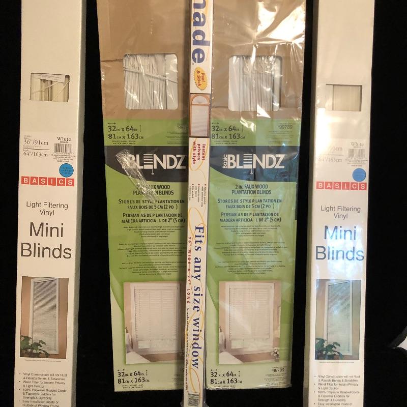Four blinds and a window shade are included here that are brand new and sealed in their boxes. The two white Plantation blinds are 2 inch faux wood, the two white mini blinds are vinyl. The images show the dimensions of all five items.