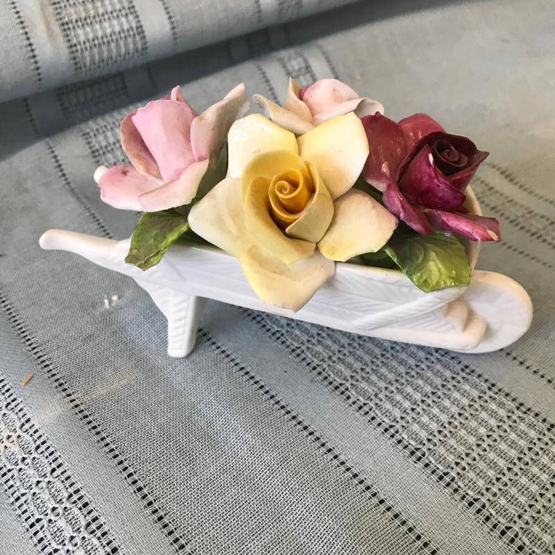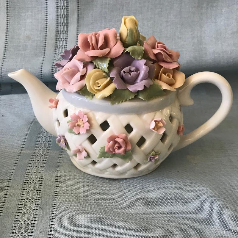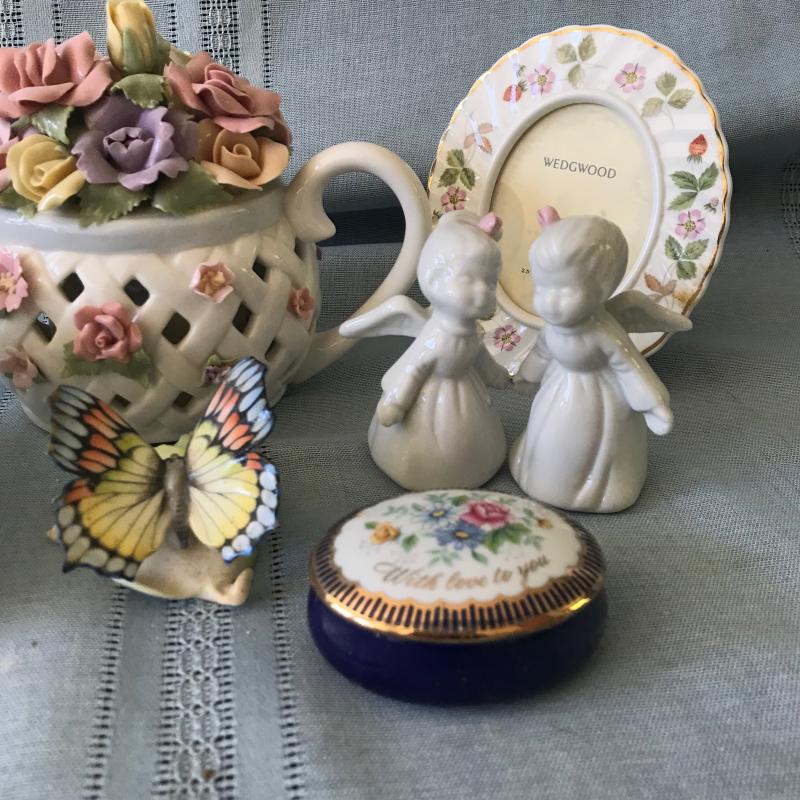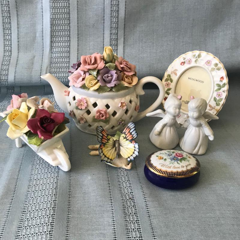 Lot includes a Wedgewood oval shaped picture frame, Teapot (7.5” x 4” x 5”)music box with beautiful flower design and a few other small china pieces. Note one flower on flower cart has a small chip. See photos of all pieces. Shipping or local pick up.