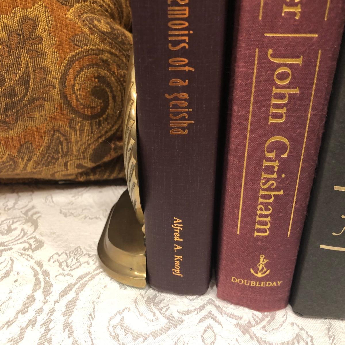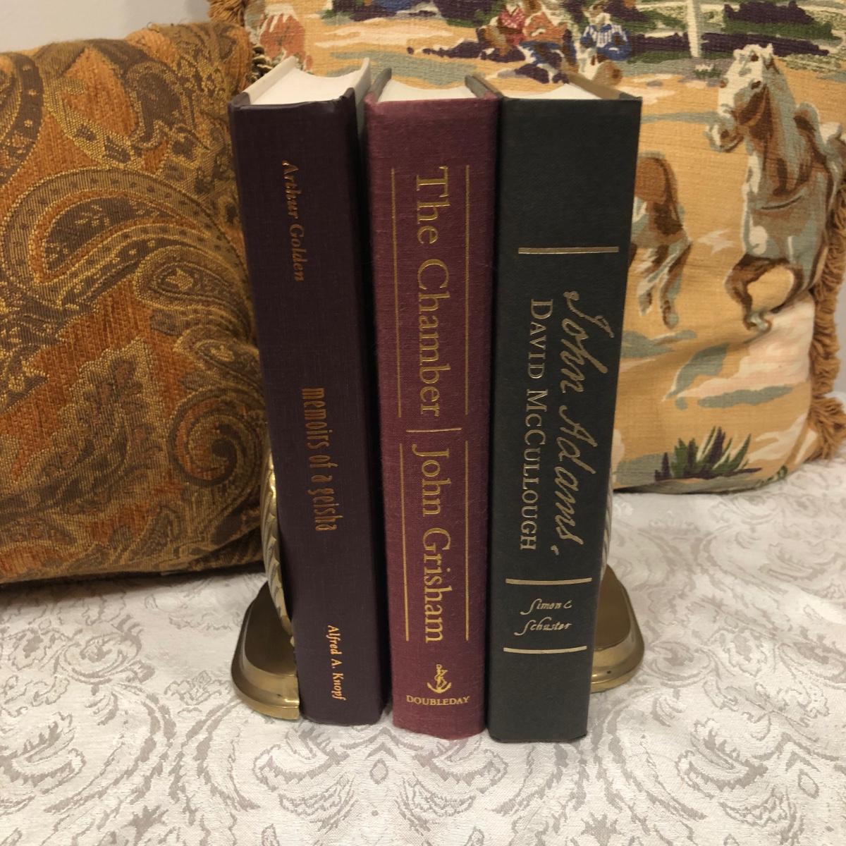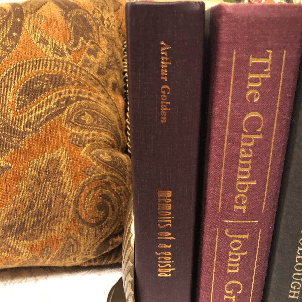LOT 165M: Decor Pillows, Shell Bookends, John Adam's Biography, The Chamber by John Grisham & Memoirs of a Geisha by Arthur Golden