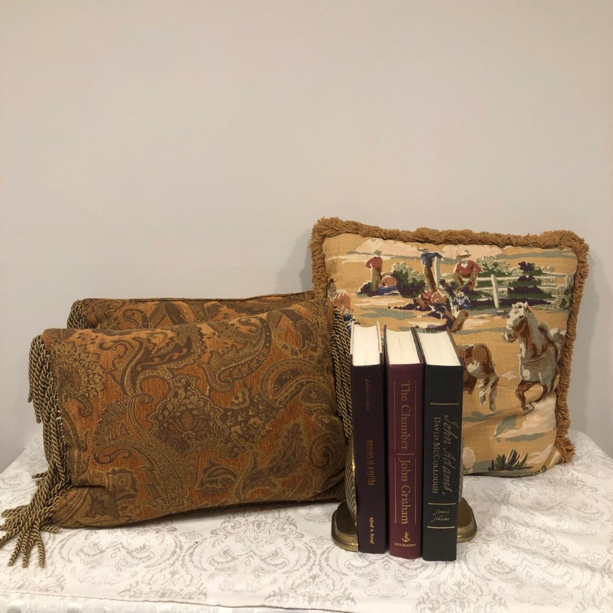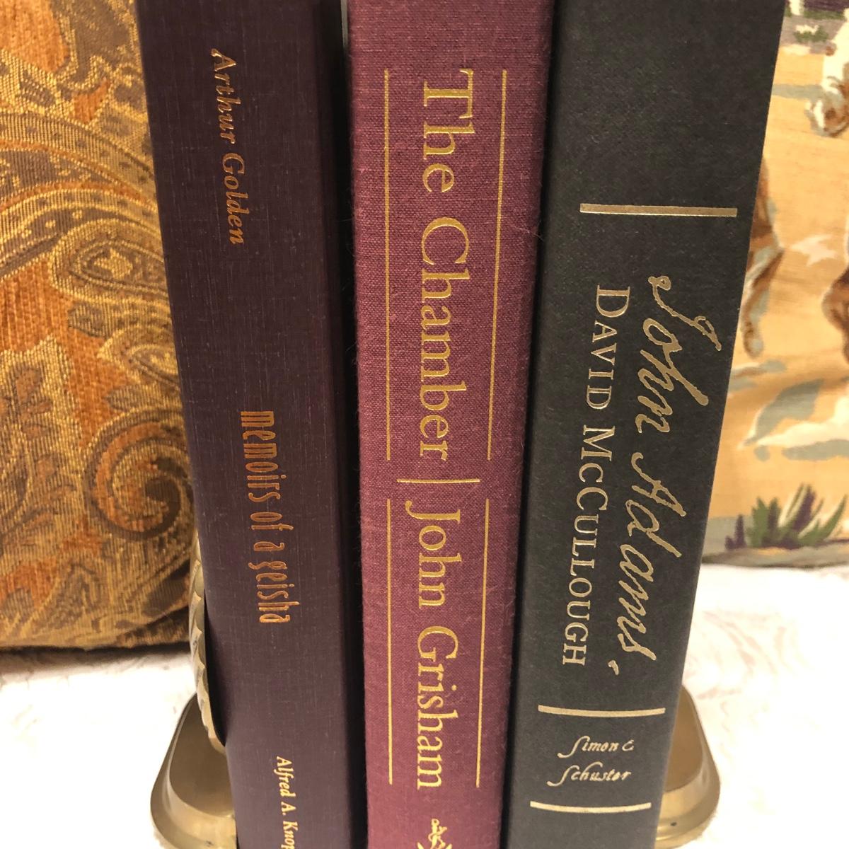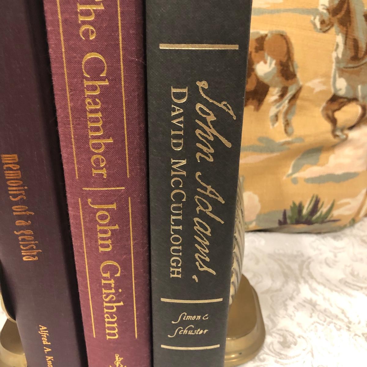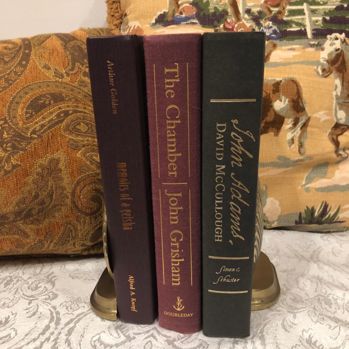LOT 165M: Decor Pillows, Shell Bookends, John Adam's Biography, The Chamber by John Grisham & Memoirs of a Geisha by Arthur Golden