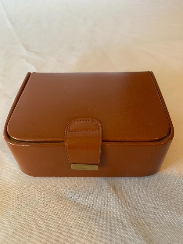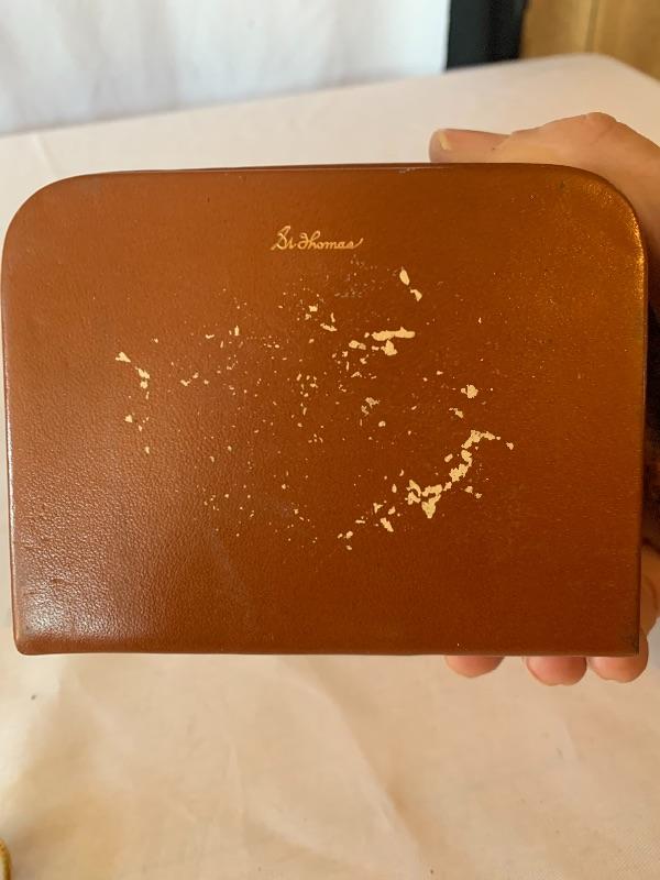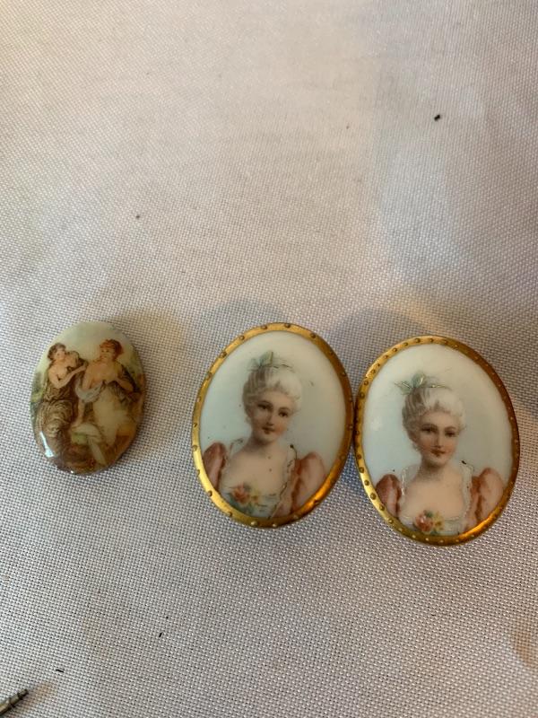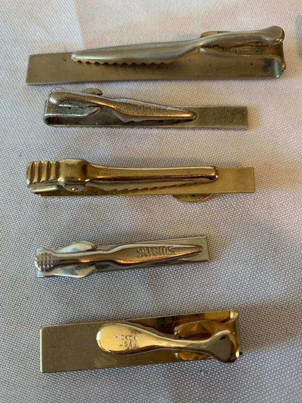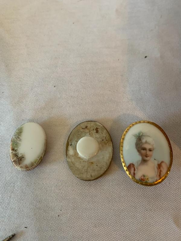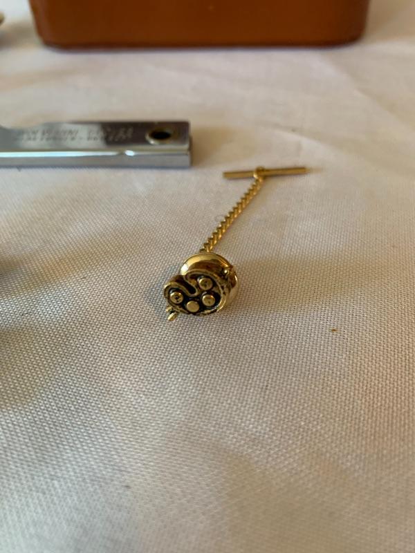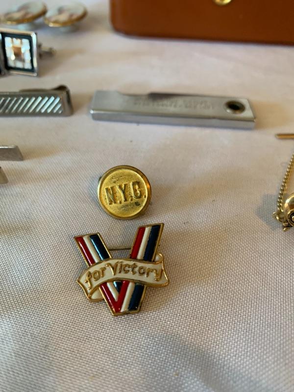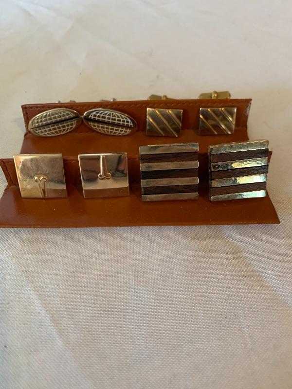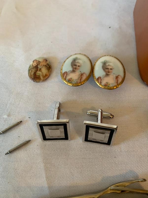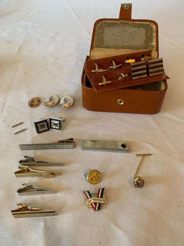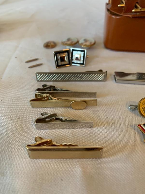 Nice collection of Swank and fur more pairs of classic men’s cufflinks along with a few tie tacks and clips. Three cameo looking porcelain pieces that could be studs or cufflinks (two of them). A couple pins and small pocket knife along with a leather case. Shipping available.