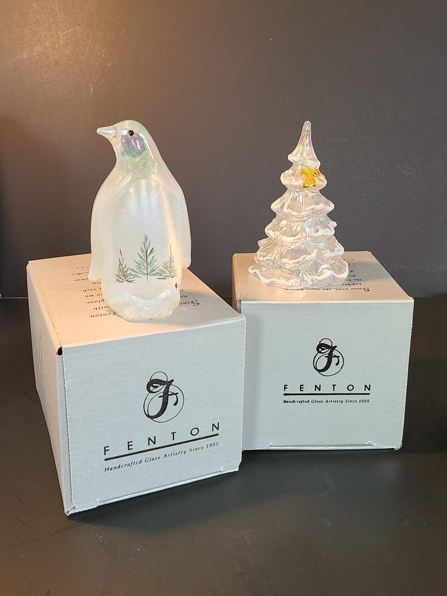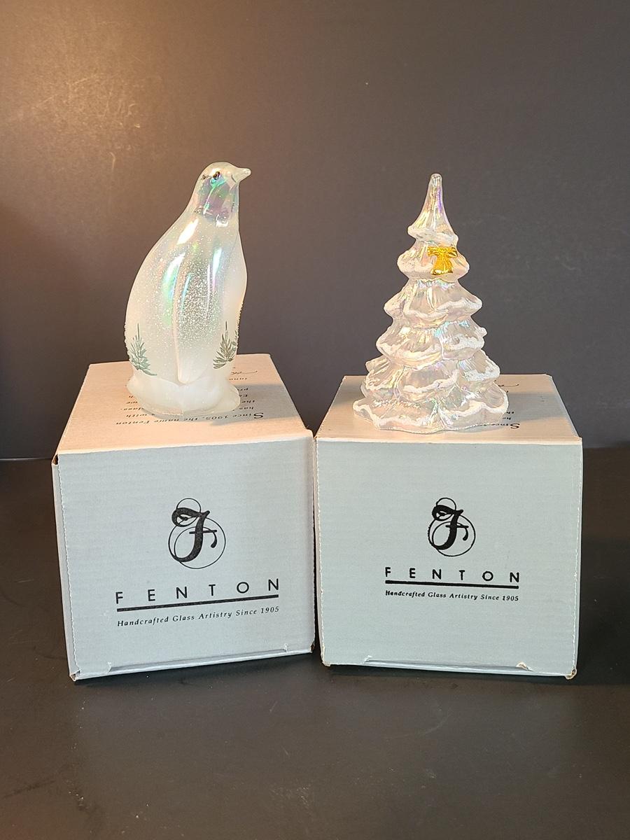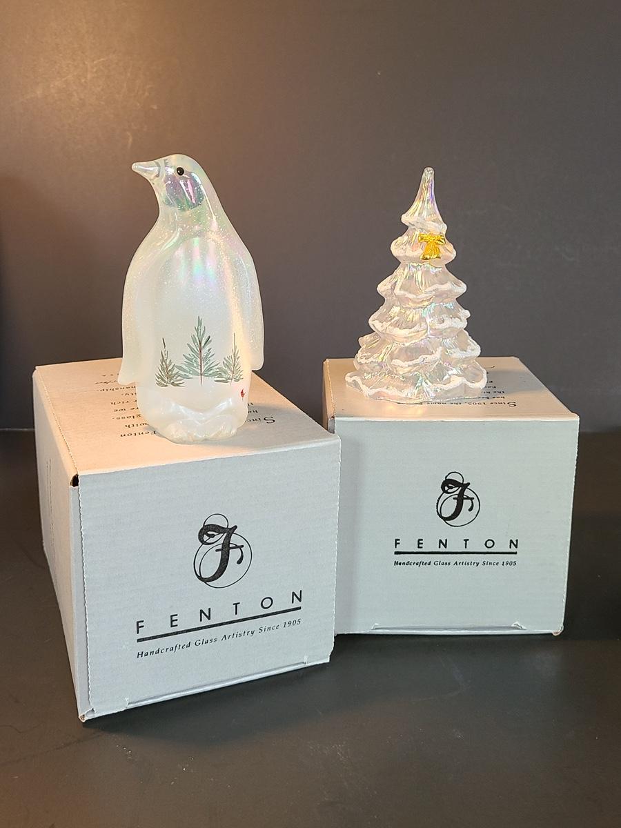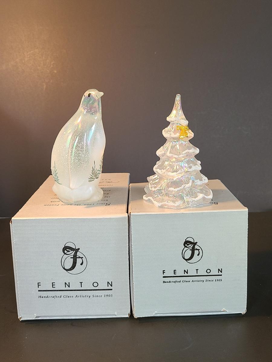 Lot 166: Fenton Woodland Penguin and Medium Iridescent Tree with Bow