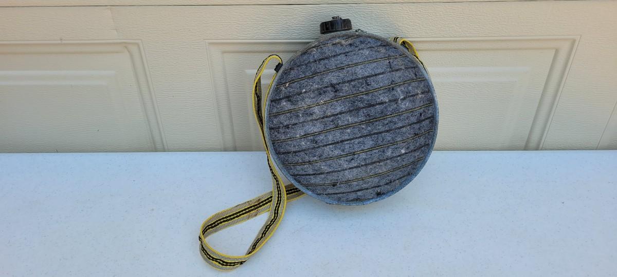 This Vintage Canteen has been lonee with Wool and appears to be in good condition for age. 4 quart Size.