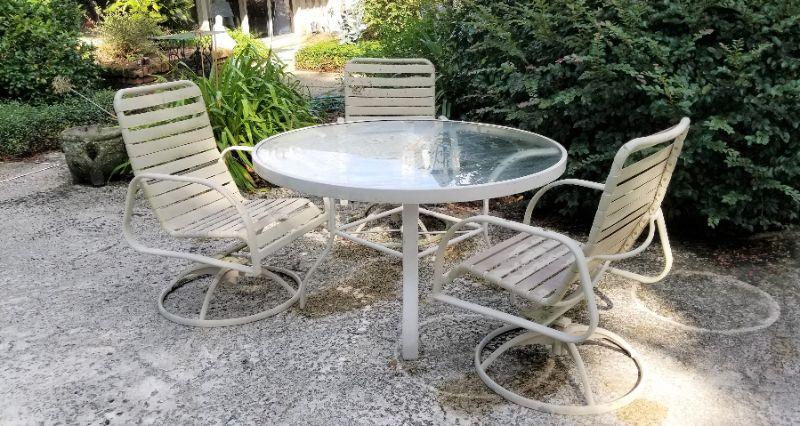Aluminum patio set - glass table and 3 chairs. Table has been acid etched with the names of family members. Measures 48.5" across, 28" tall. Chairs 36" tall. Used condition.