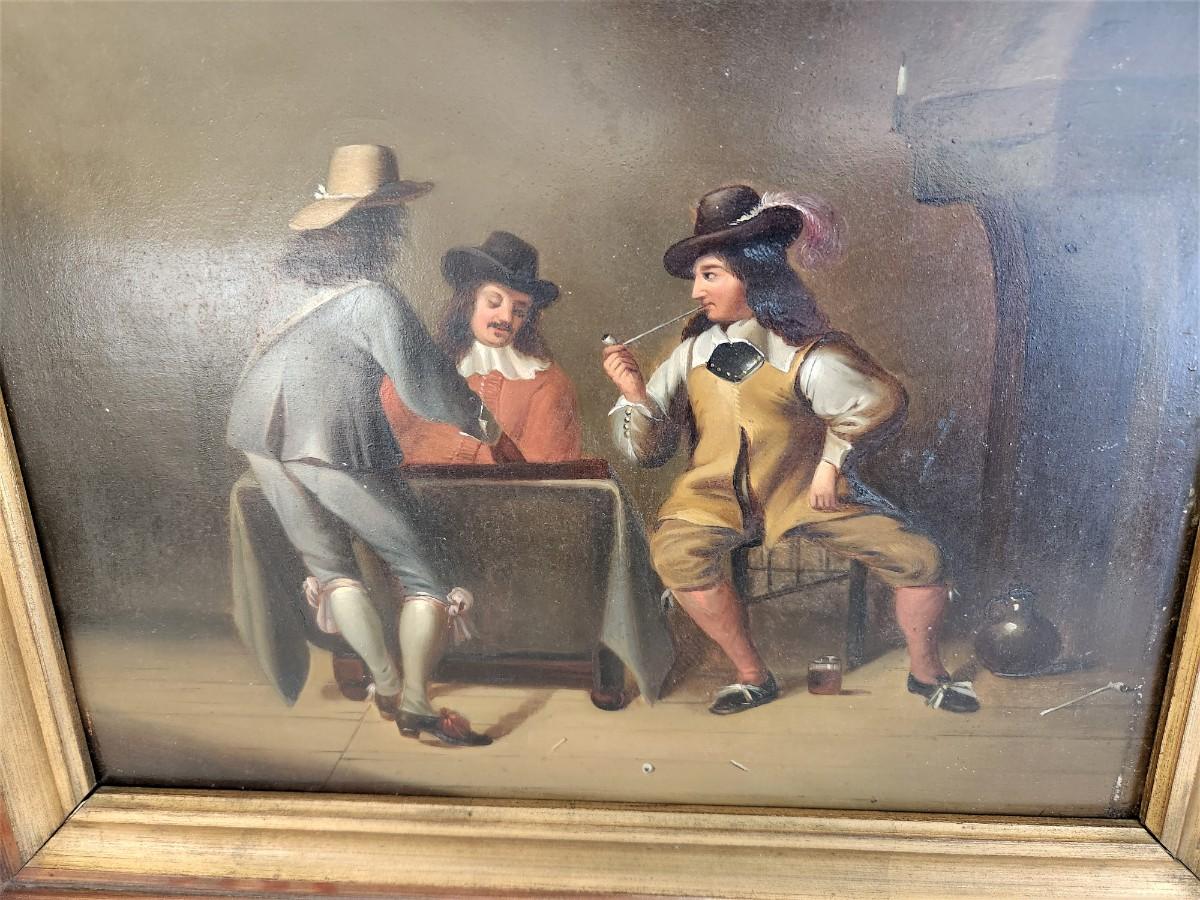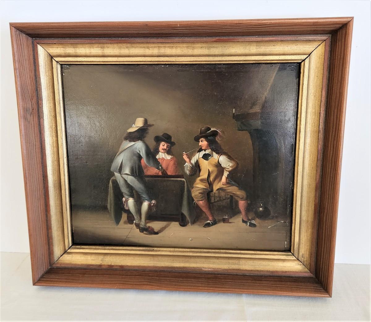 19th Century unsigned oil on board - Gentlemen in a Tavern setting - Continental school - has been reframed - 18.5" x 16" tall. Good antique condition.