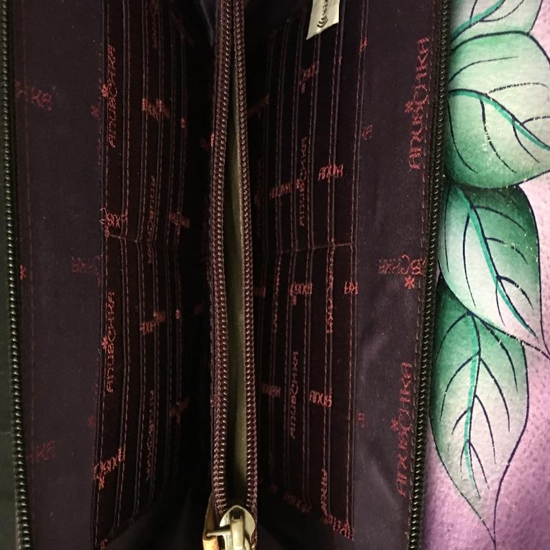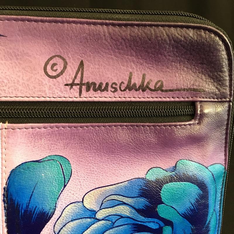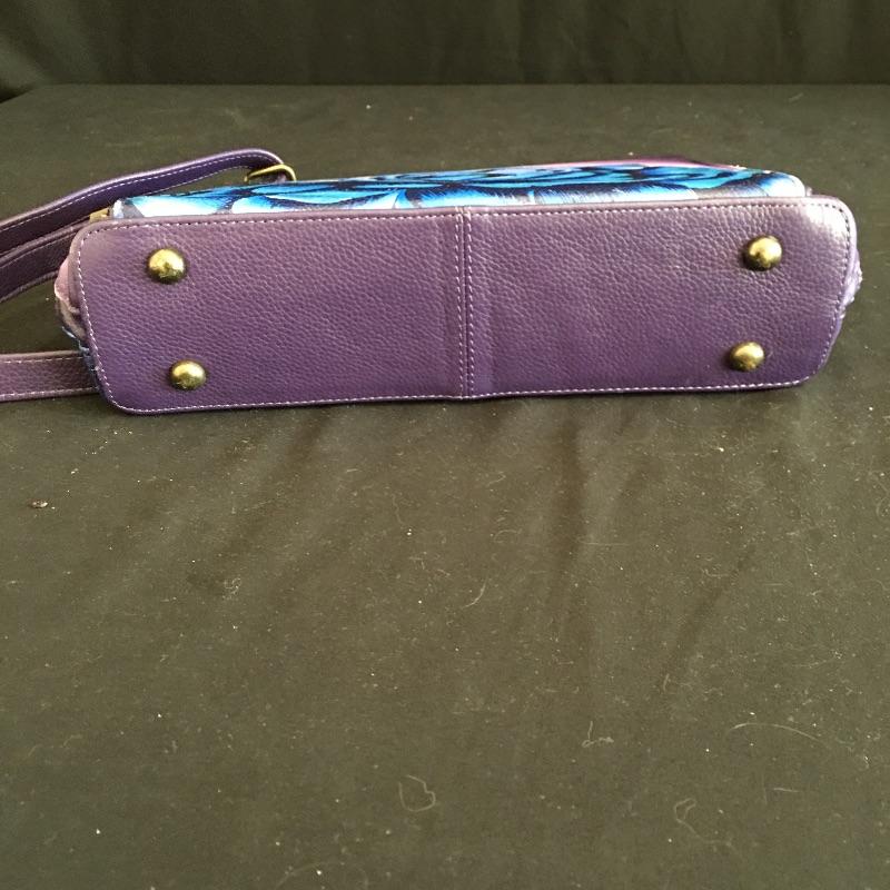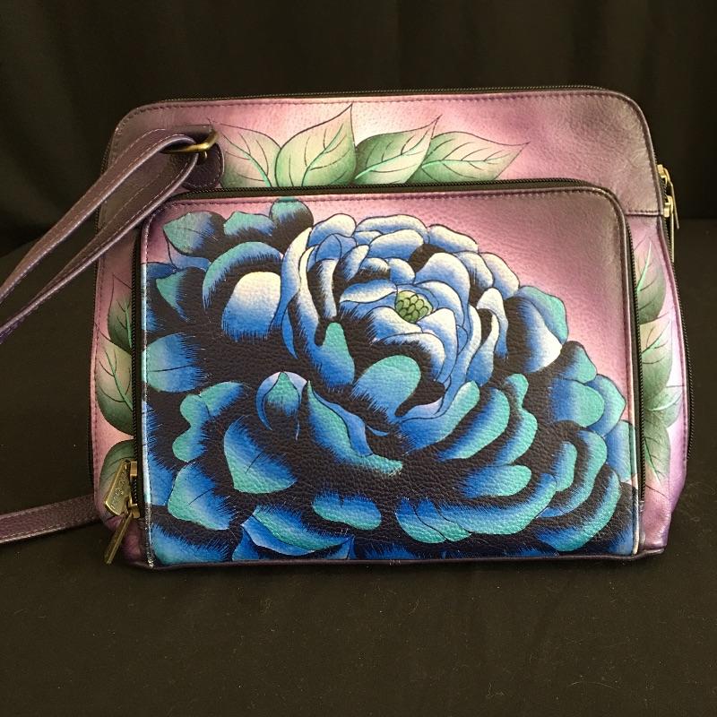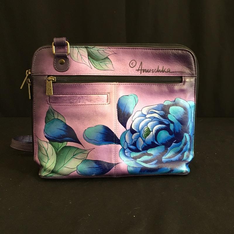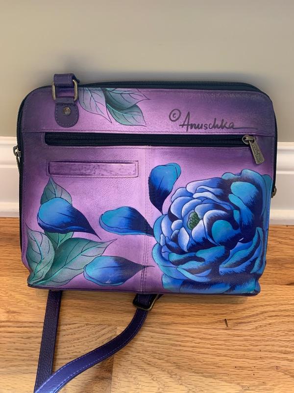 Anuschka bags blend art with functionality. They are one of the premier hand painted brands of bags in the world. Each accessory is hand cut and crafted from top grain cowhide. Treat yourself or a loved one to this beautiful hand painted bag. Bag measures 9.5” x 12” x 3”. The colors are shades of purple blues and greens.