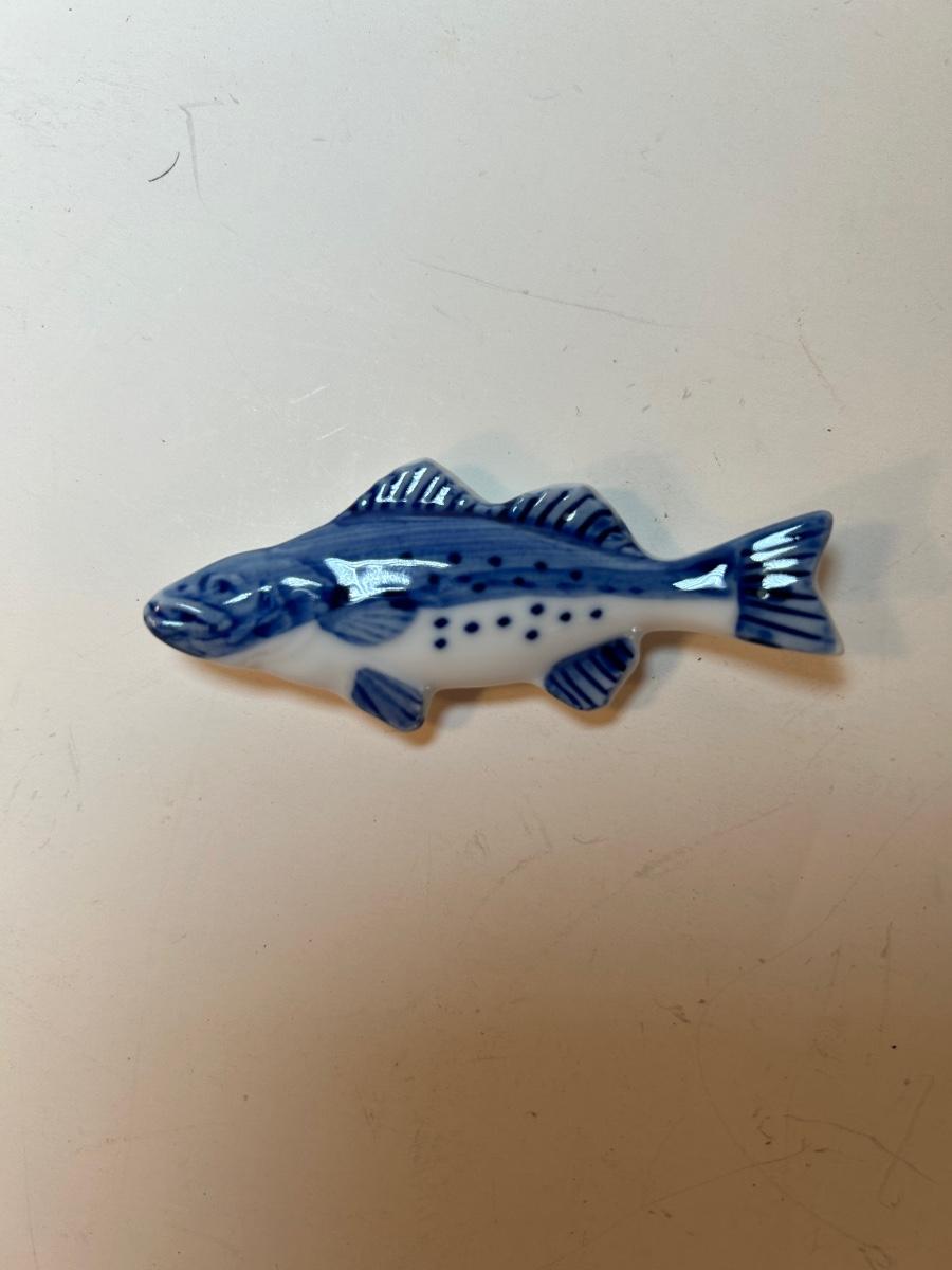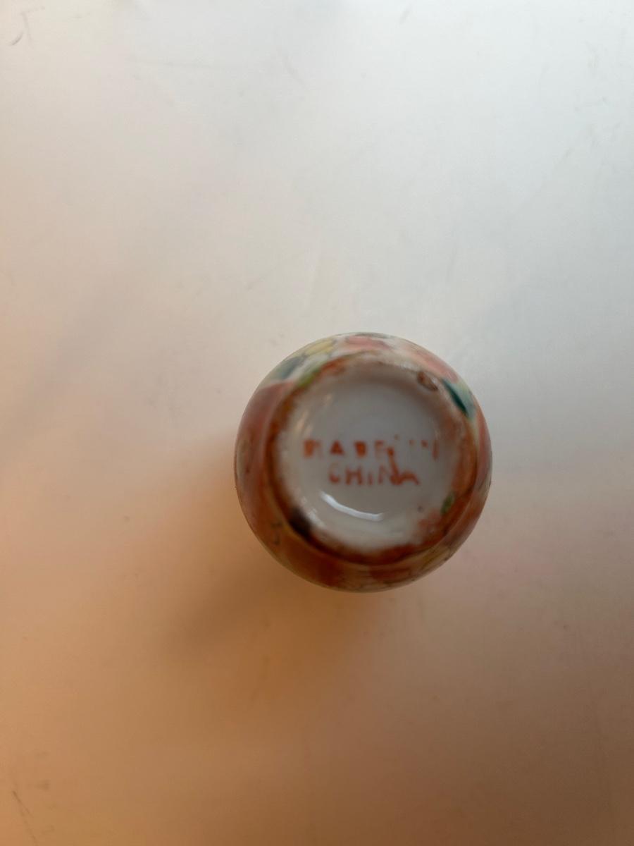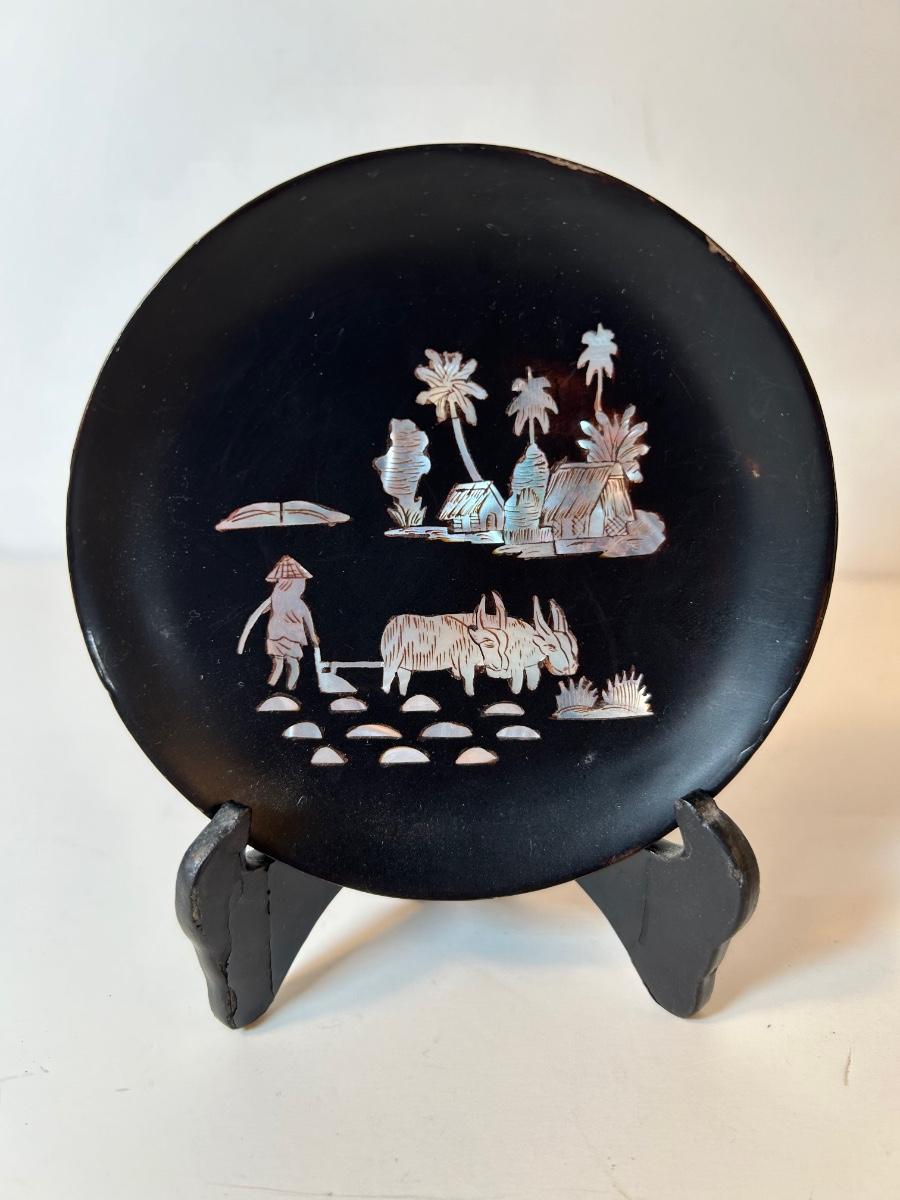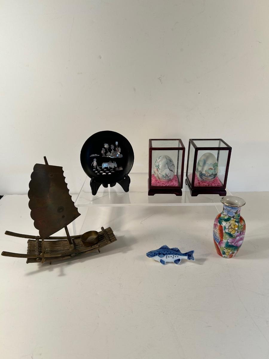 Included in lot is a metal sailboat votive candle holder with oar, blue & white ceramic fish, 4" black resin plate with iridescent scene and plate stand, 4" floral bud vase, 2 Asian scene