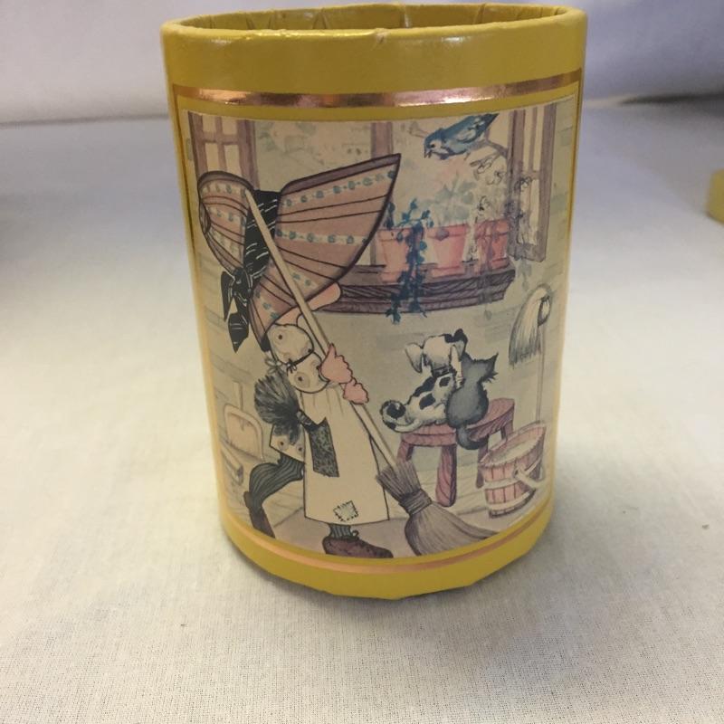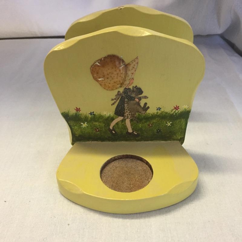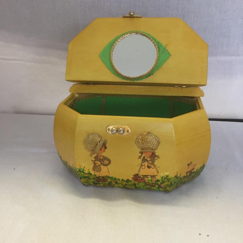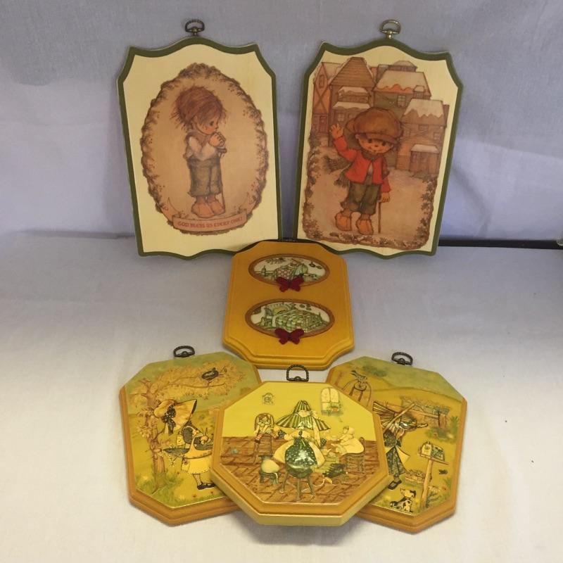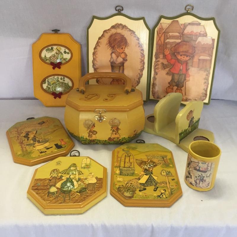 Charming collection of room decor Adorable wooden box that has a mirror on the inside. Also included is a canister, a wooden stand that could hold napkins or books and a total of 5 wooden wall hangings.