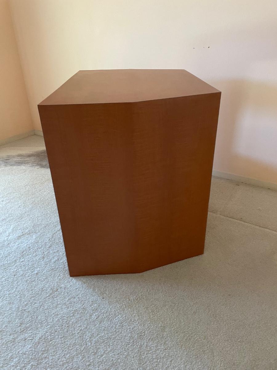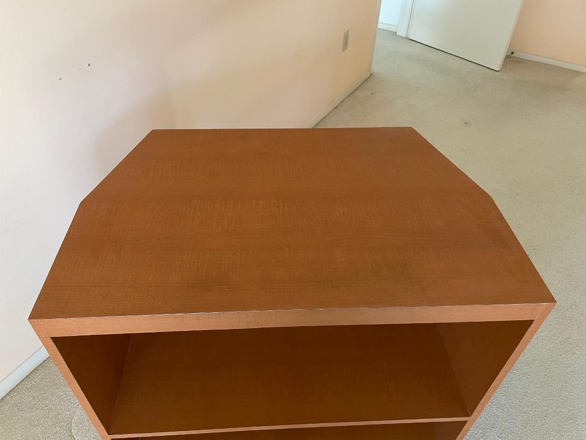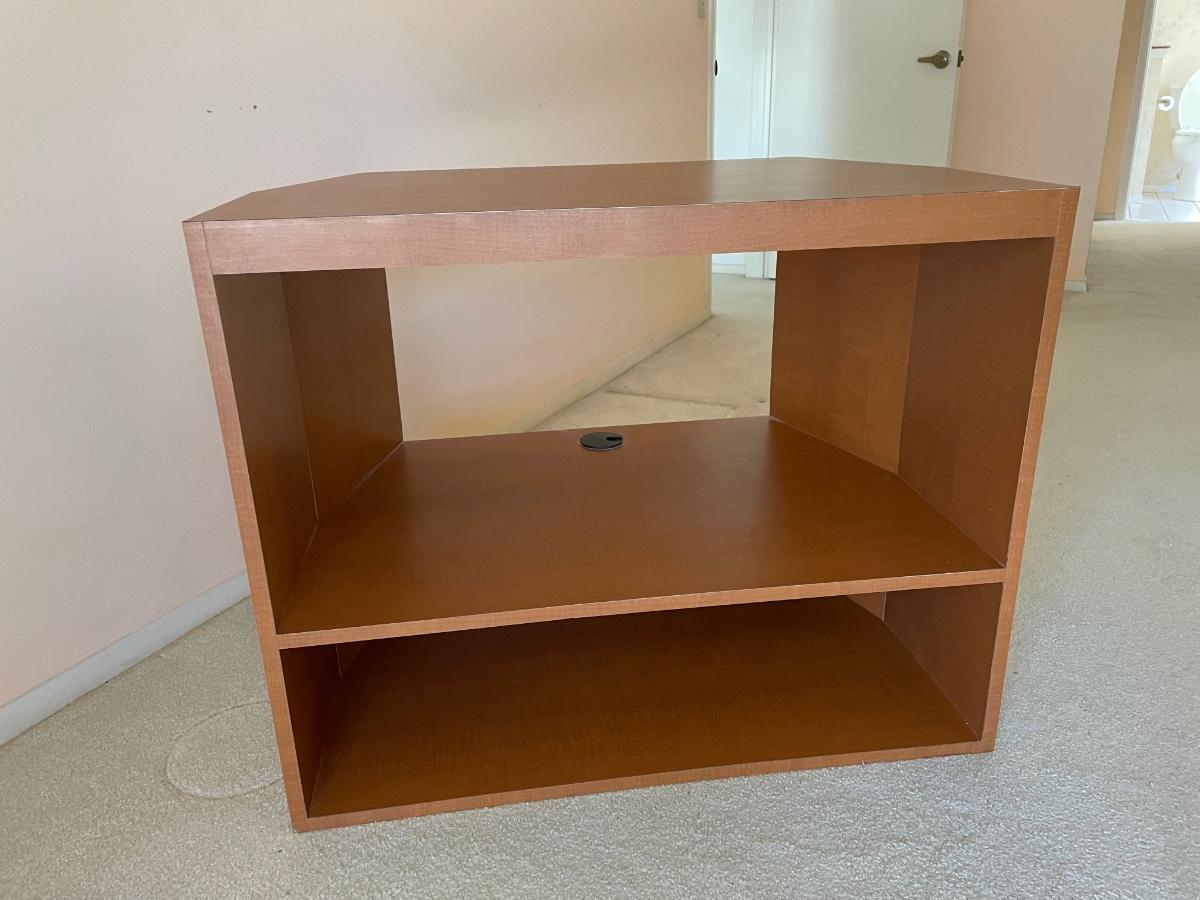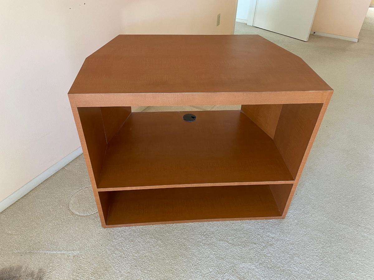 Custom TV stand made with woodgrain laminate. Dimensions are in the photos