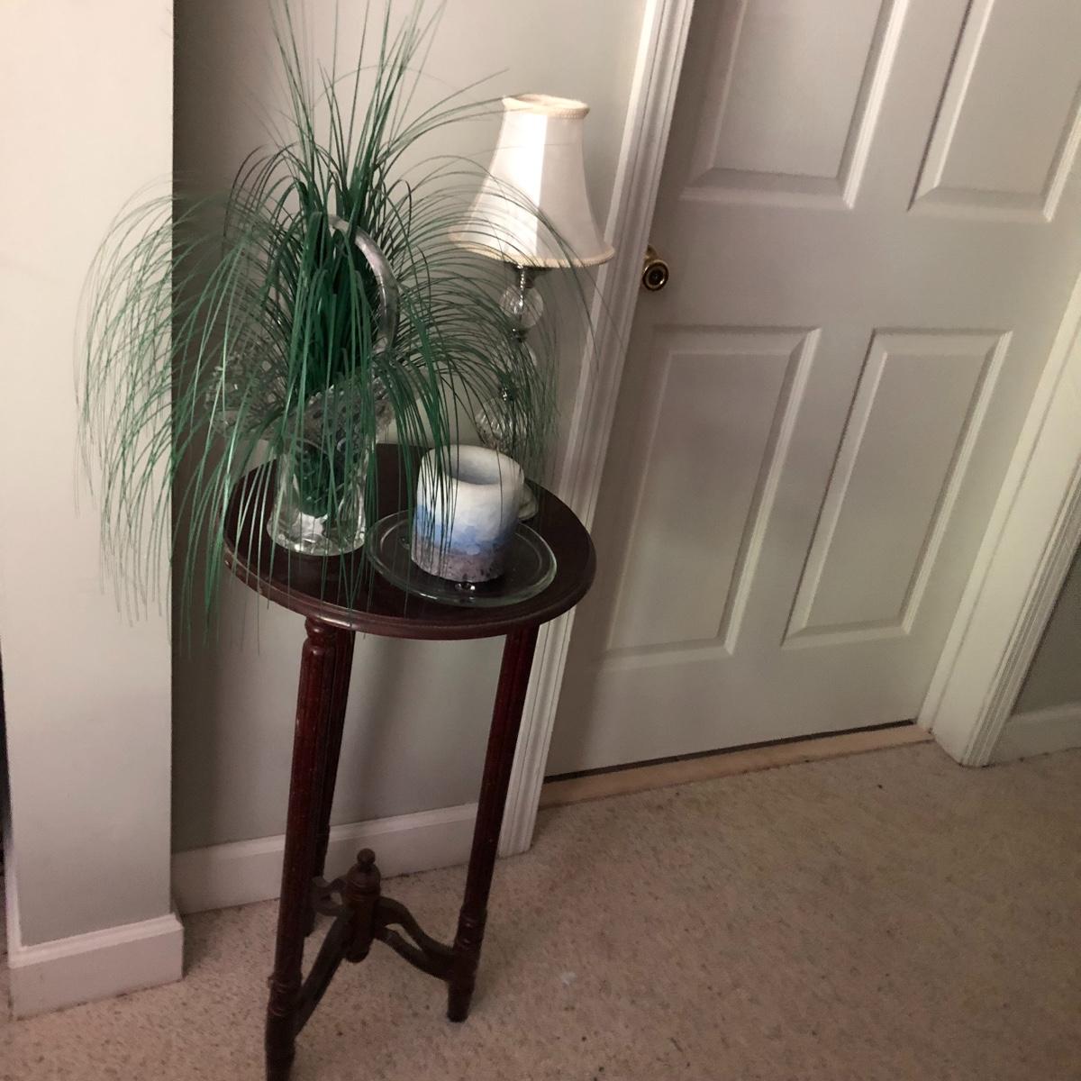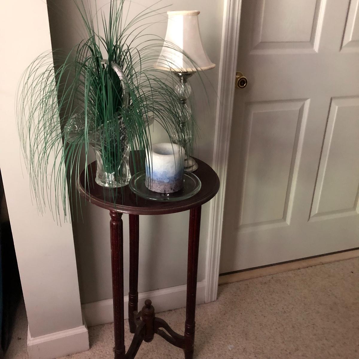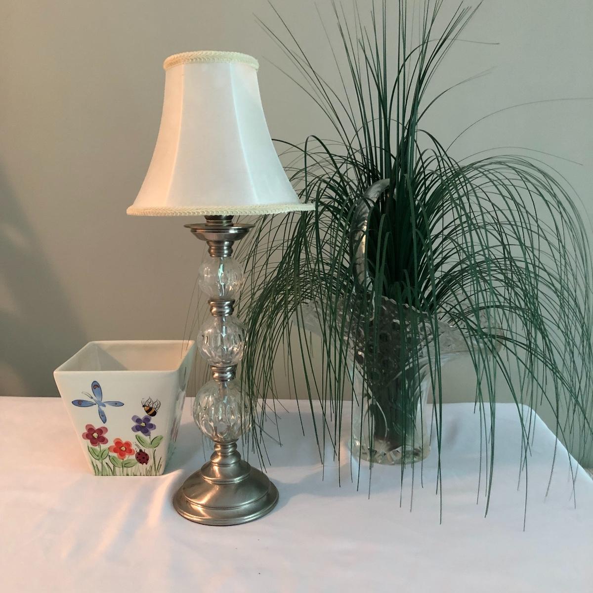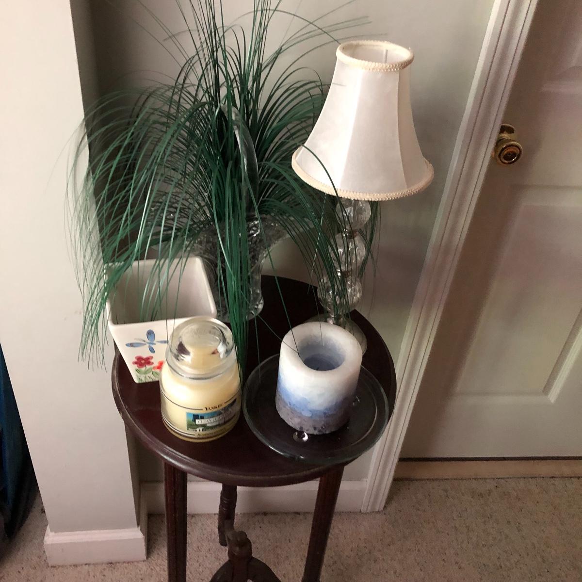 This elegant end table is ideal for displaying a special plant, vase of flowers or a lamp; it’s a lightweight piece that feels like it may be MDF, it does have a small blemish on the table surface. Also included is a glass basket style vase that currently is home to a faux grass plant, a couple of candles, small ceramic plant pot and a precious glass and metal candle holder that looks like a lamp and has a small ivory shade.