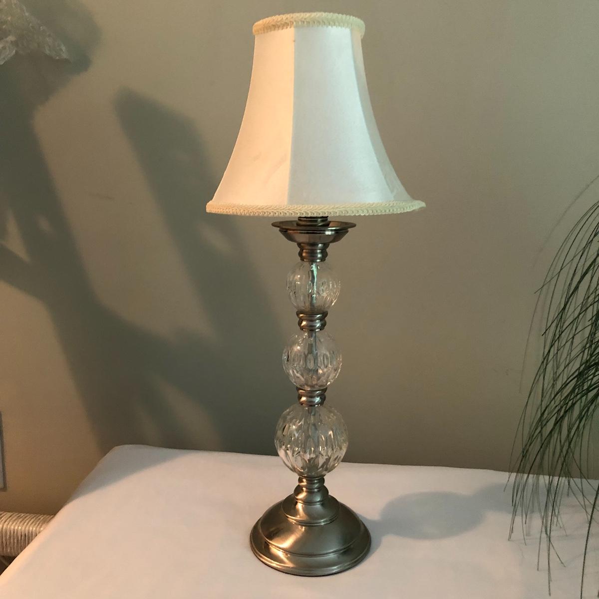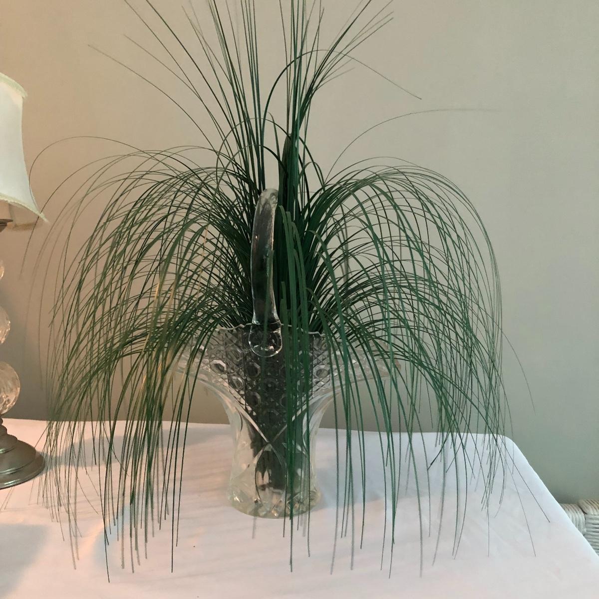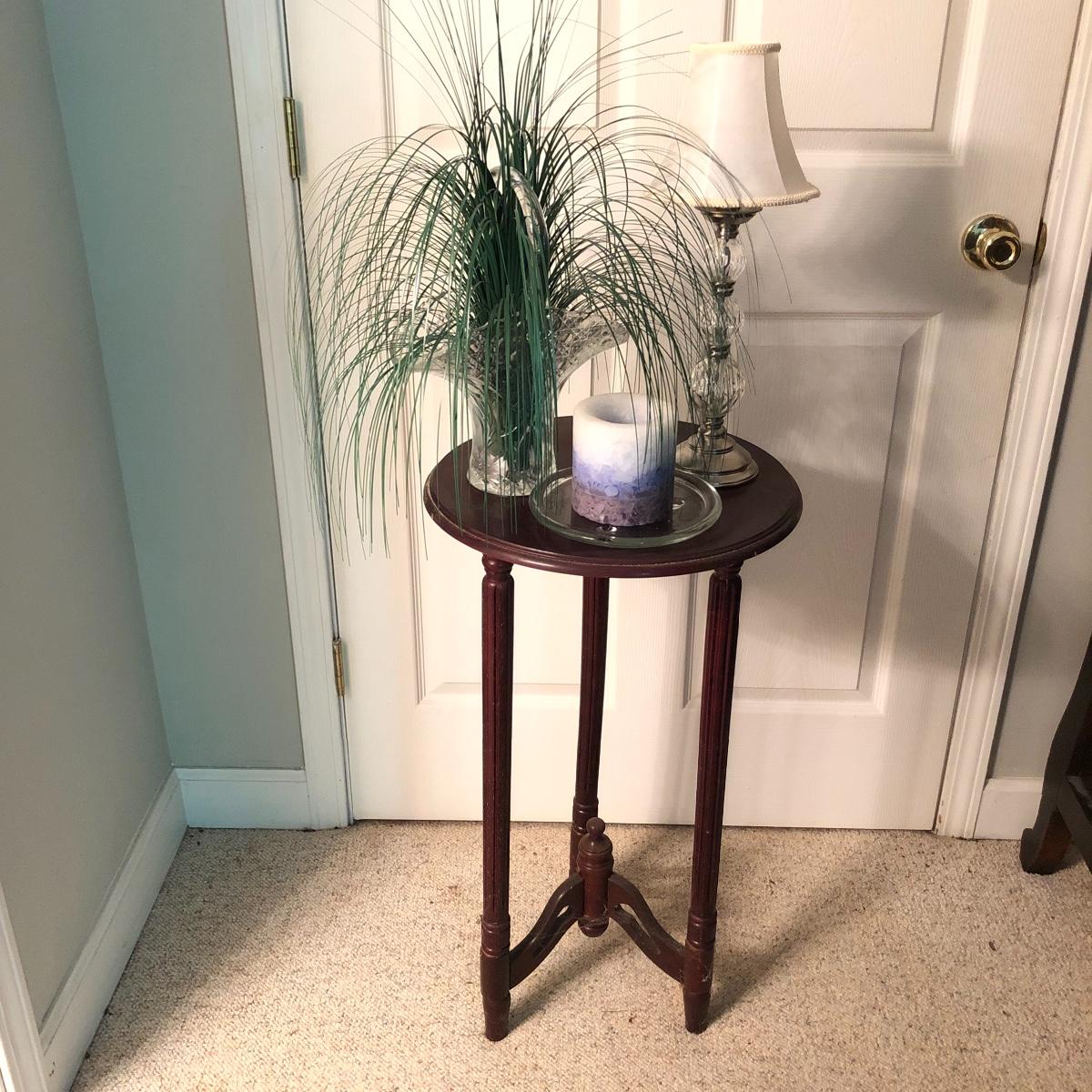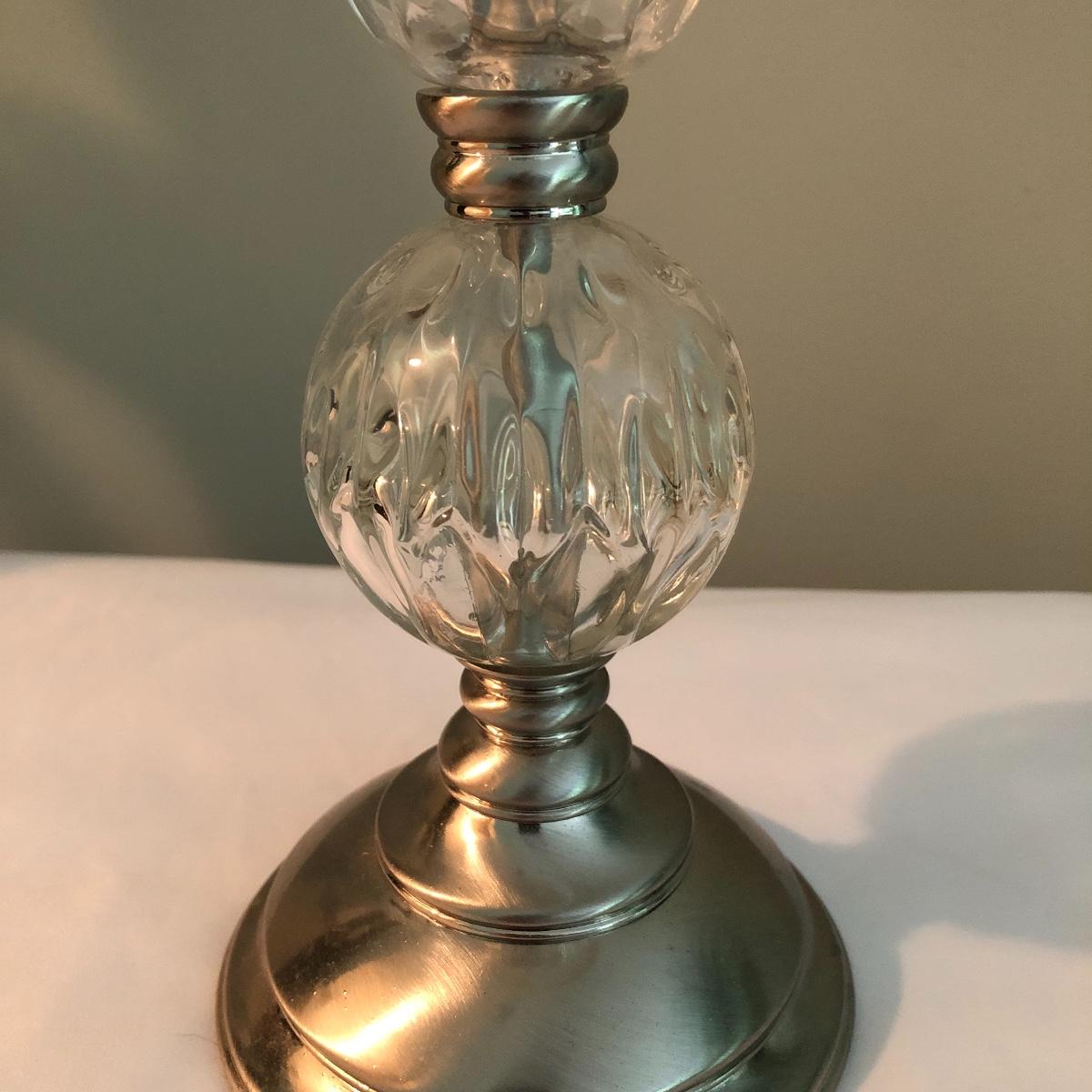 This elegant end table is ideal for displaying a special plant, vase of flowers or a lamp; it’s a lightweight piece that feels like it may be MDF, it does have a small blemish on the table surface. Also included is a glass basket style vase that currently is home to a faux grass plant, a couple of candles, small ceramic plant pot and a precious glass and metal candle holder that looks like a lamp and has a small ivory shade.