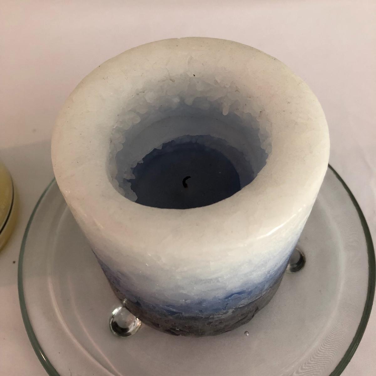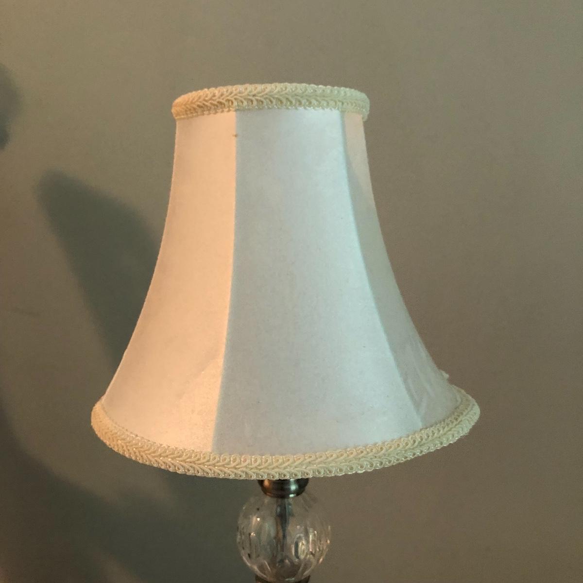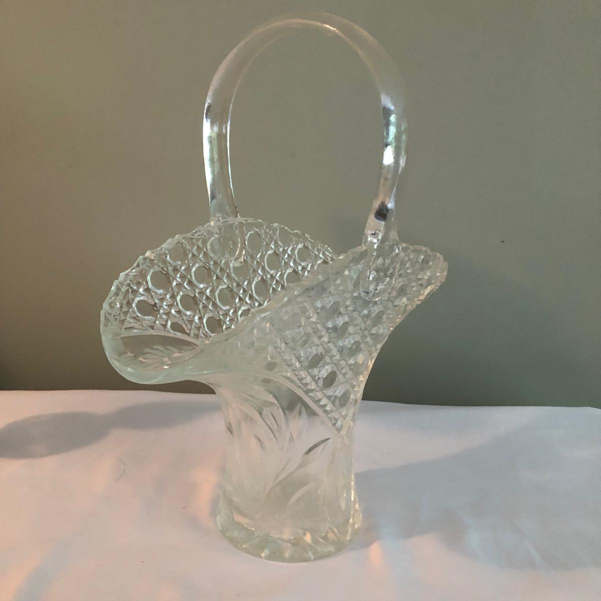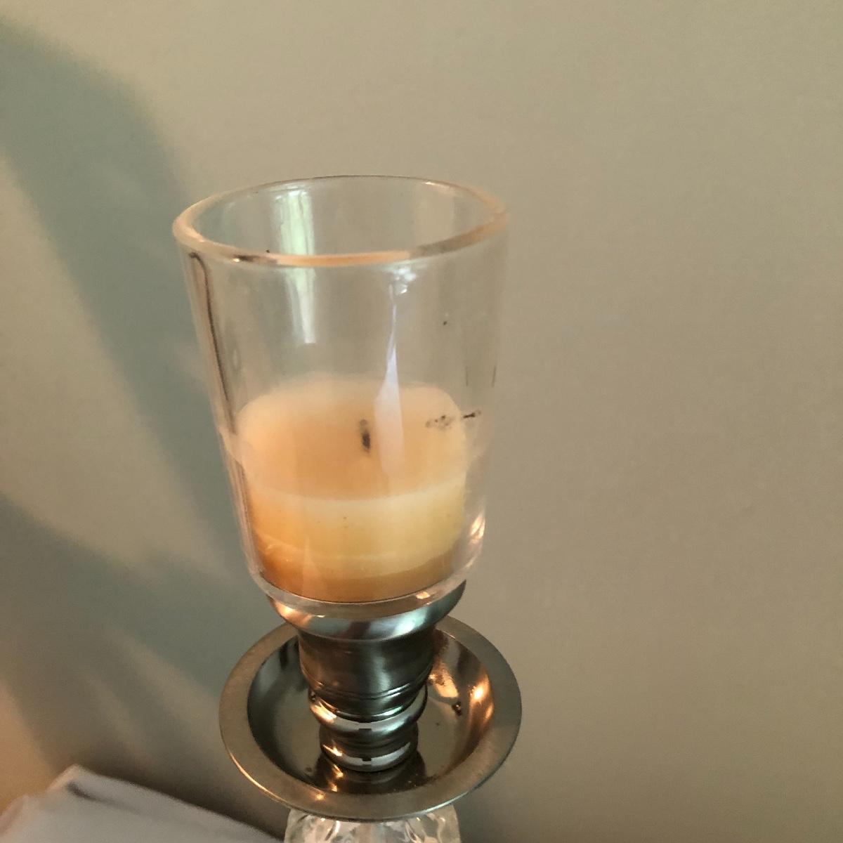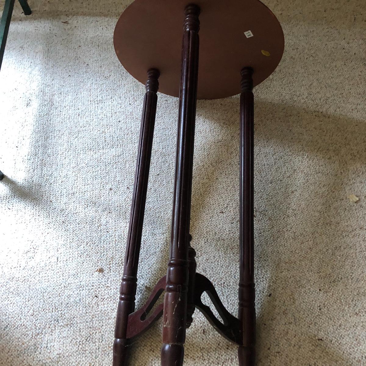 This elegant end table is ideal for displaying a special plant, vase of flowers or a lamp; it’s a lightweight piece that feels like it may be MDF, it does have a small blemish on the table surface. Also included is a glass basket style vase that currently is home to a faux grass plant, a couple of candles, small ceramic plant pot and a precious glass and metal candle holder that looks like a lamp and has a small ivory shade.