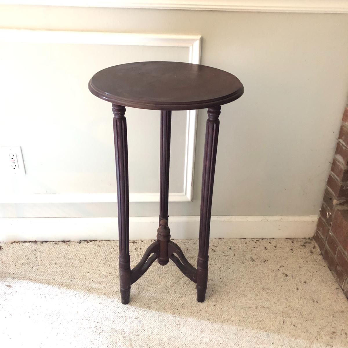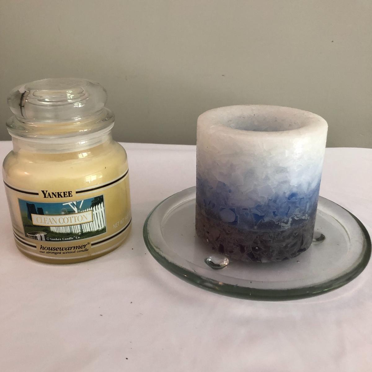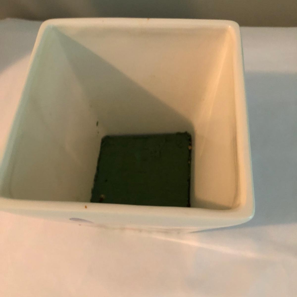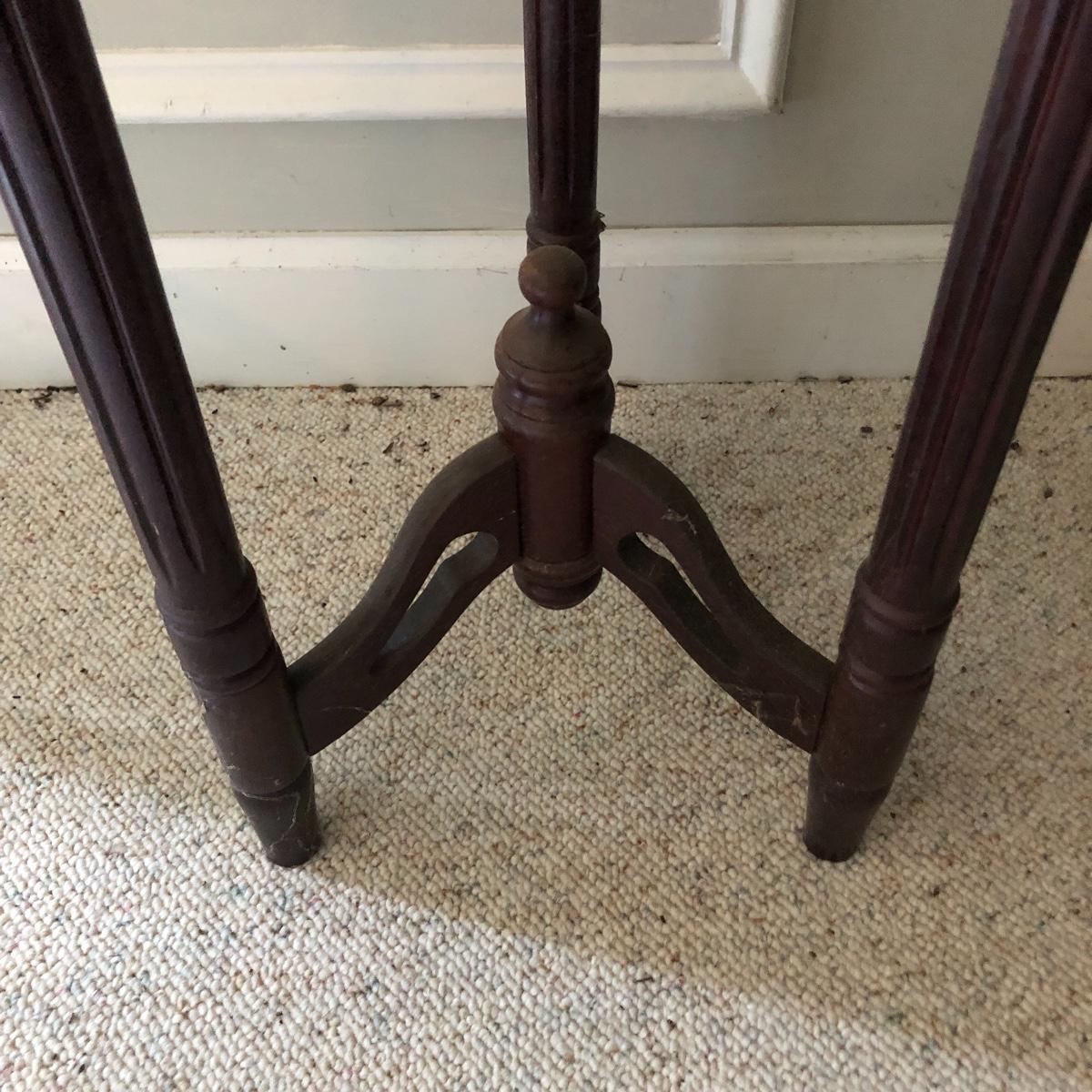 This elegant end table is ideal for displaying a special plant, vase of flowers or a lamp; it’s a lightweight piece that feels like it may be MDF, it does have a small blemish on the table surface. Also included is a glass basket style vase that currently is home to a faux grass plant, a couple of candles, small ceramic plant pot and a precious glass and metal candle holder that looks like a lamp and has a small ivory shade.