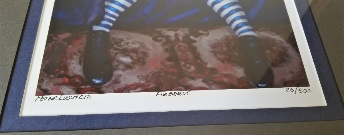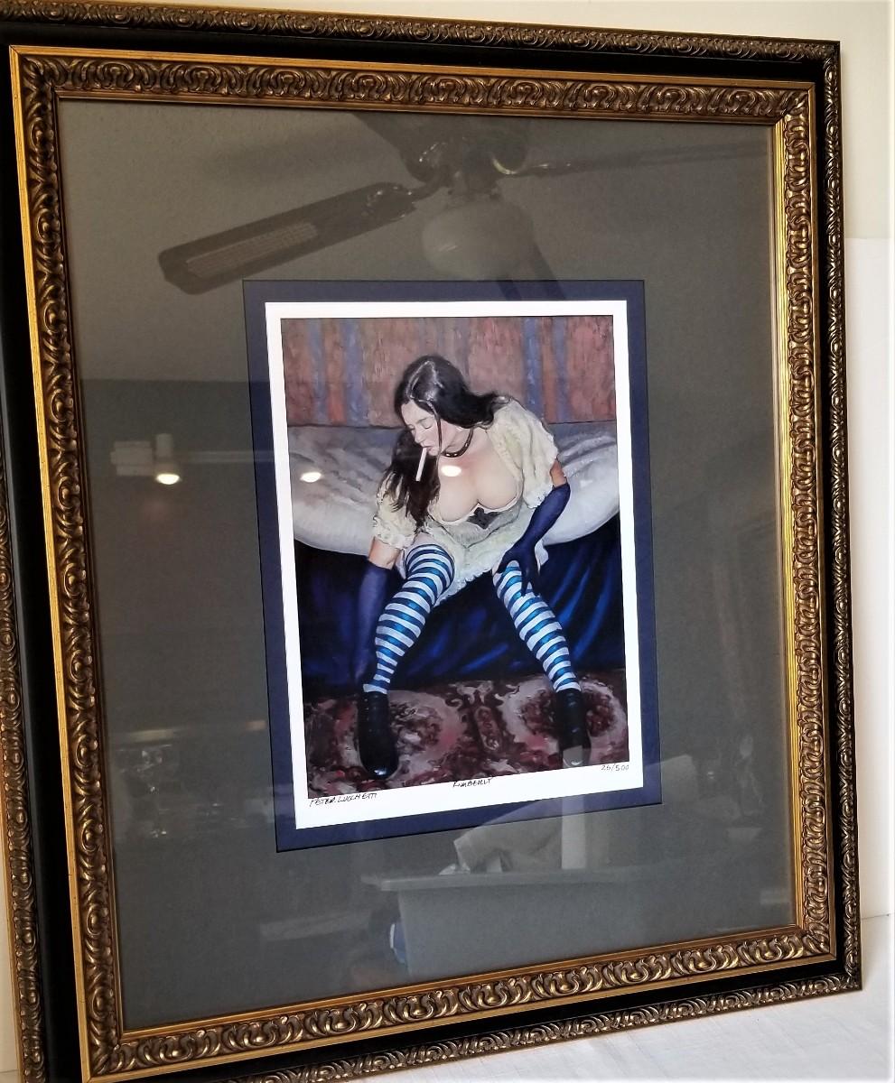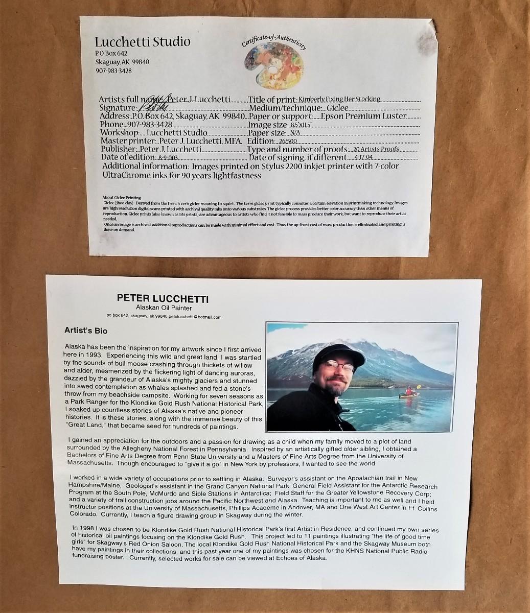 Signed/numbered 26/500 giclee print from listed Alaska artist Peter Lucchetti "Kimberly fixing her stocking". Done in 2004 (series retired). 22" across, 25.25" tall. Nicely framed with double mat. Provenance on reverse.