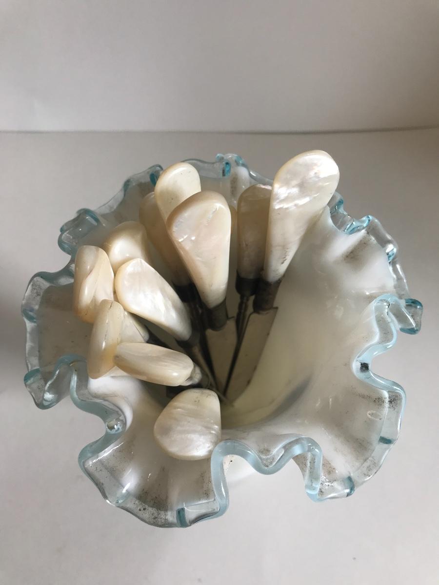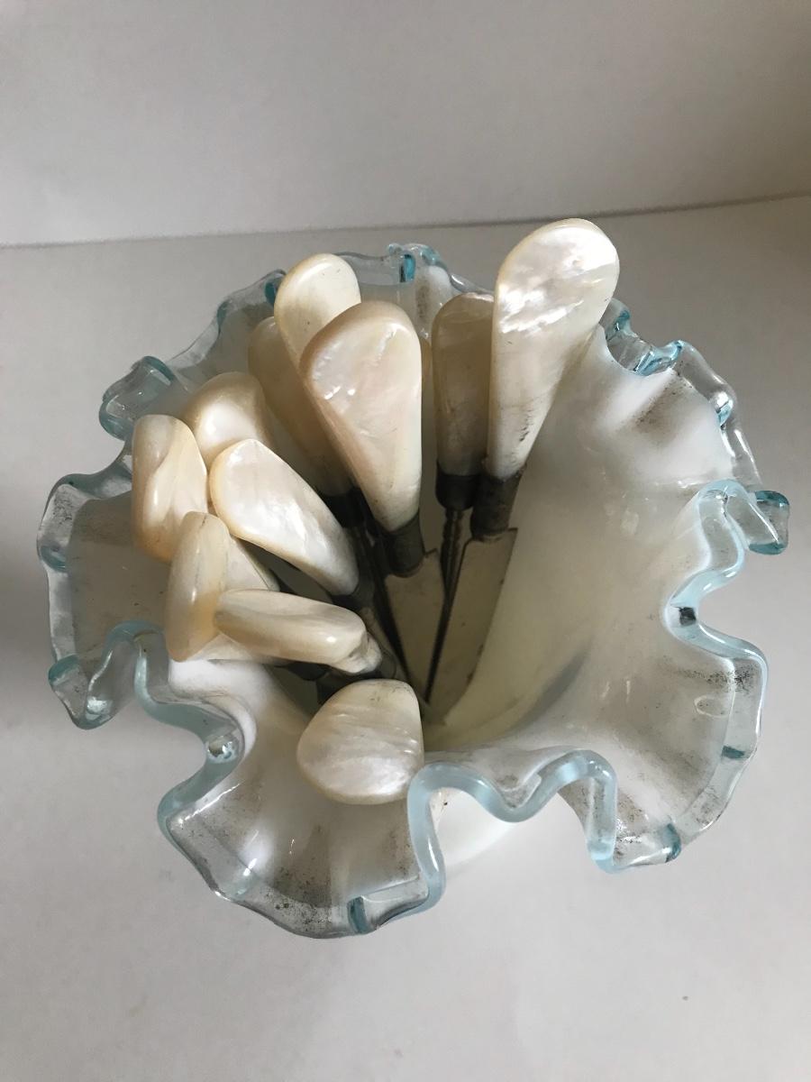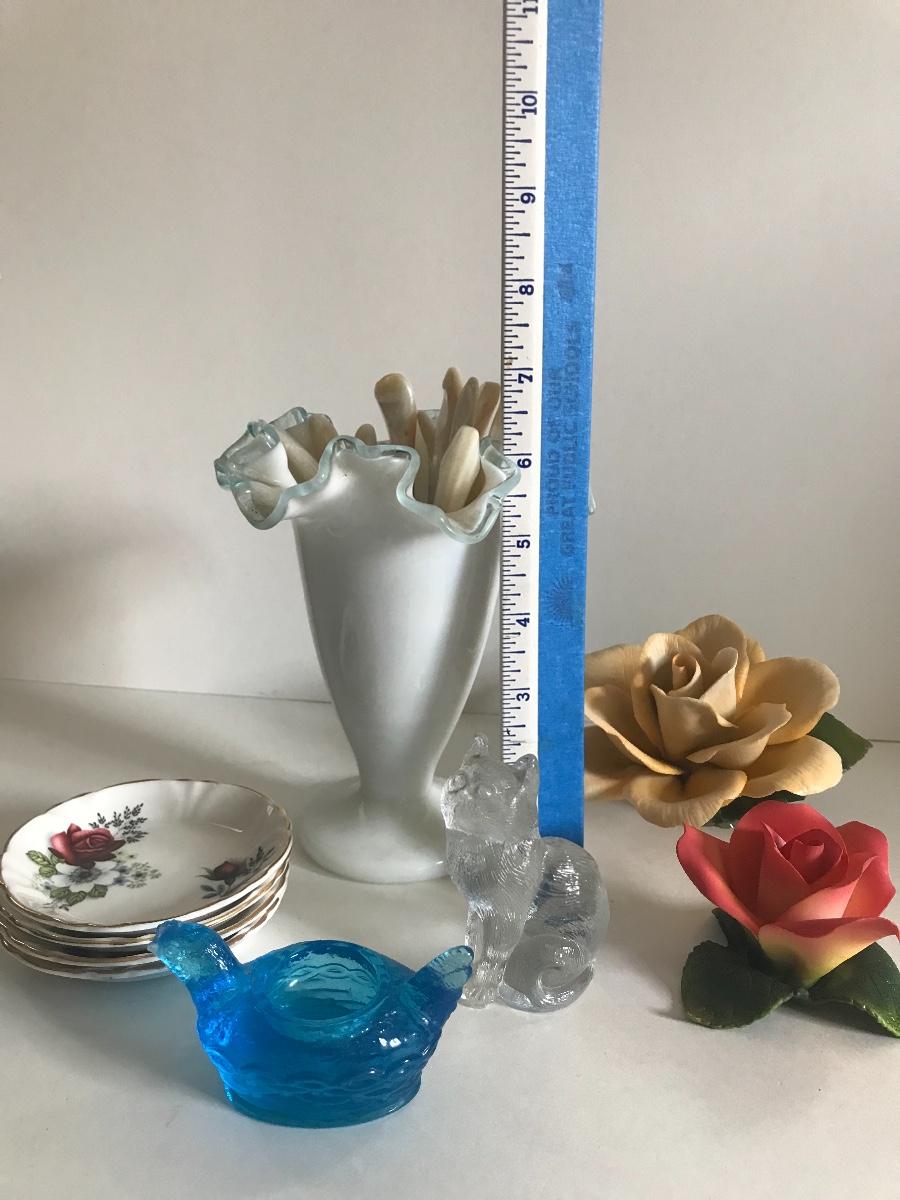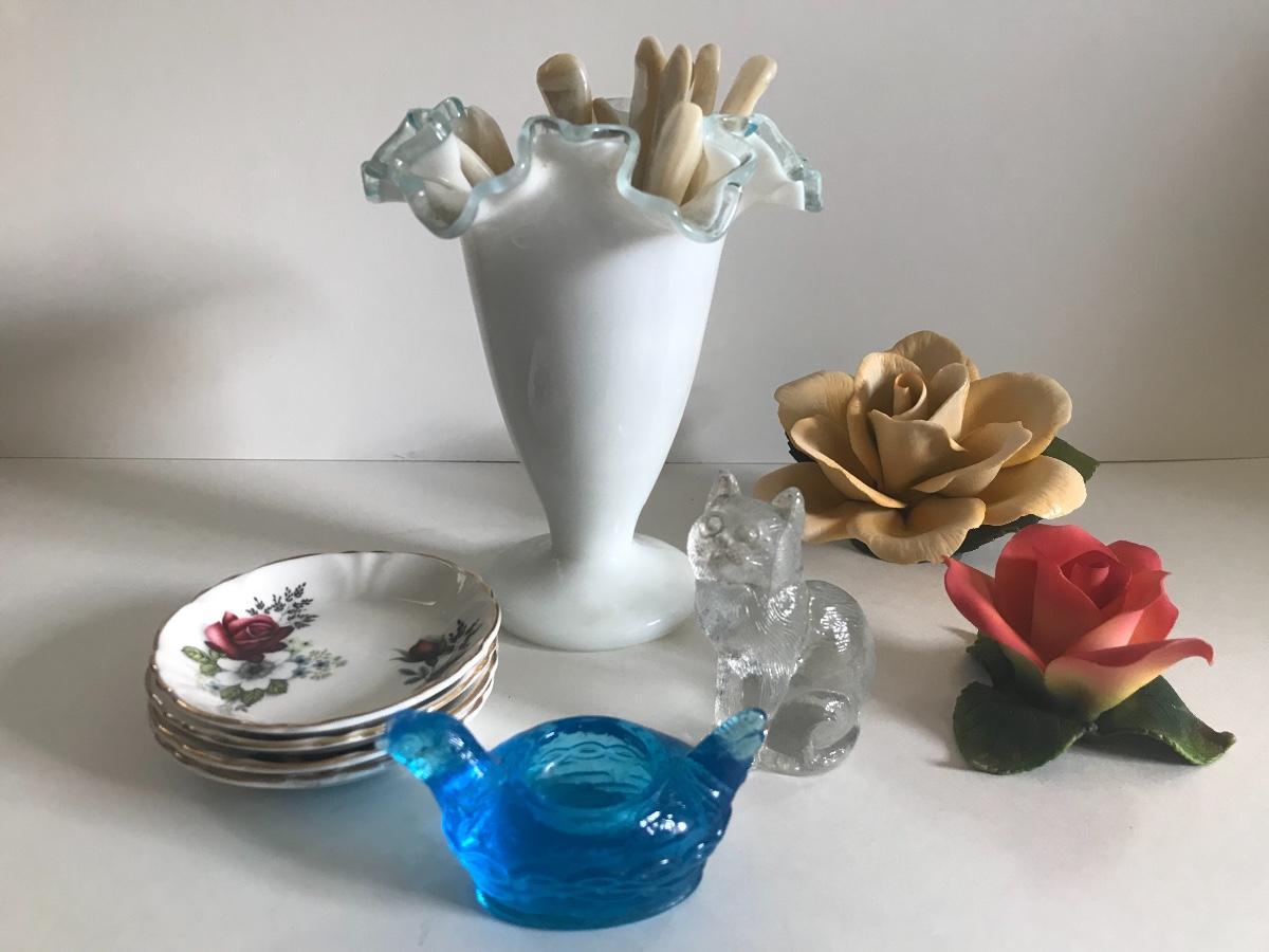Glass cat and chicken, Capodimonte Napolian porcelain flowers, Hammersley butter pat plates, a glass Fenton, ruffled top vase, and mother of pearl and sterling handled flatware. Please see all pictures as they are the best representation of the items. The pictures show condition, measurements if taken, and what is included in the lot. Due to the large amount that we photograph and the time frame, we are not always able to take measurements. All items unless noted, are pre-owned and have been used. If you purchased furniture, you must bring help. We do not allow one person to carry large furniture out on their own. Bring help, tools and a truck for the safety of our client’s homes, and your personal safety. Company policy. Thank you.