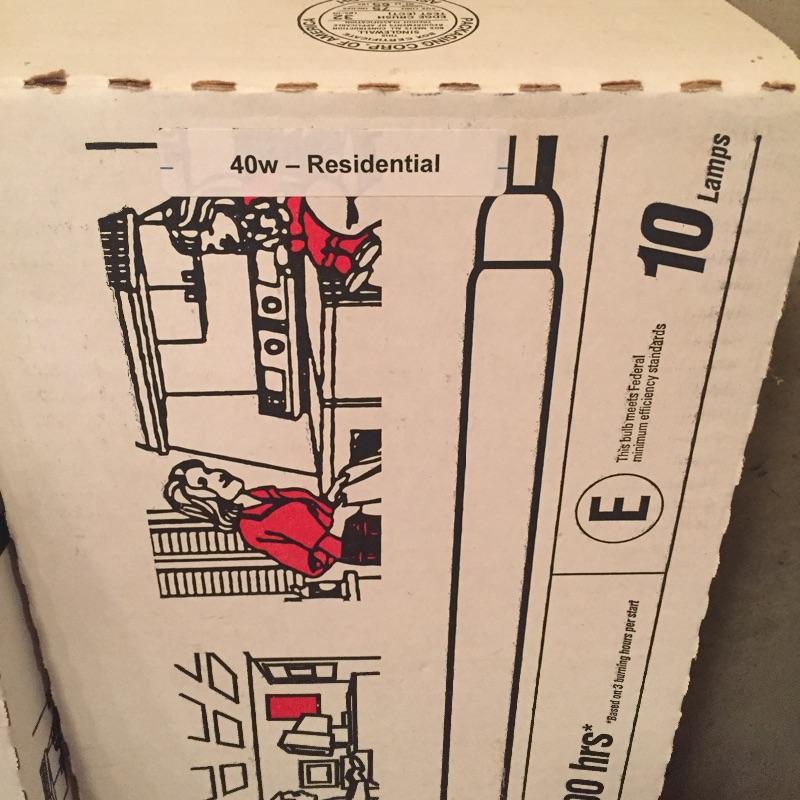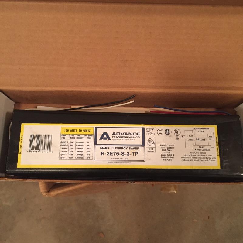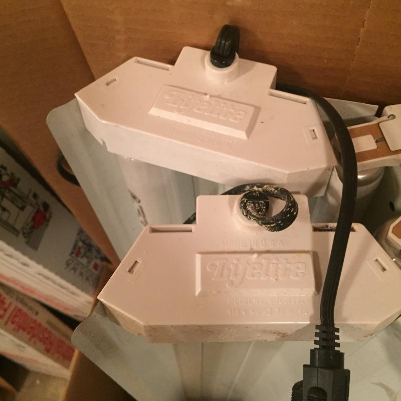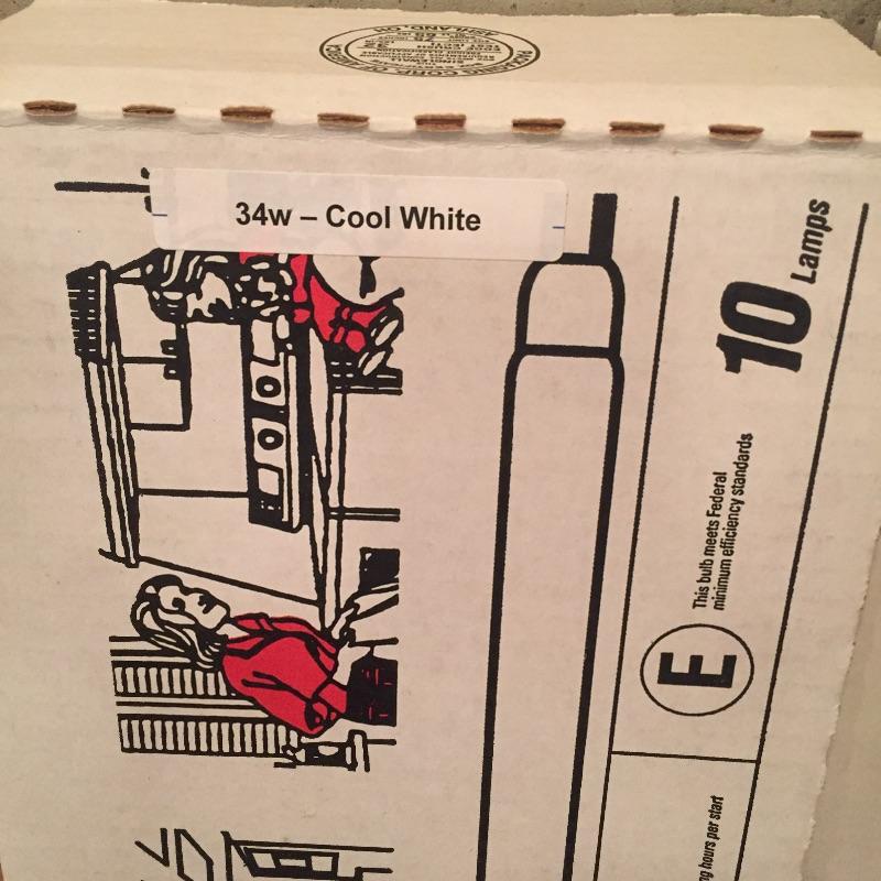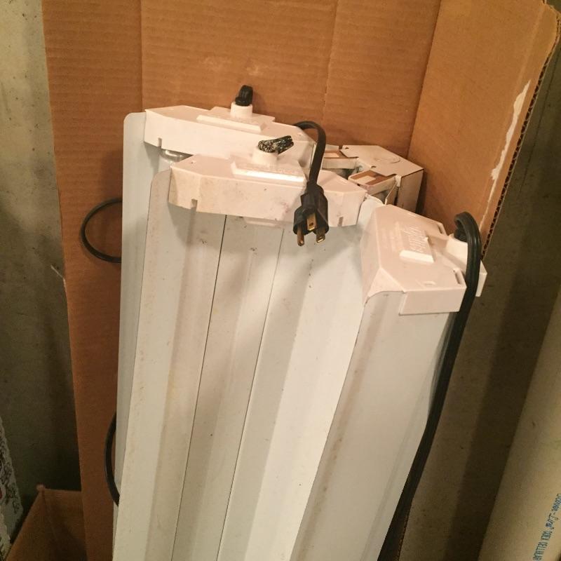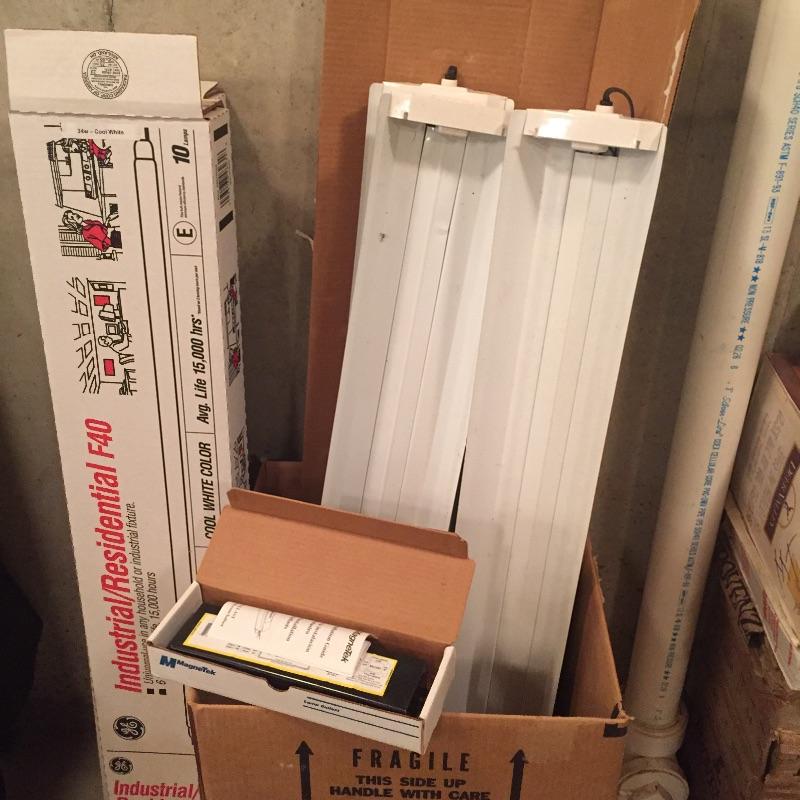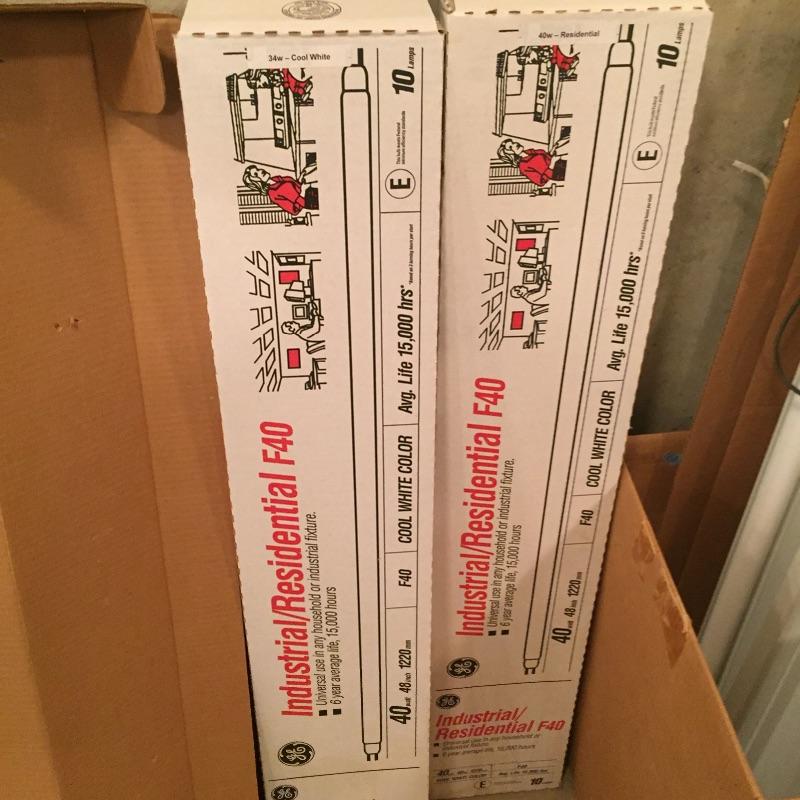 Four hanging fluorescent 48” light fixtures with twenty new in box bulbs and one ballast. Light up your life or workshop with this lot.
