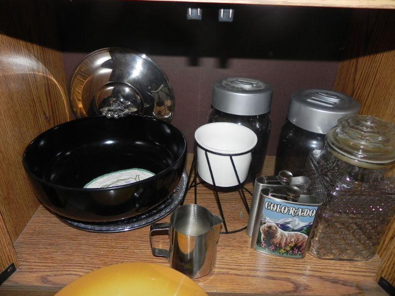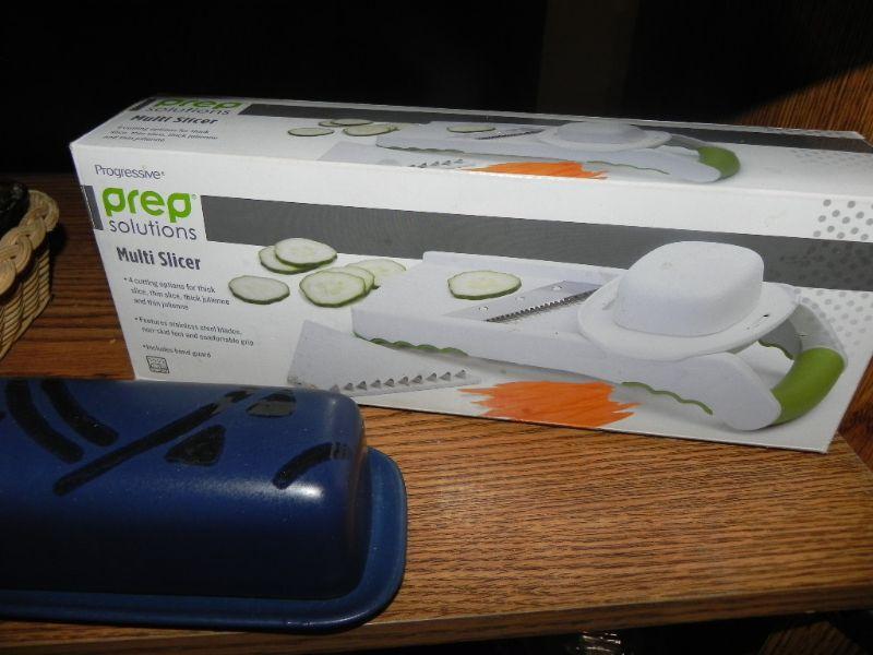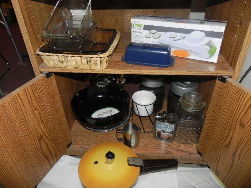 PRESSURE COOKER POT, GLASS BAKING PAN, BUTTER DISH, MULTI SLICER (NIB) MICROWAVE CART ON CASTORS AND MORE
