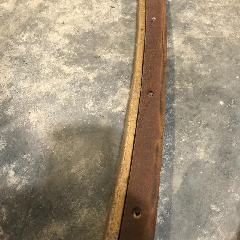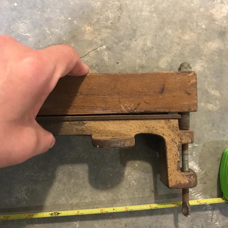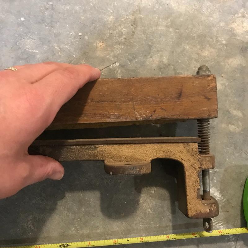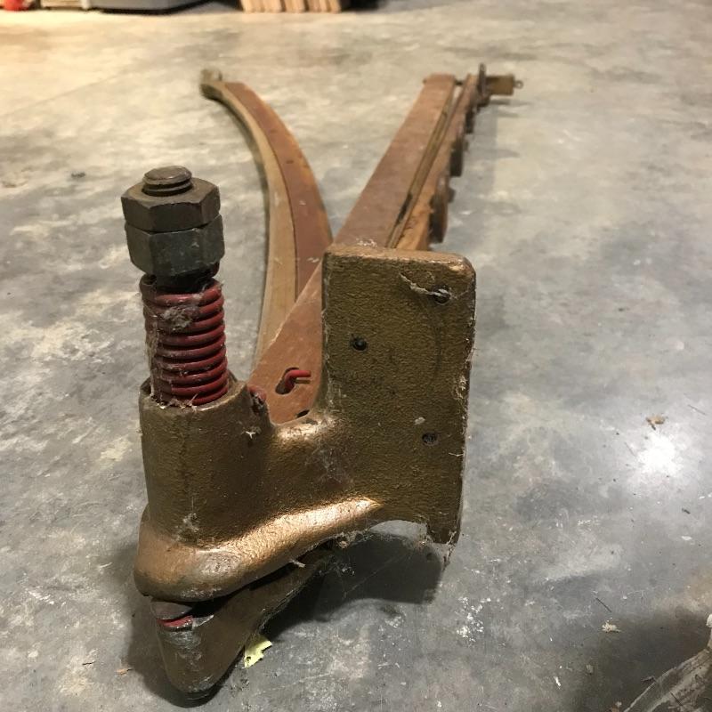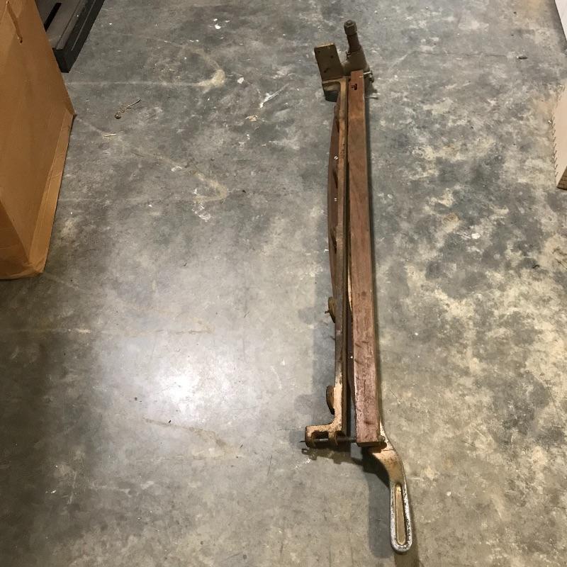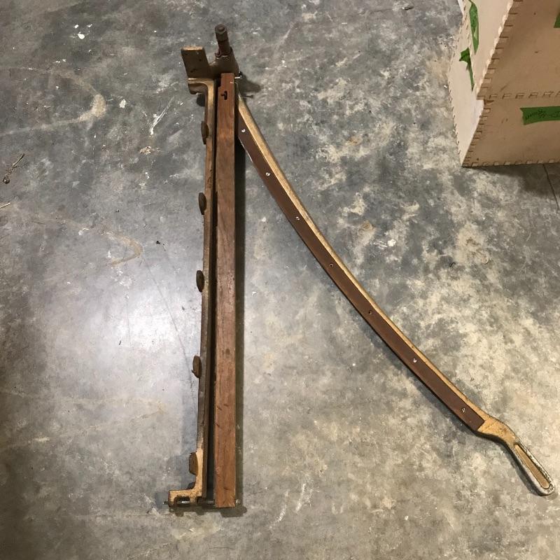 Large metal cutter is approximately 41.5” long! Five metal brackets to attach the cutter to surface and a wood guard on a spring. Piece appears very sturdy and in good condition. Blade is missing two screws, which seems to be from sharpening the blade and also an easy fix. Local pick up only.