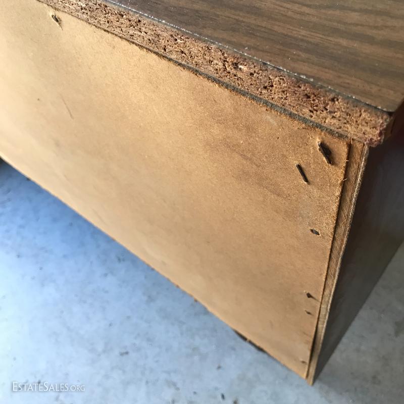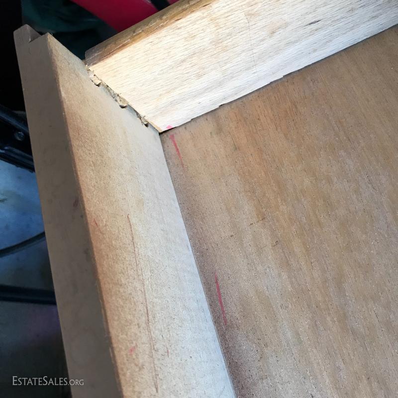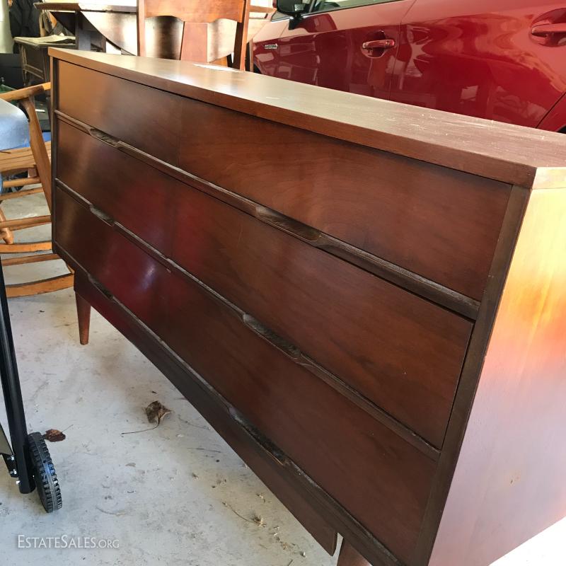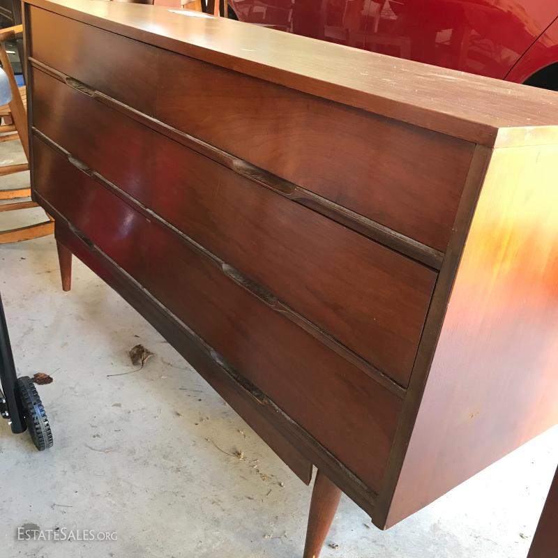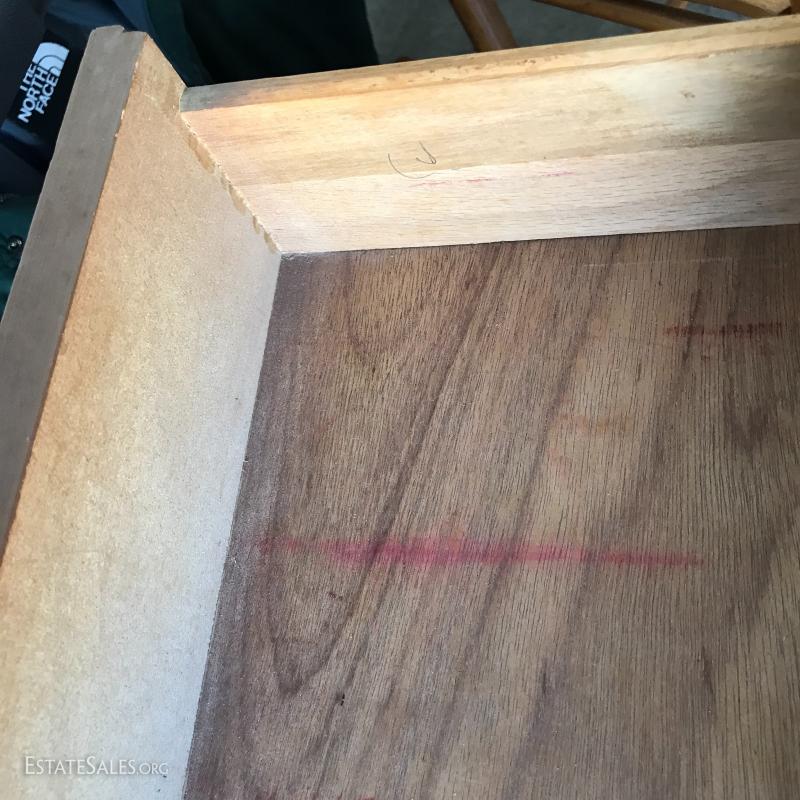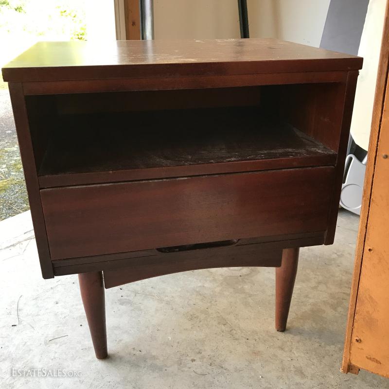 Two pretty pieces. Dresser leg broken and in need of repair. 54"l x 18"w x 30.5h. Bedside table in good shape but dirty, 22"l x 16.5"w x 23"h. See photos for details.