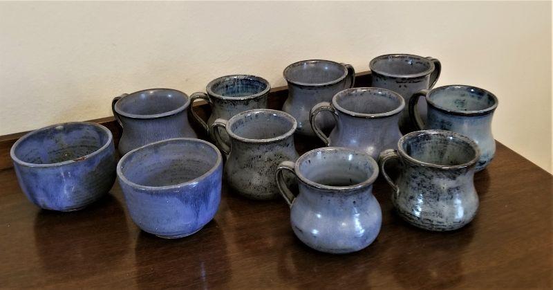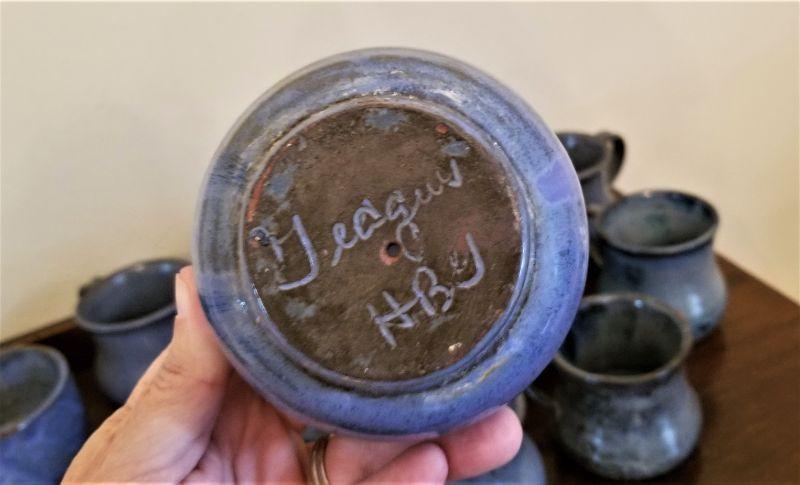 You get 9 pieces (8 cups, 1 bowl) of Teague North Carolina Art pottery. Good condition. There are 10 pieces in this photo - we discovered one piece had a large crack, so we removed it from the auction.
