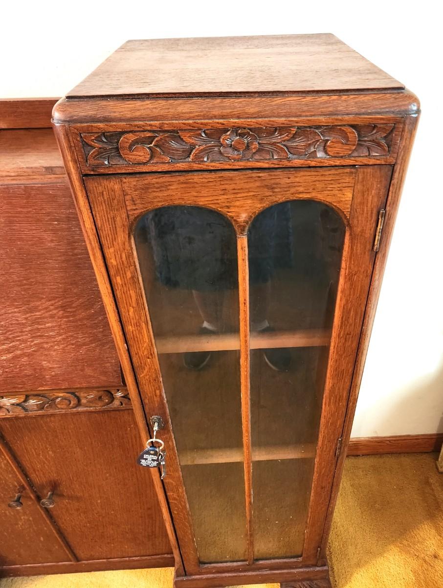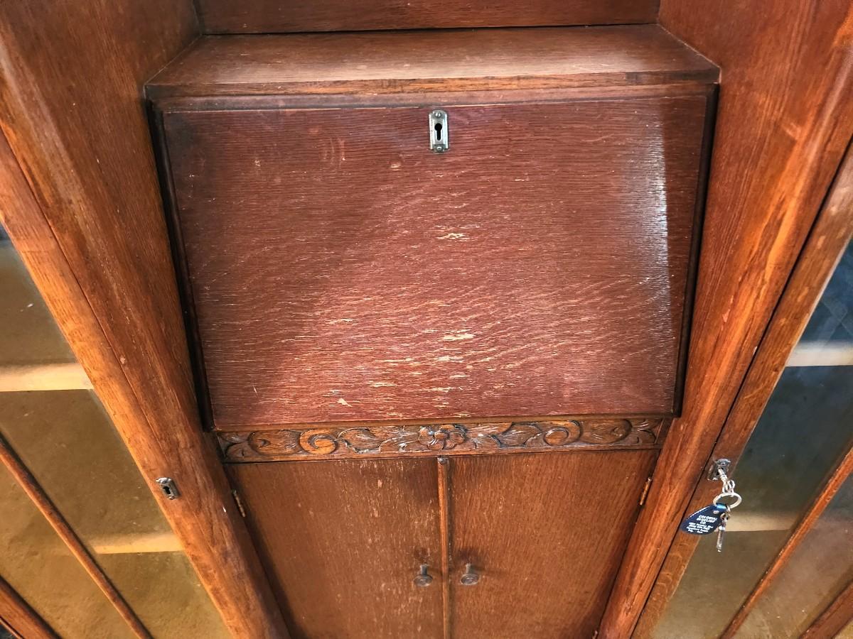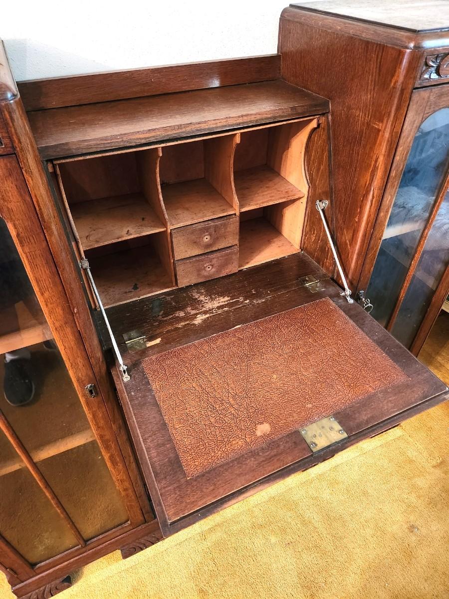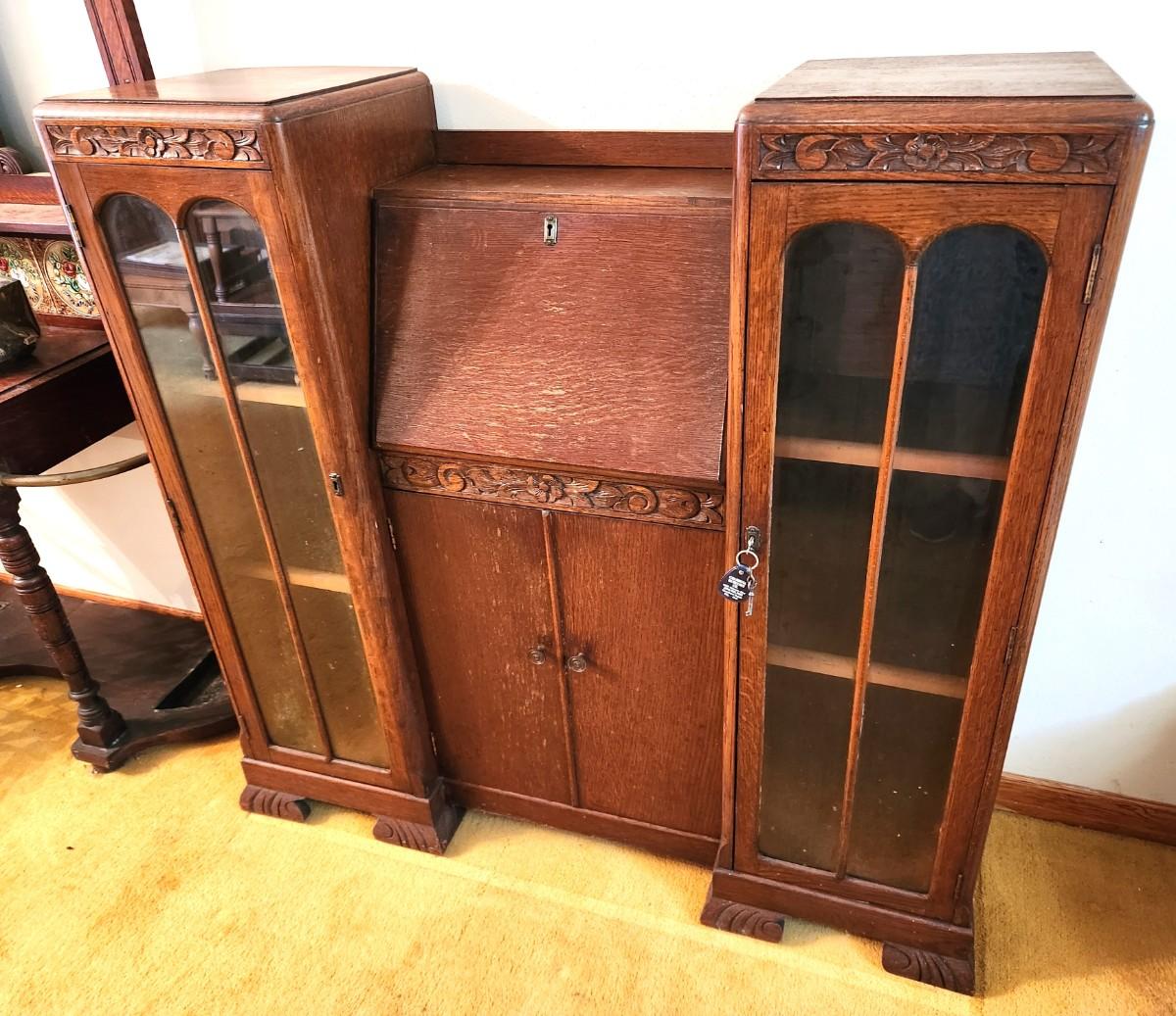 Isn't this a BEAUTY? Solid oak - Art Nouveau styling - carved decorative accents - center drop leaf desk with bookcases on either side. 2 keys. 14" deep, 47" across, 47" tall. Anyone want?