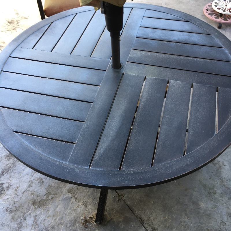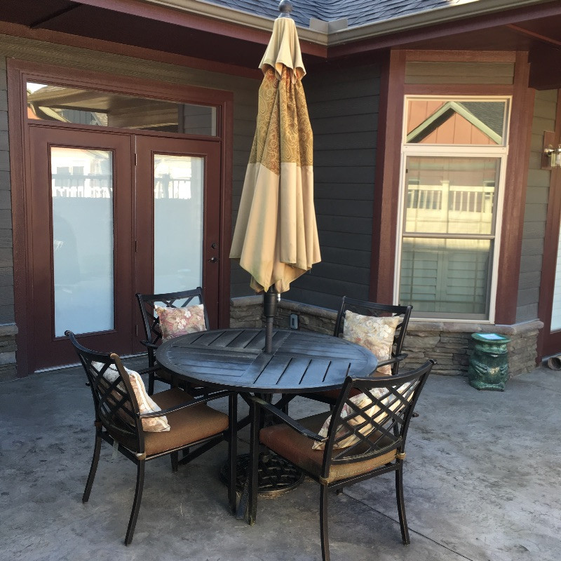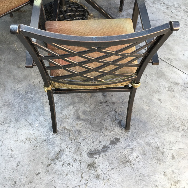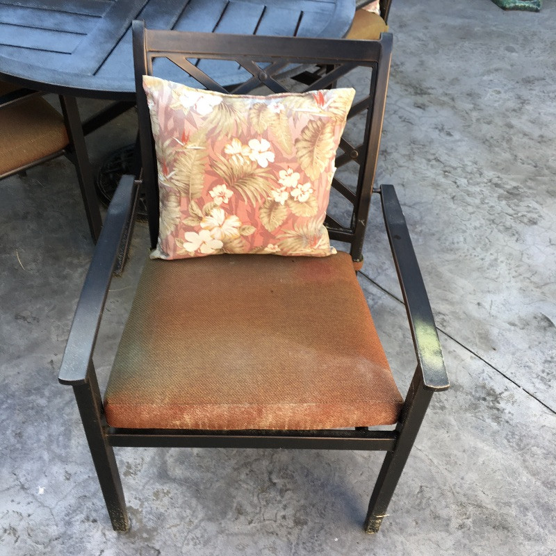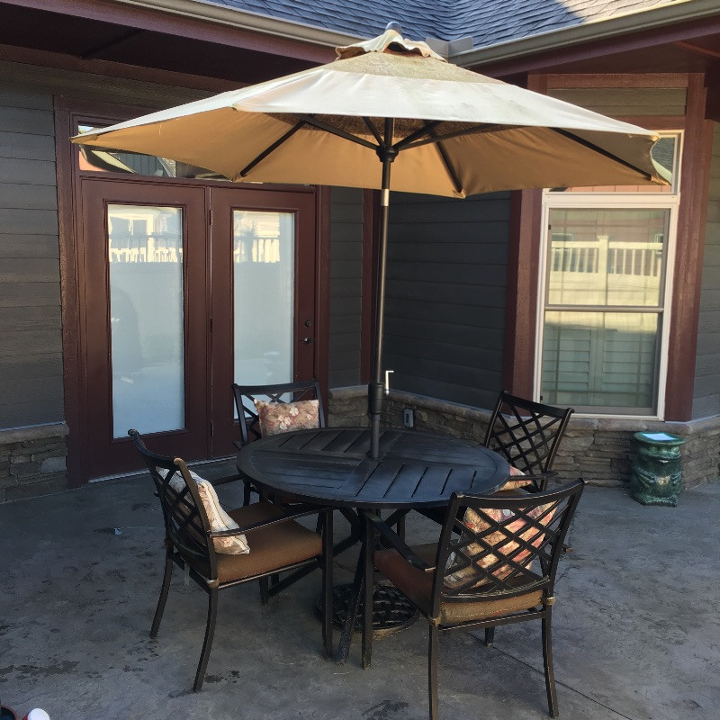 You will have it made in the shade if you win this great patio set. Patio set includes table, four chairs with cushions and umbrella with stand. Everything just needs a good clean up to its former glory. Table measures 48”D x 28” tall and chairs measure 22.5” x 24.5” x 34” with a 20” seat height.