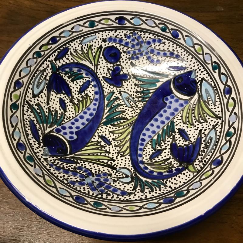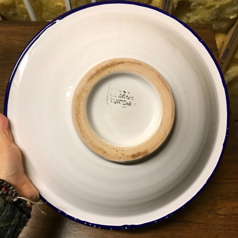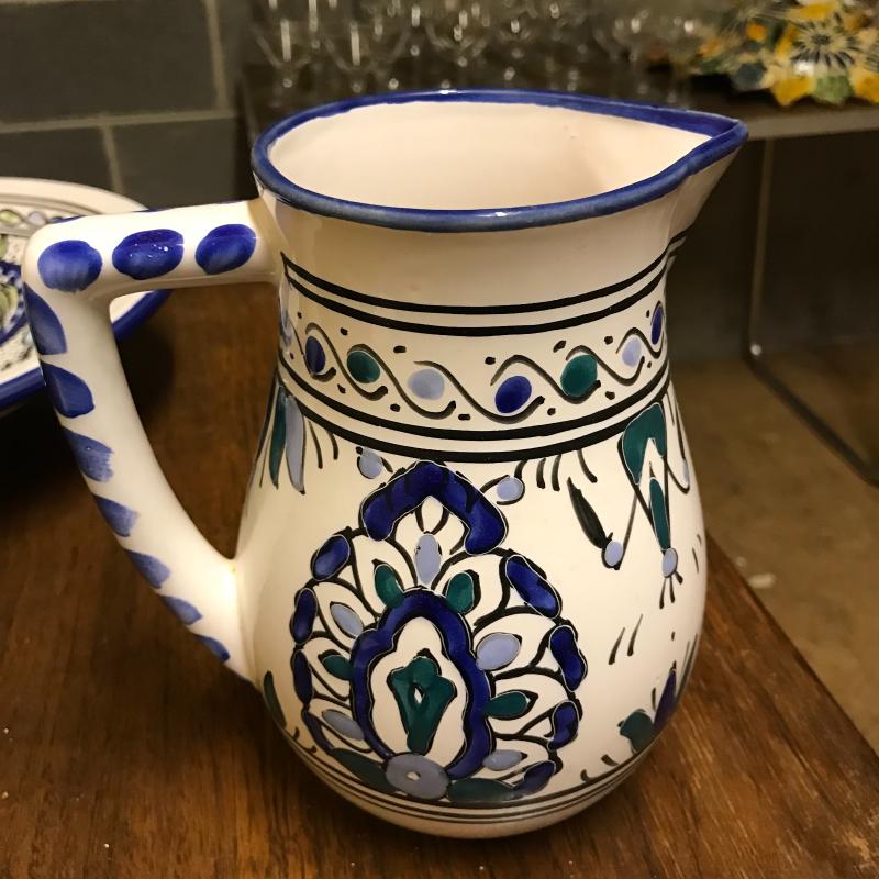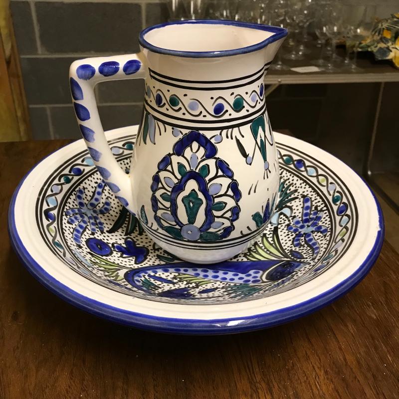 This pitcher and bowl set is hand-painted and predominantly blue and white. Pitcher is 8” tall, bowl is 13” in diameter.