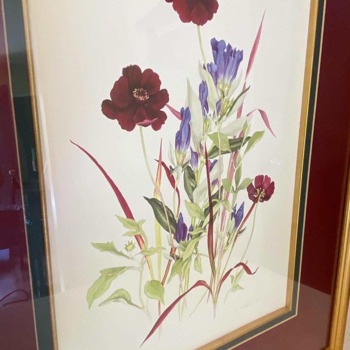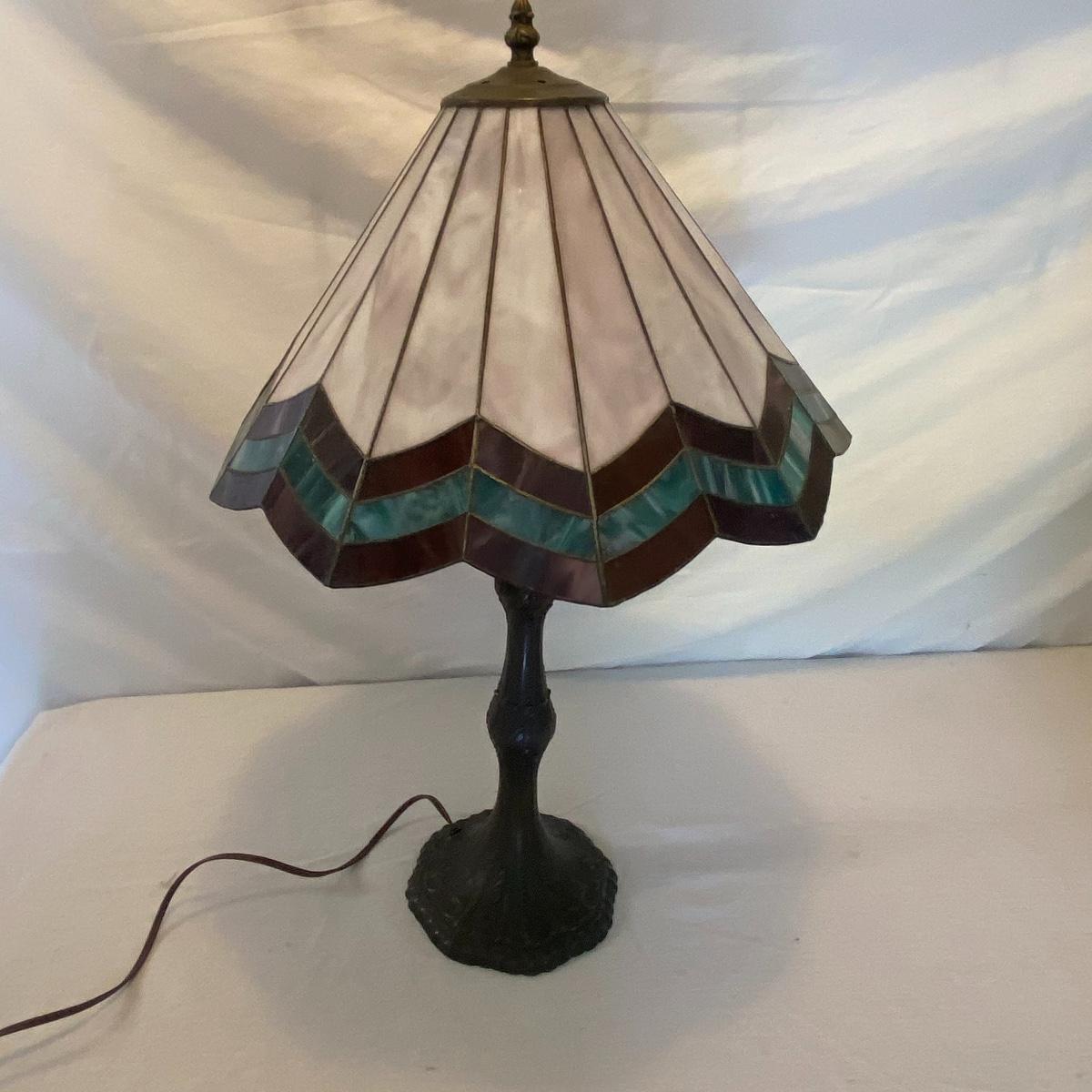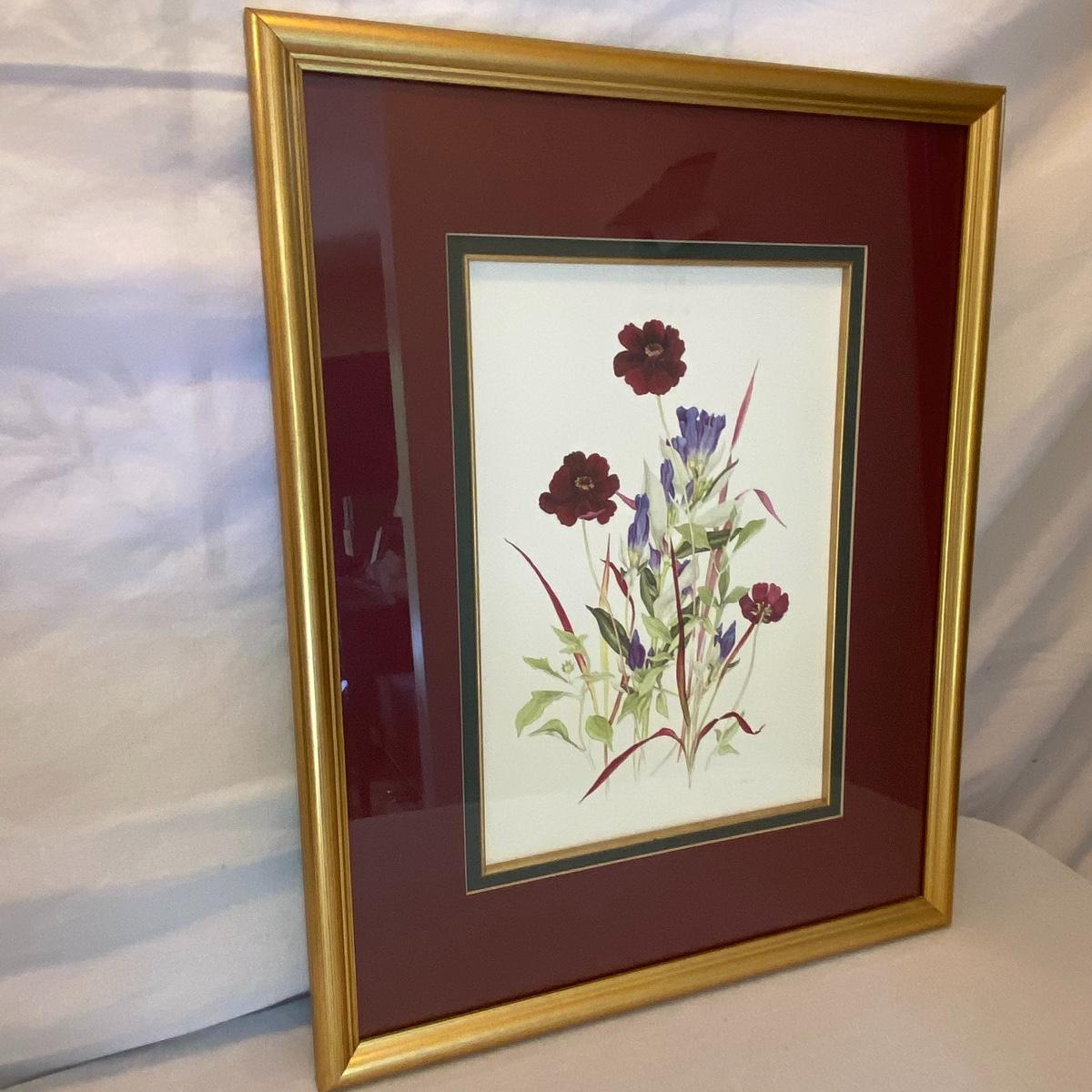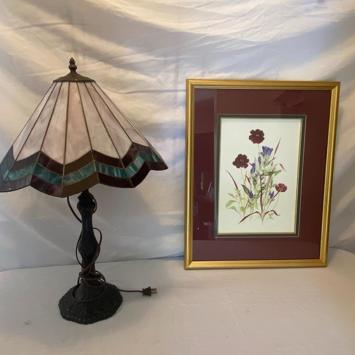 Lot includes signed floral art, matted and framed measuring 18.5”x23.5”. Heavyweight metal lamp with stunning stained glass lamp stands approximately 23” tall, turned on when tested. See photos for details. Local pickup only