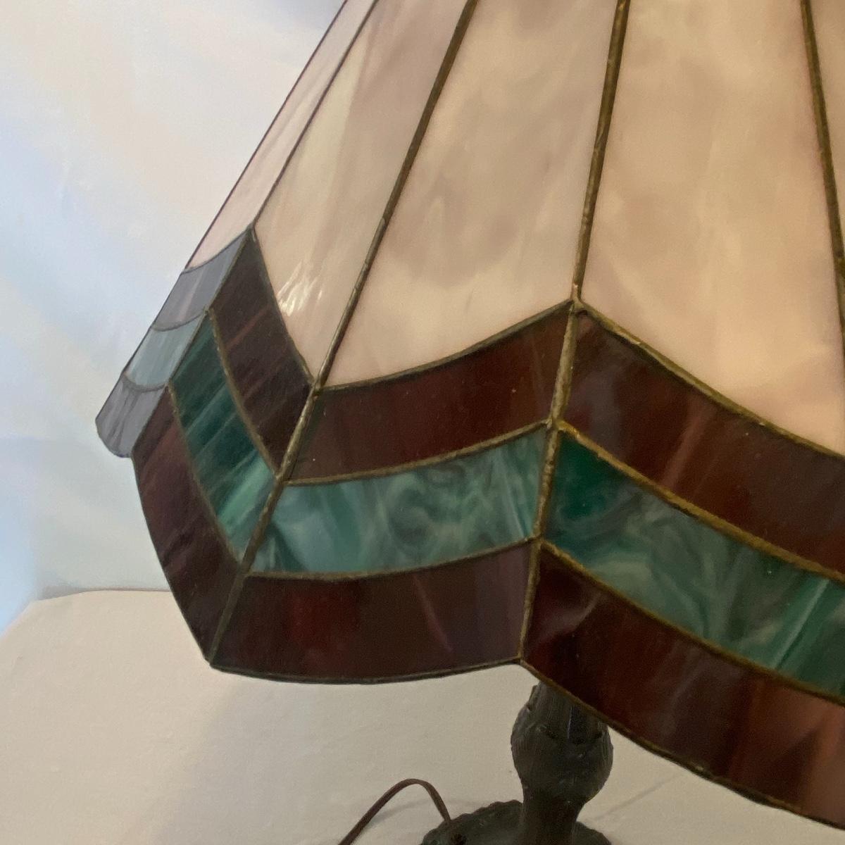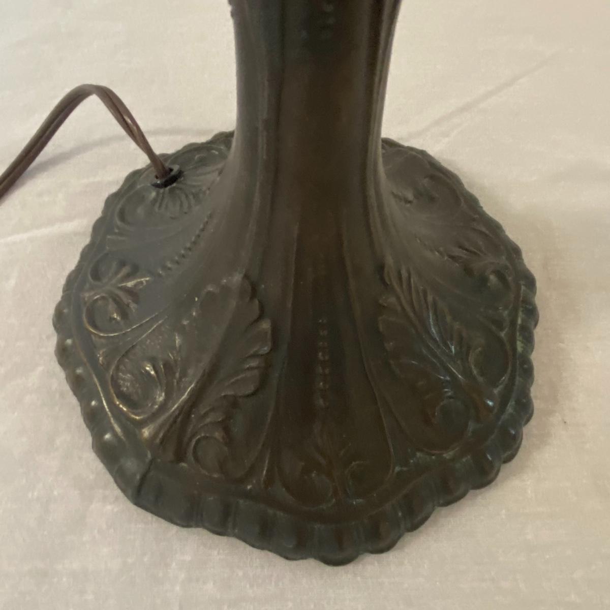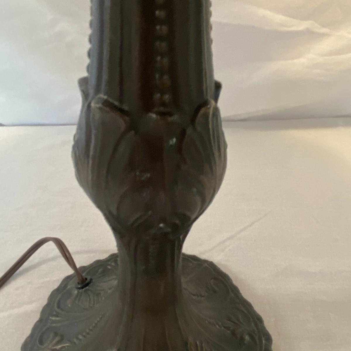 Lot includes signed floral art, matted and framed measuring 18.5”x23.5”. Heavyweight metal lamp with stunning stained glass lamp stands approximately 23” tall, turned on when tested. See photos for details. Local pickup only