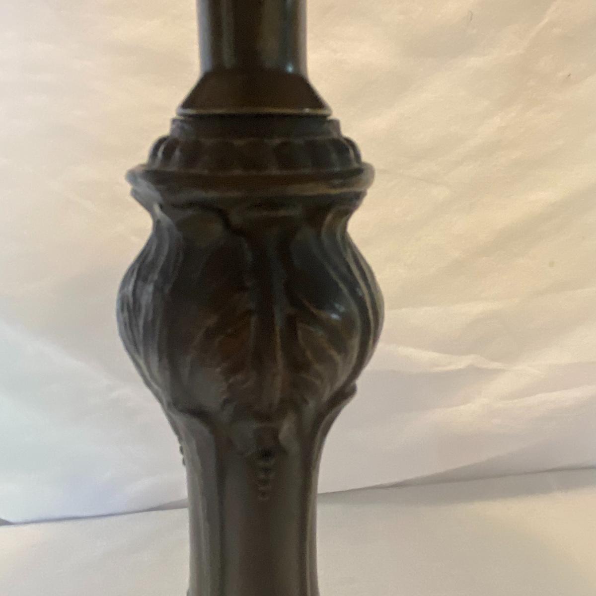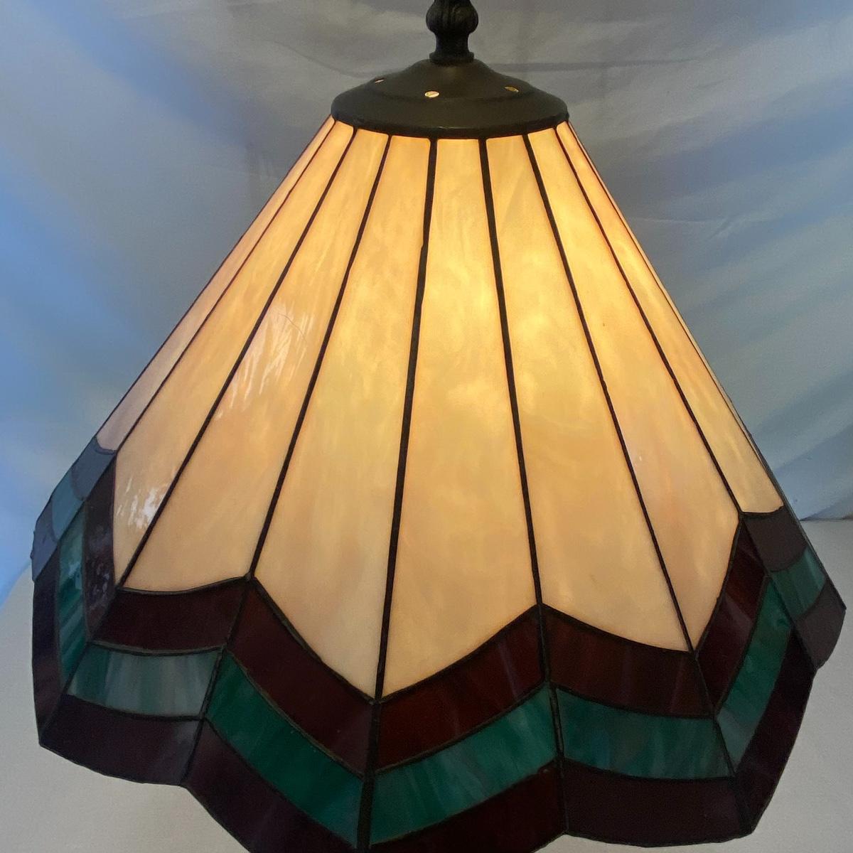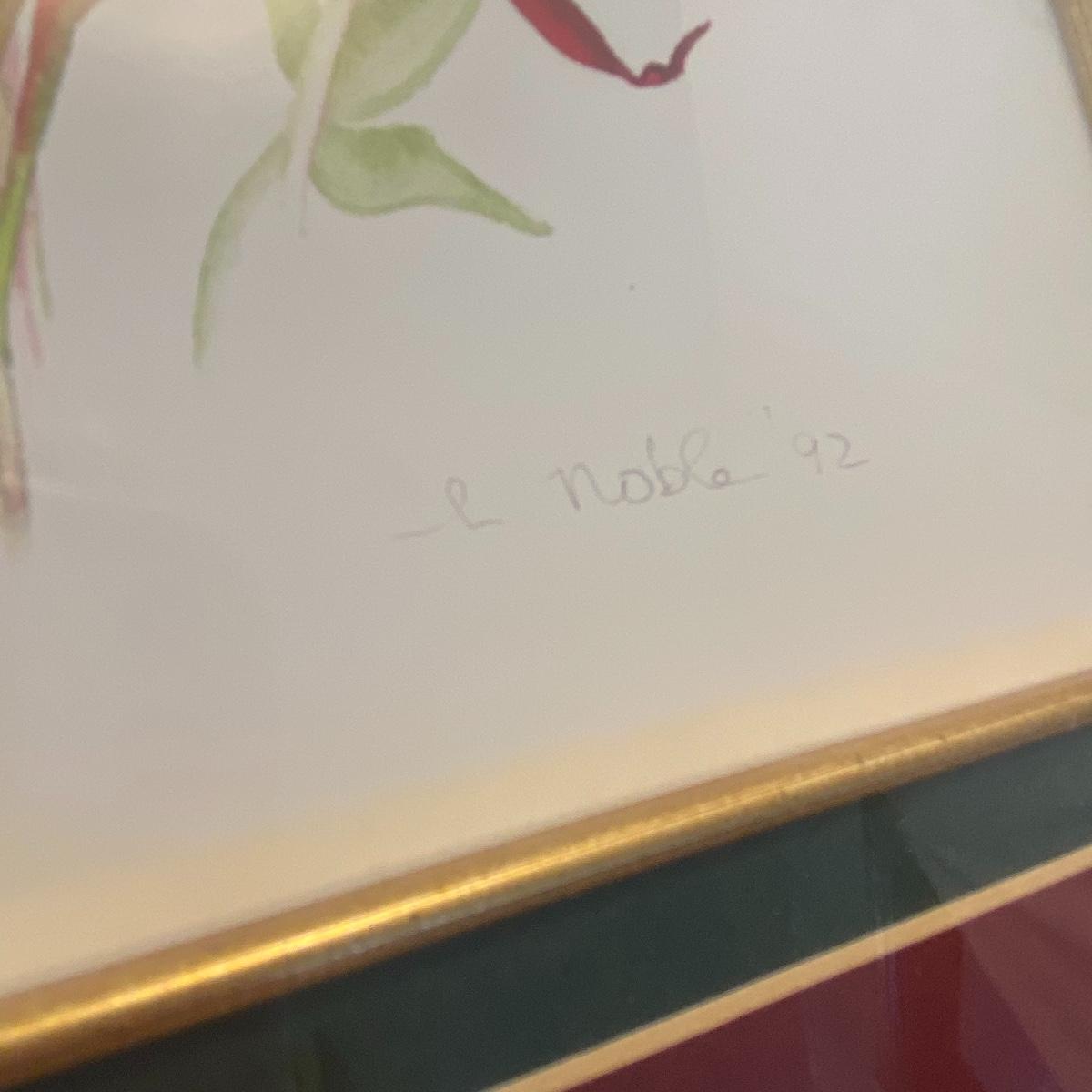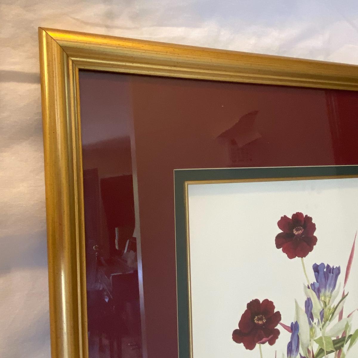 Lot includes signed floral art, matted and framed measuring 18.5”x23.5”. Heavyweight metal lamp with stunning stained glass lamp stands approximately 23” tall, turned on when tested. See photos for details. Local pickup only