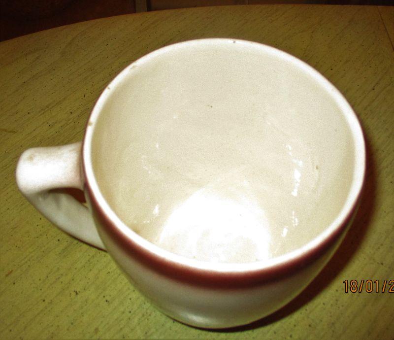 This mug is 7.75" tall and if you fill it and drain it, make sure that you're not going on a long car trip soon after! There is a small rim chip but otherwise it is in great shape.