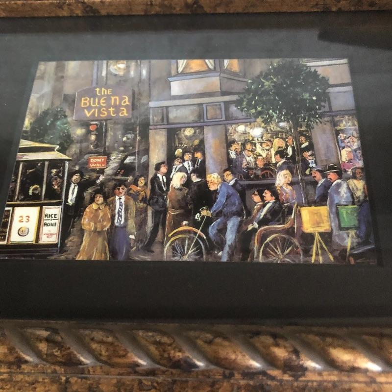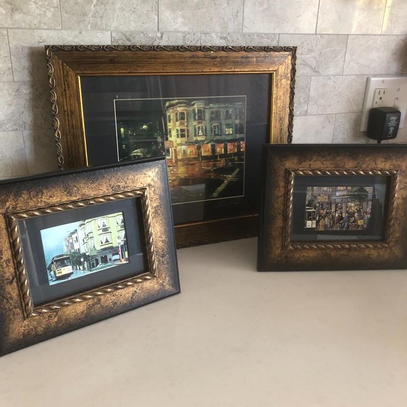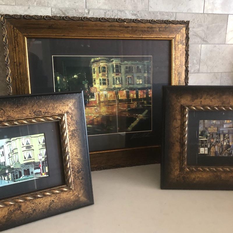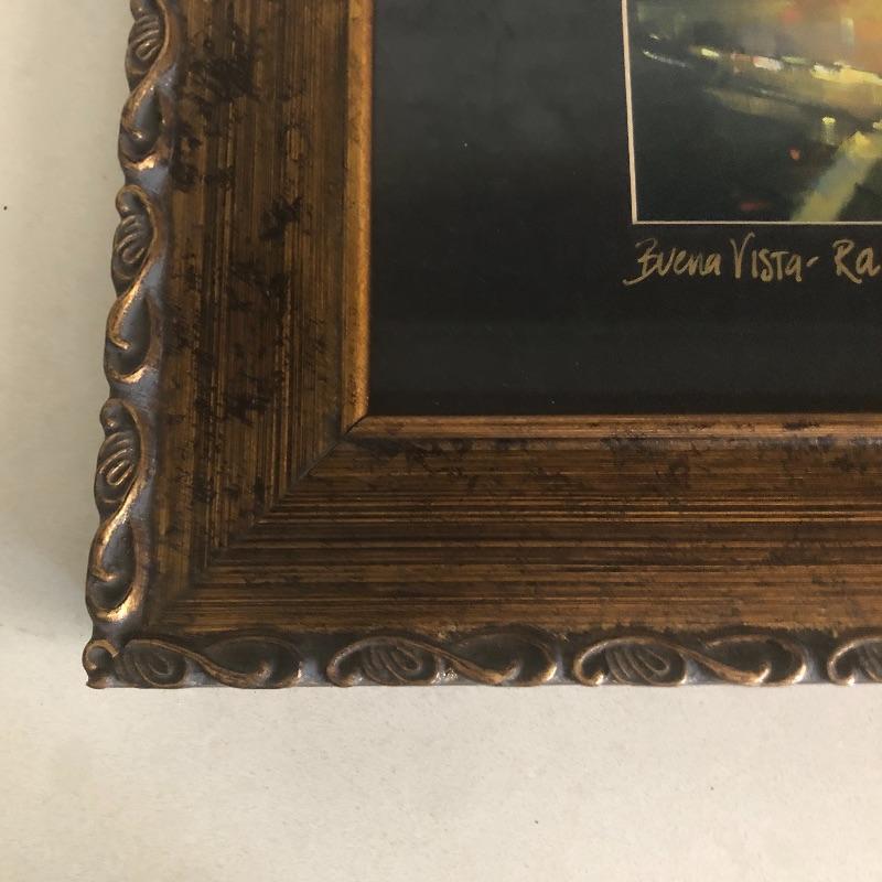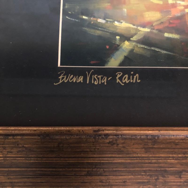 All 3 prints are mounted in similar styled aged bronzed colored frames. The largest frame measures 14.4” x 17.5” and is titled Buena Vista Rain and has an artist signature that is indecipherable. The two similarly themed prints compliment this trio well.