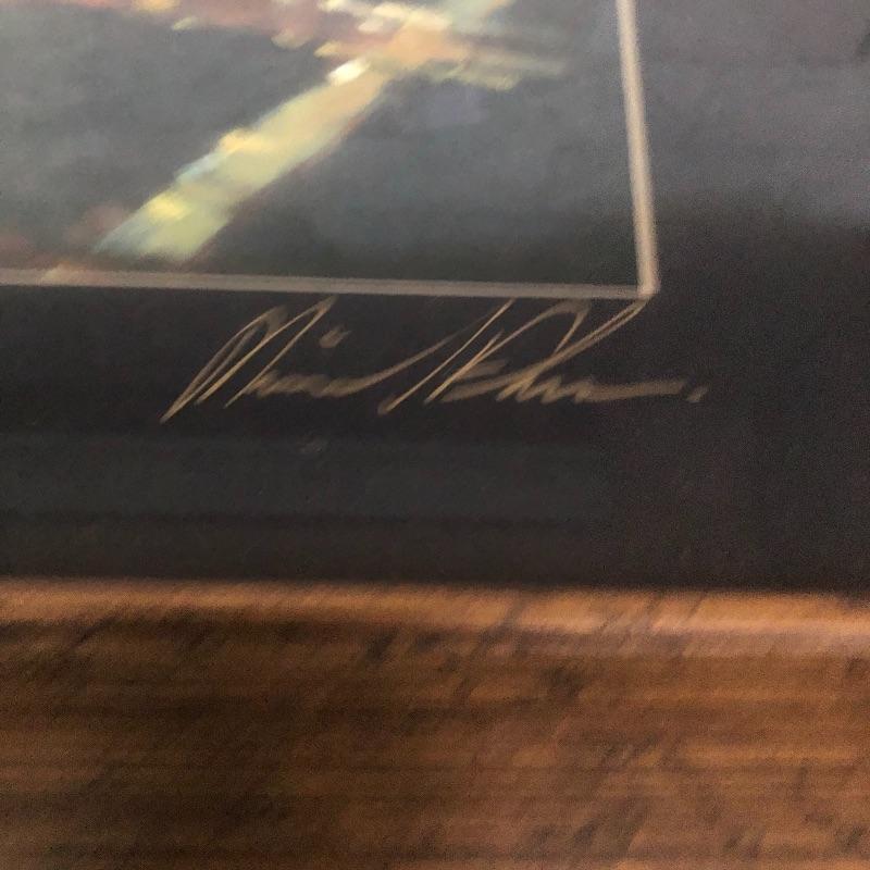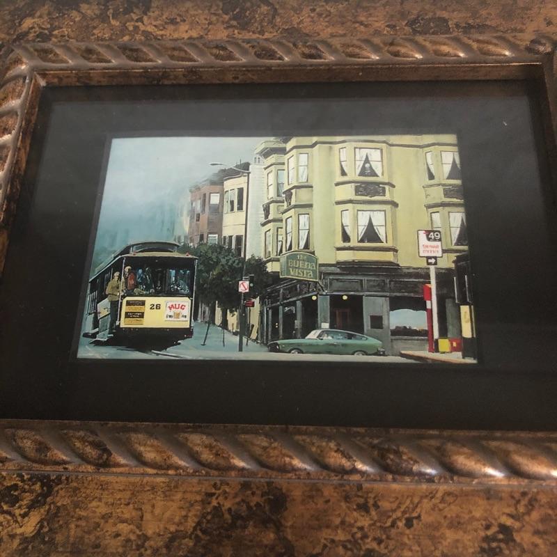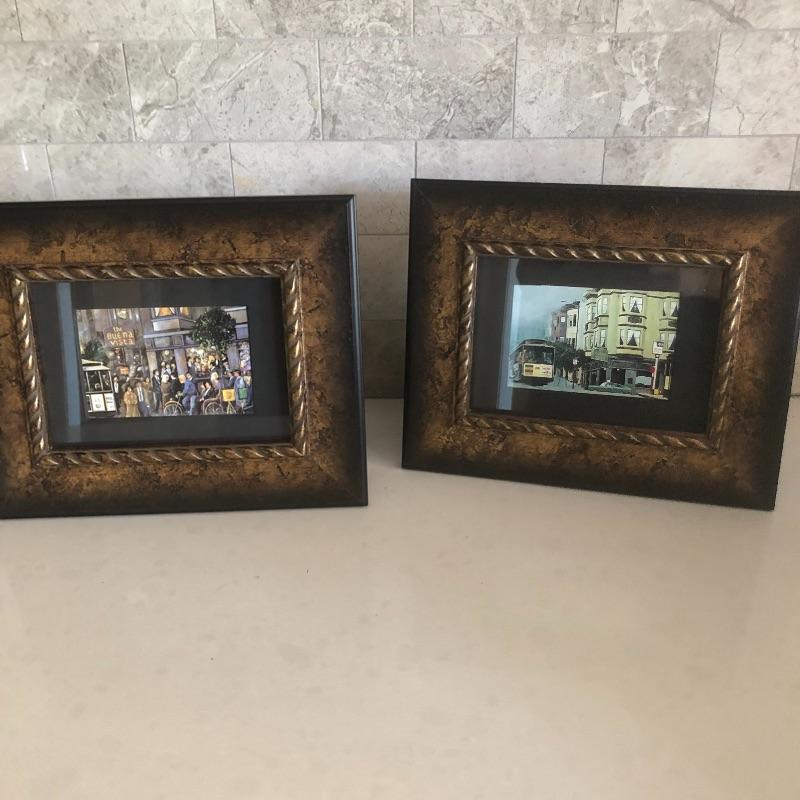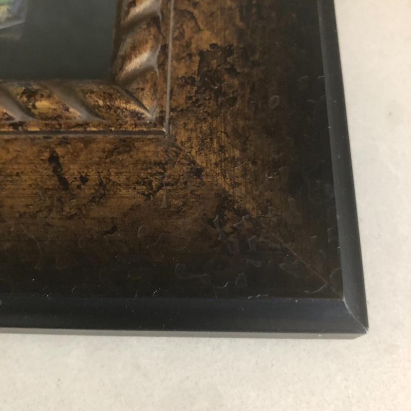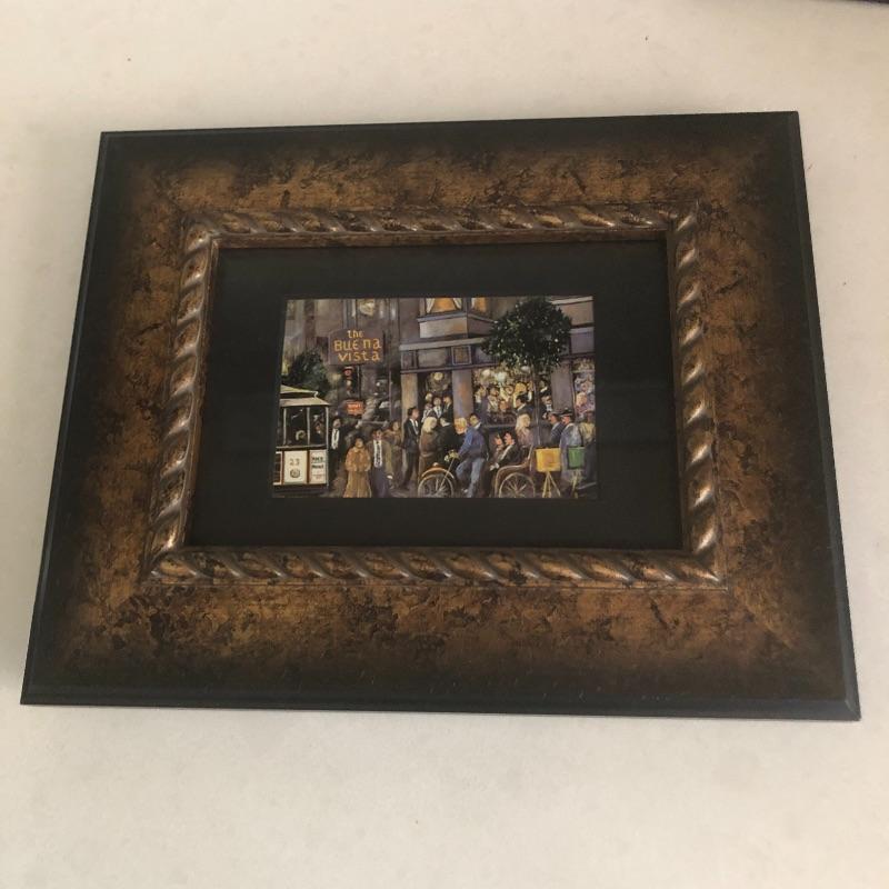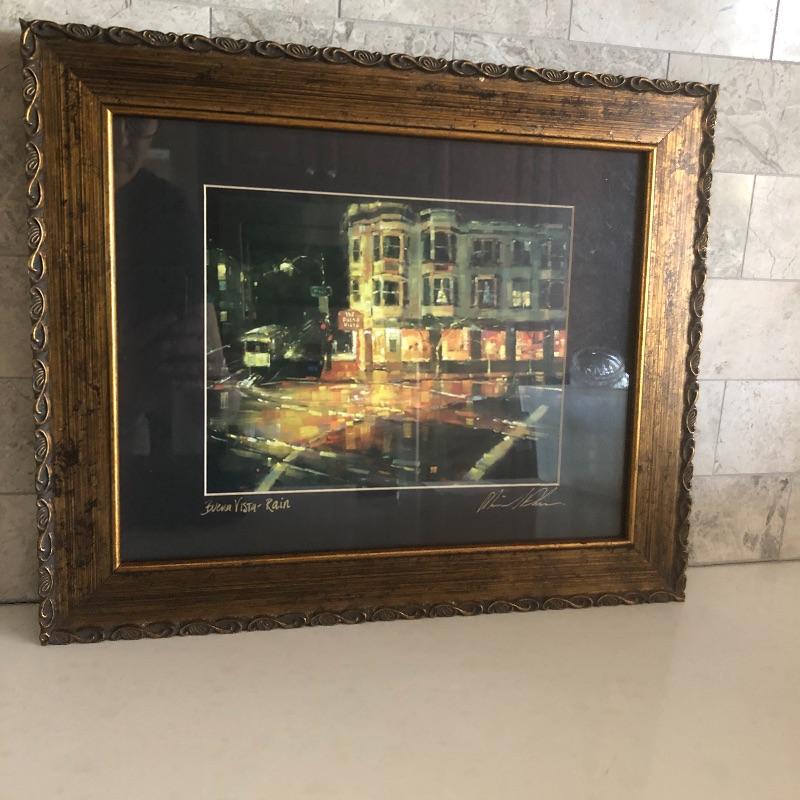 All 3 prints are mounted in similar styled aged bronzed colored frames. The largest frame measures 14.4” x 17.5” and is titled Buena Vista Rain and has an artist signature that is indecipherable. The two similarly themed prints compliment this trio well.