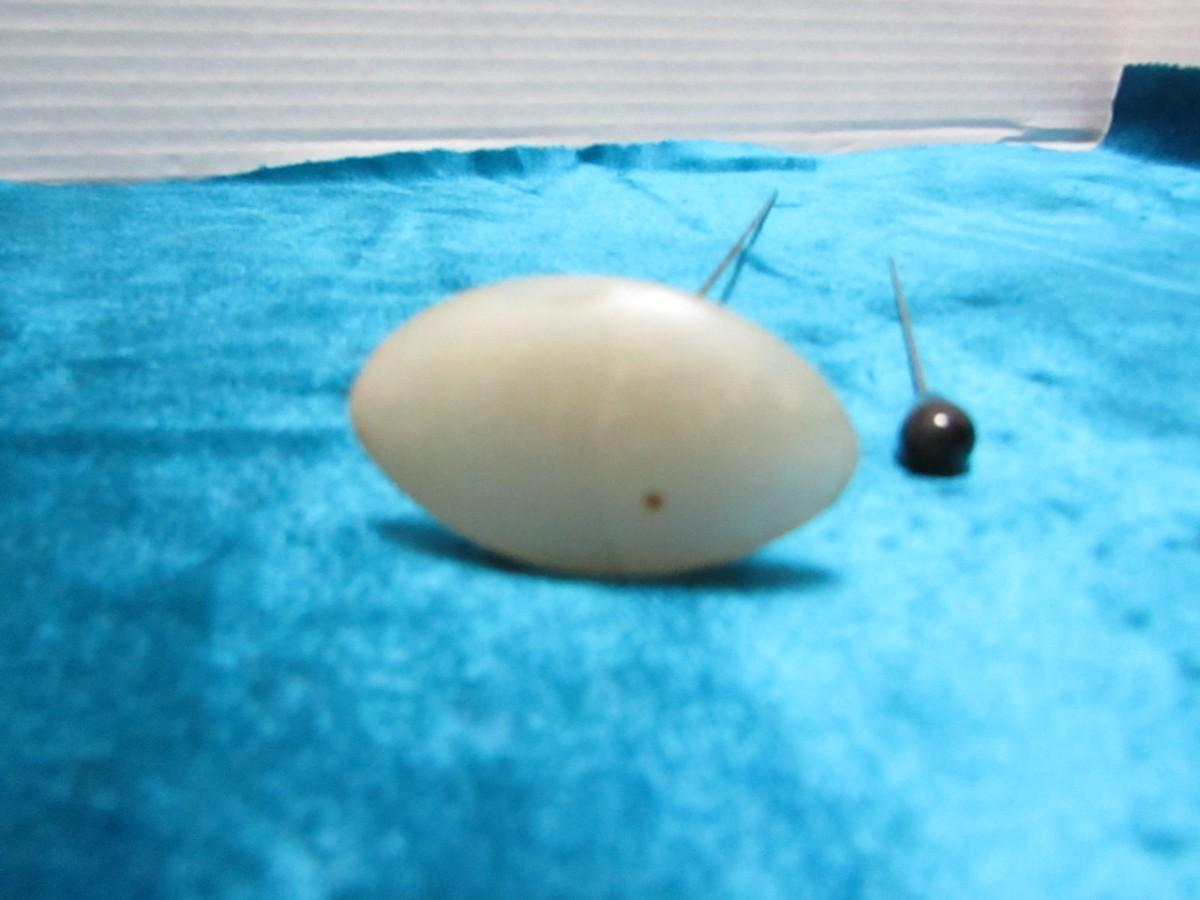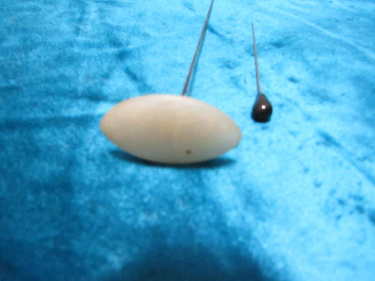 THE OVAL CELLULOID PIN IS APPROX 8.5" LONG AND IT DOES HAVE A HAIRLINE CRACK